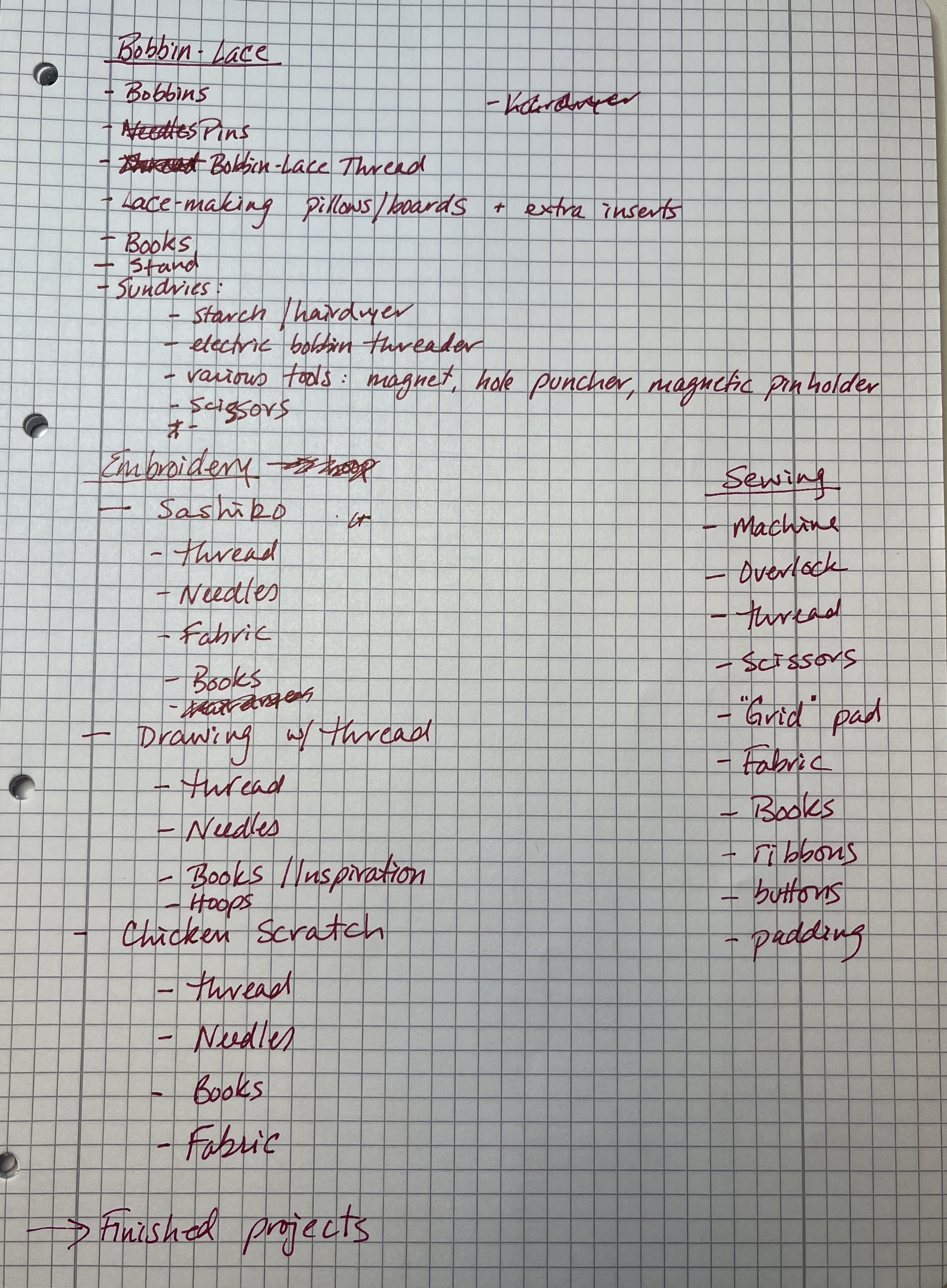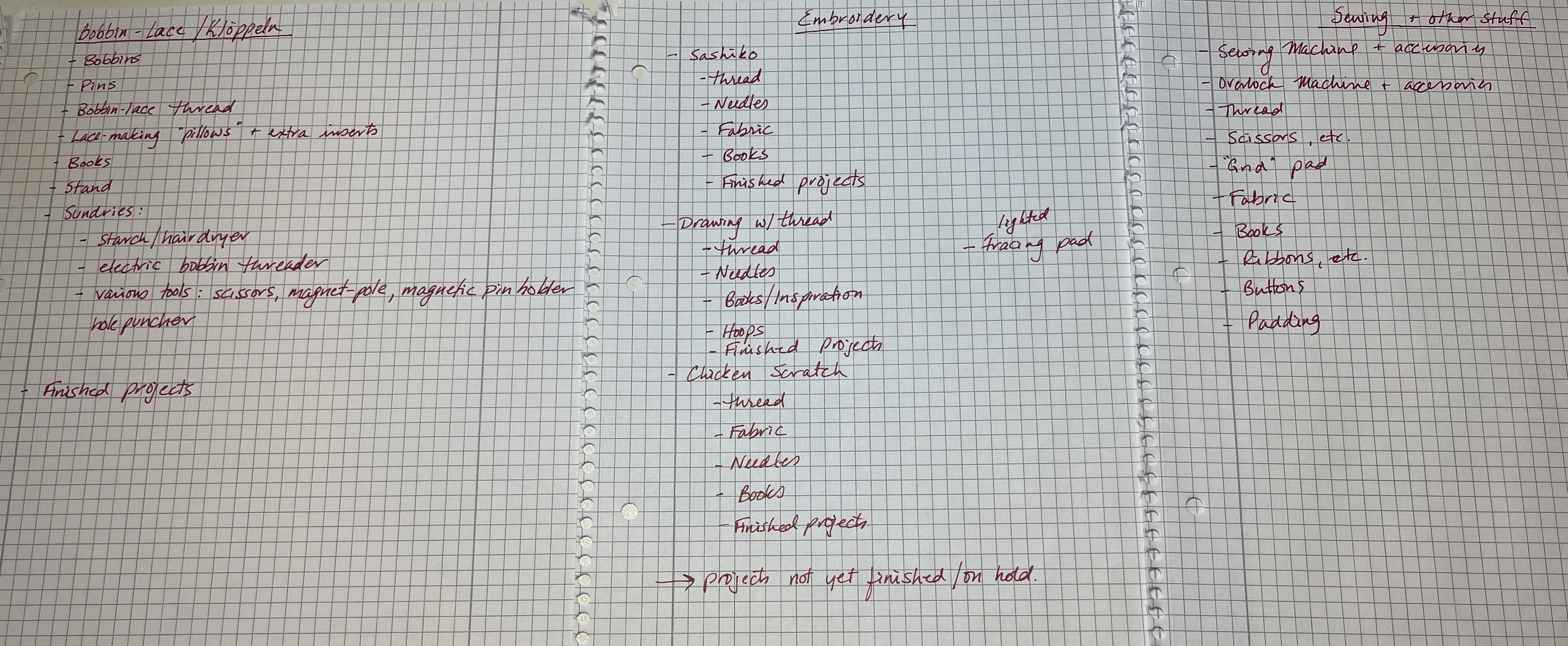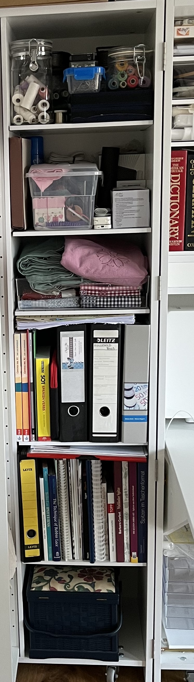 So, all those little scraps of fabric I had saved “just in case” – out. The various pictures ripped out of magazines, inspiration for future projects – out. Bobbin-lace books I had purchased with the best of intentions – out (I will see if I can sell these online). Fabric I had been gifted but never used (and know I will never use but didn’t want to hurt the giver’s feelings) – to be donated. In the end, I guess I removed about 20-30% of the overall content. Still not enough but enough for this first pass.