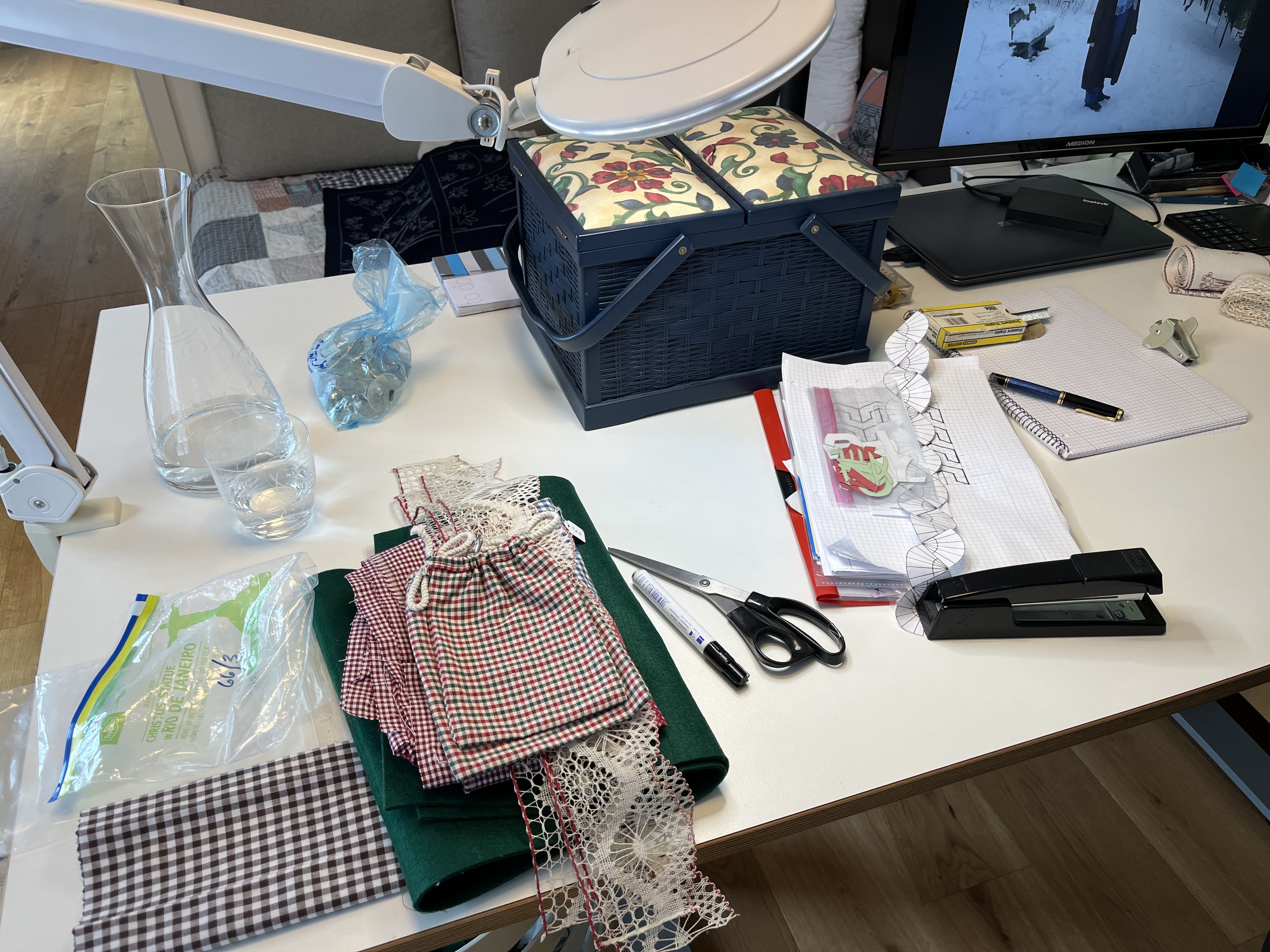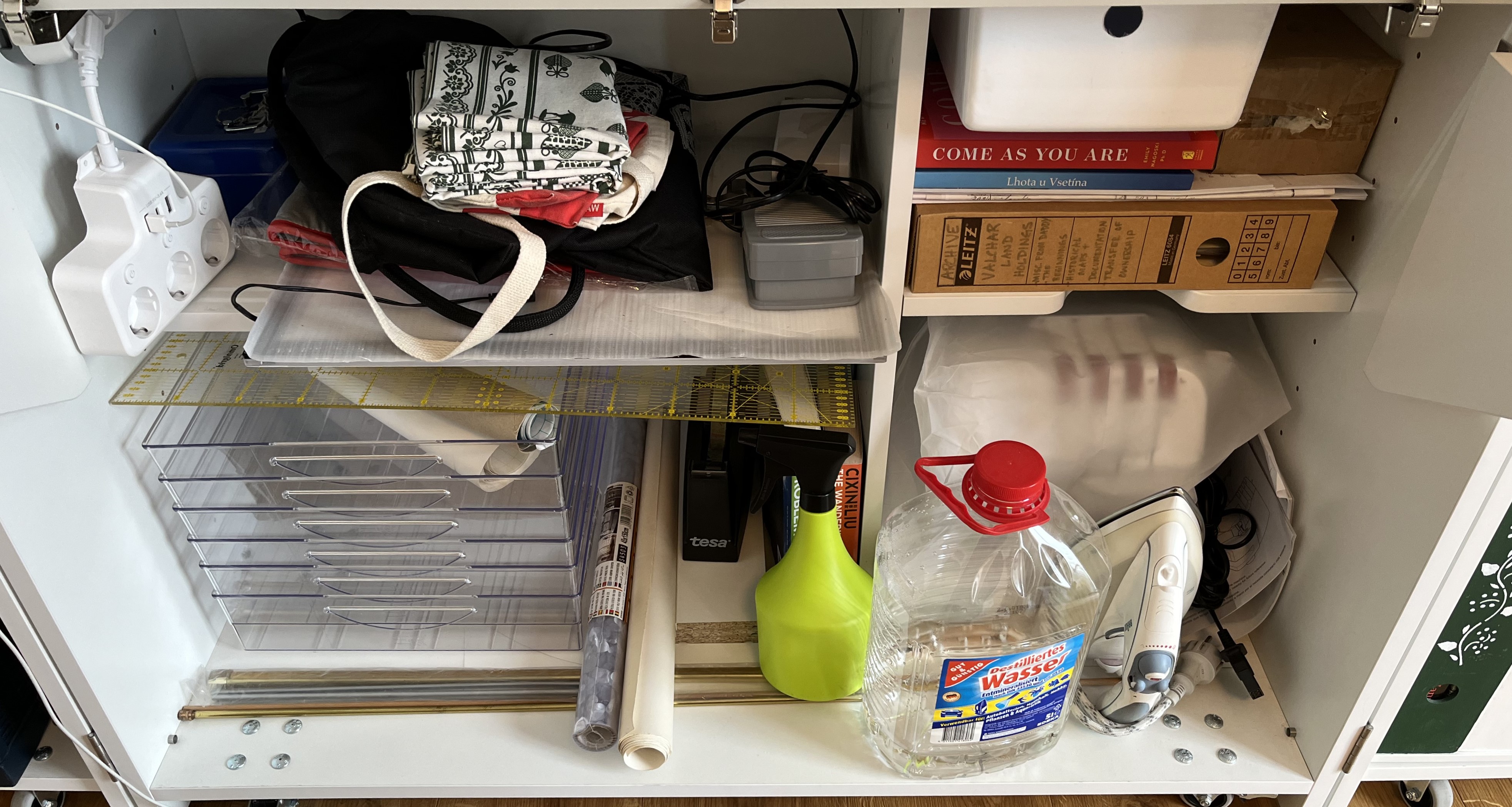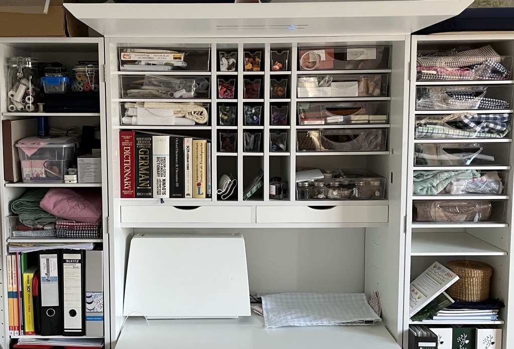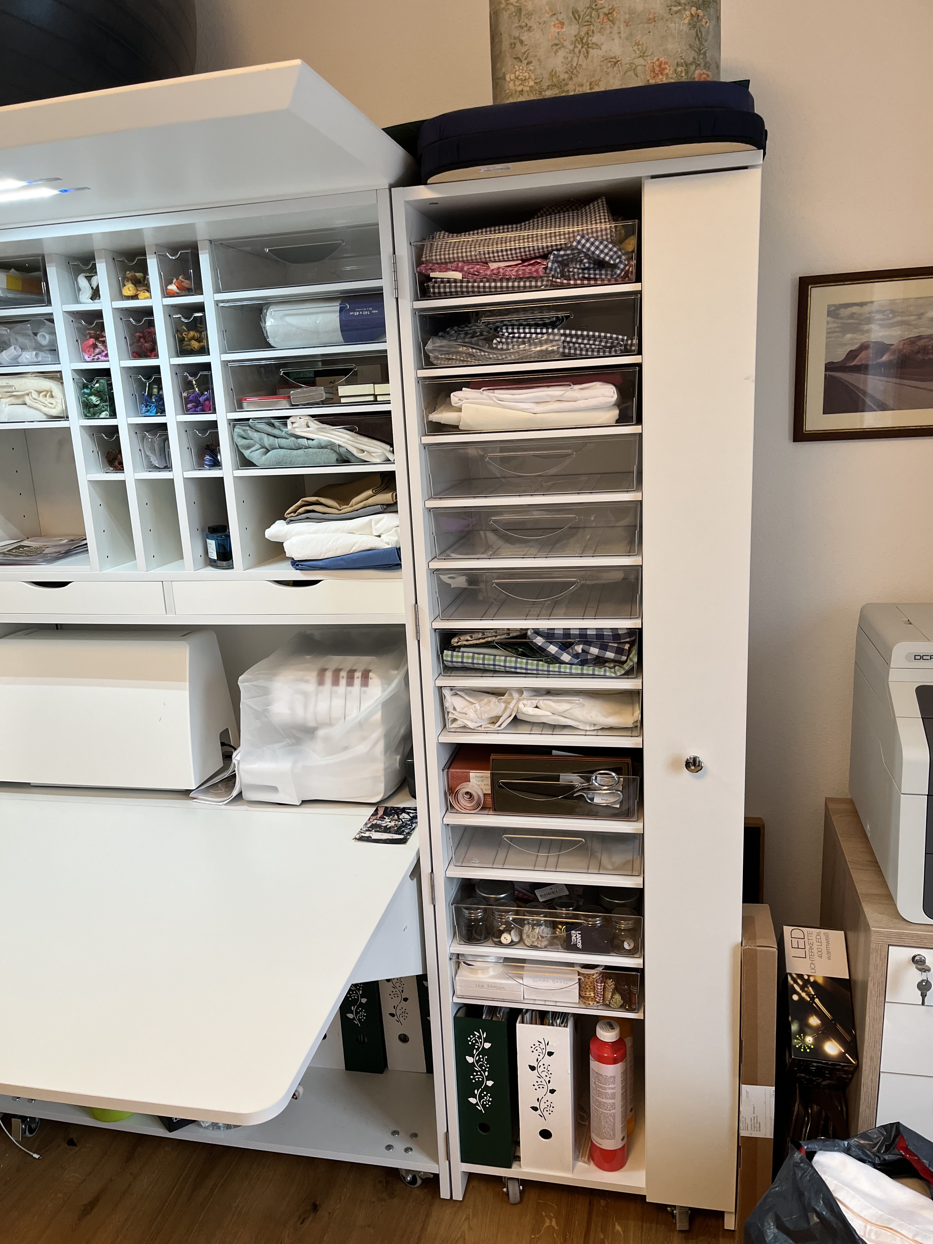 The big challenge now is to reorganize things (yet again) so that I can put the sewing machine and overlock below the pull-out desk. Right now the space is full of other stuff: