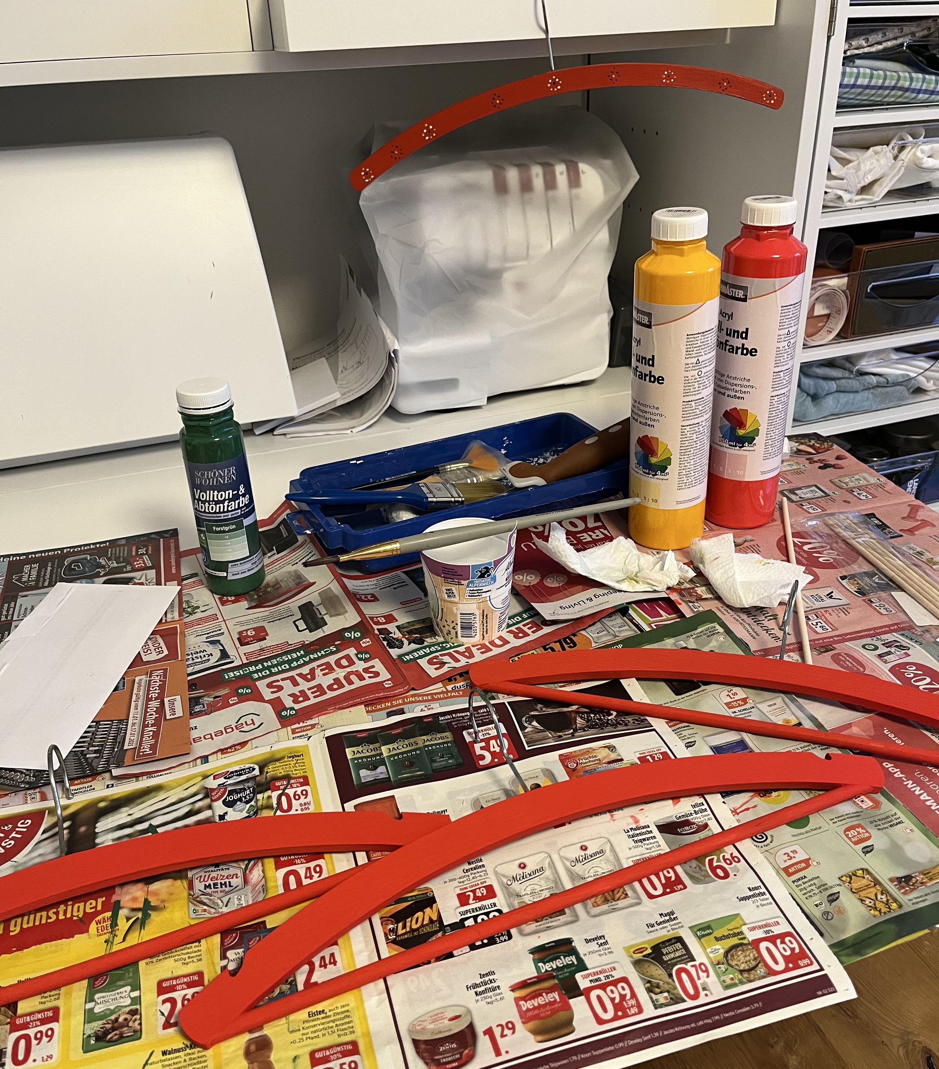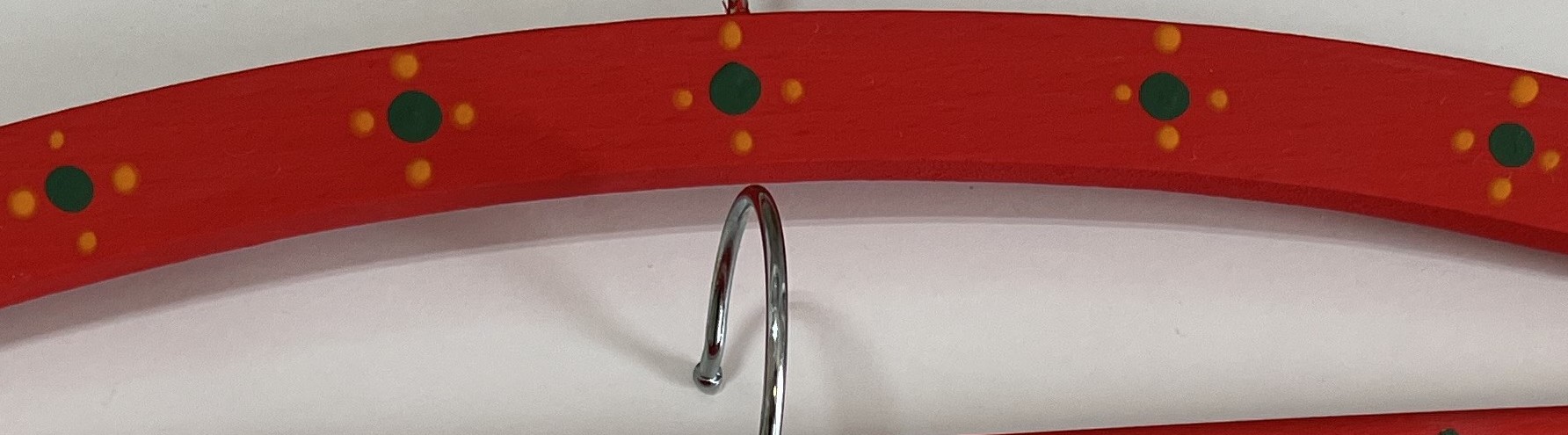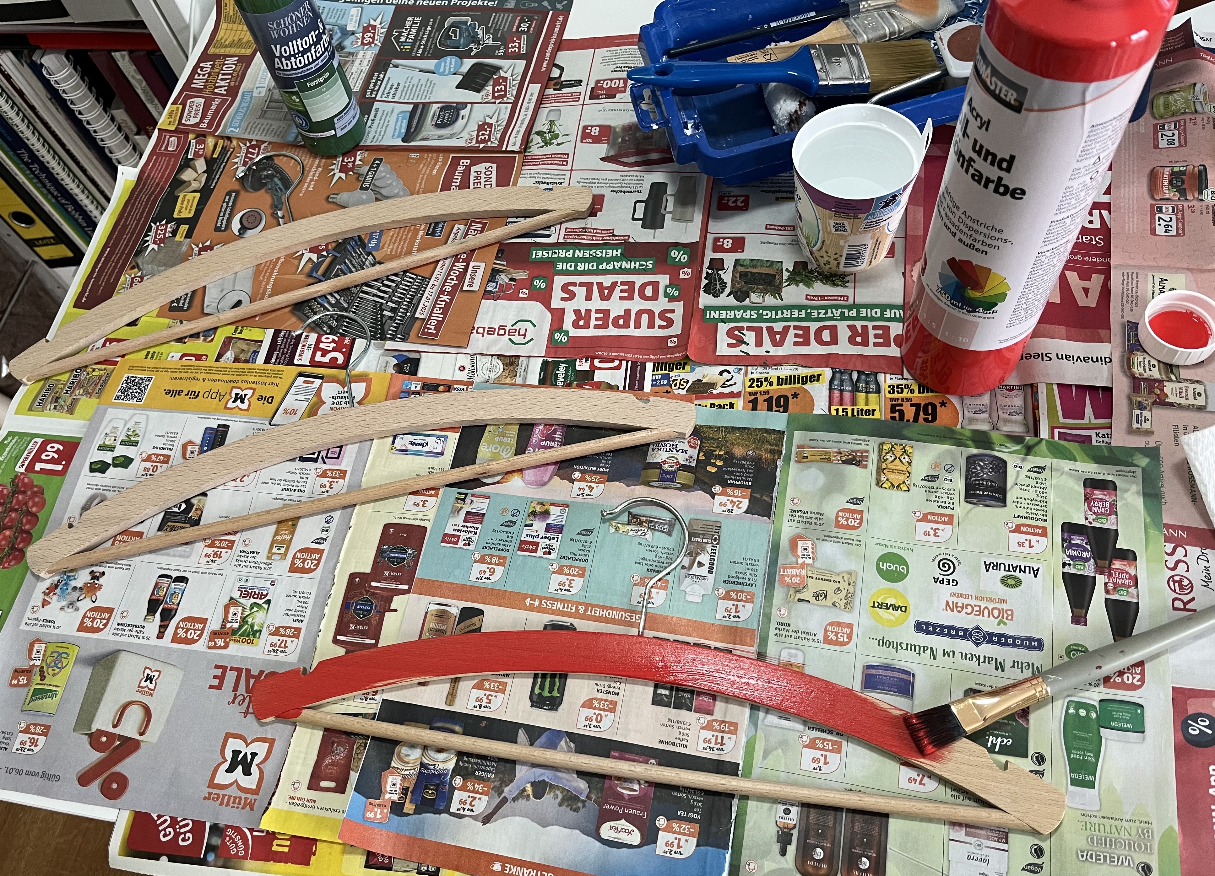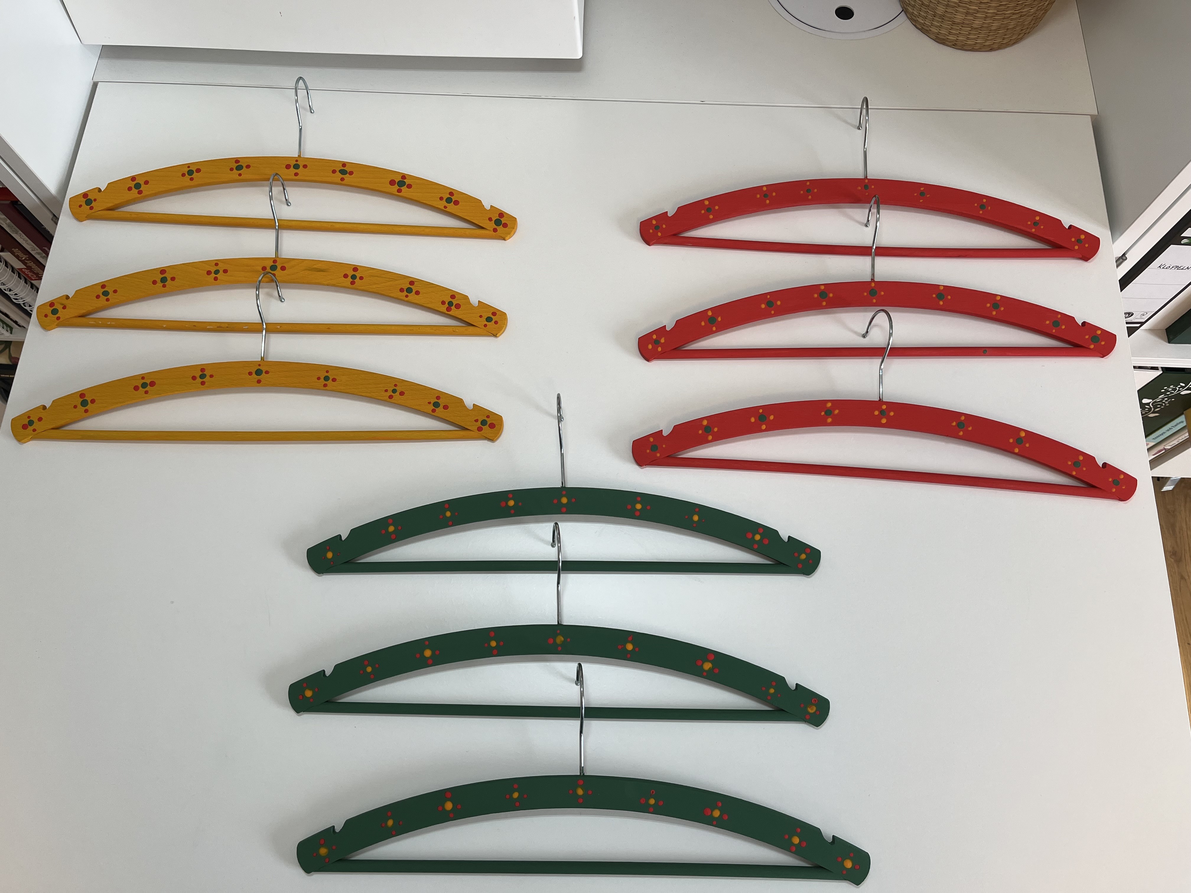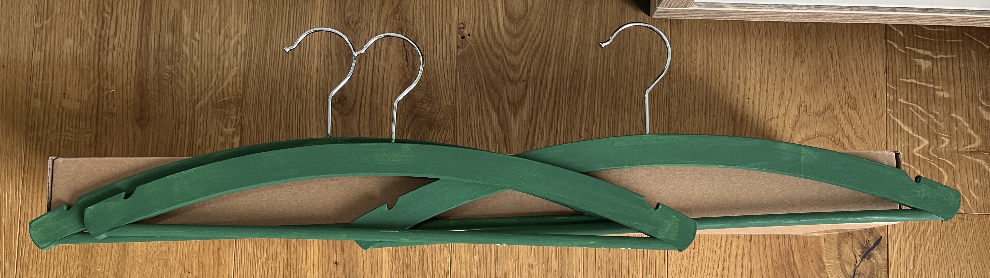One of the older hangers served as the design template. The new hangers have a different form from the old ones and we had no blue paint left. So, the new set of hangers looks different than the first batch – see below.