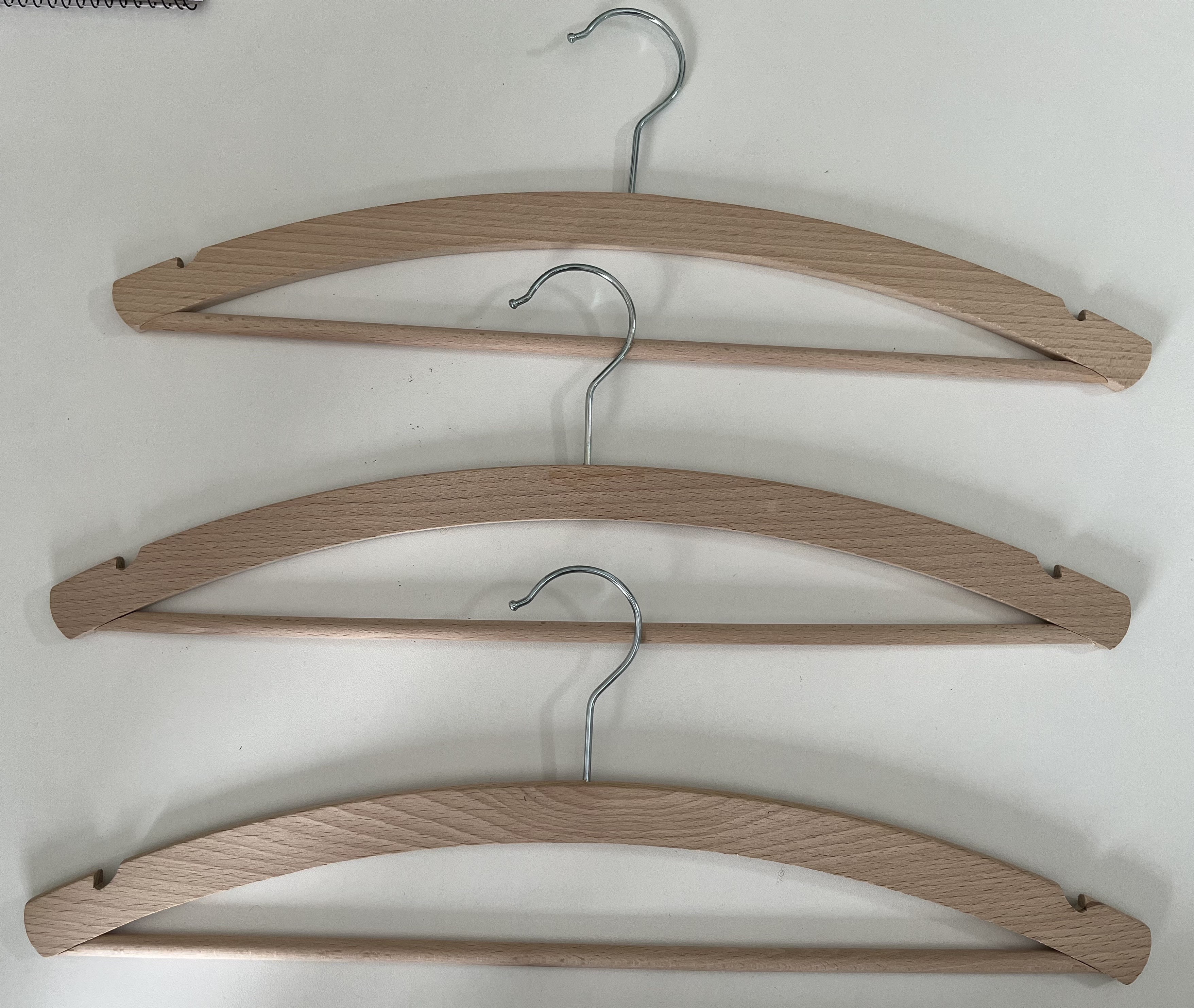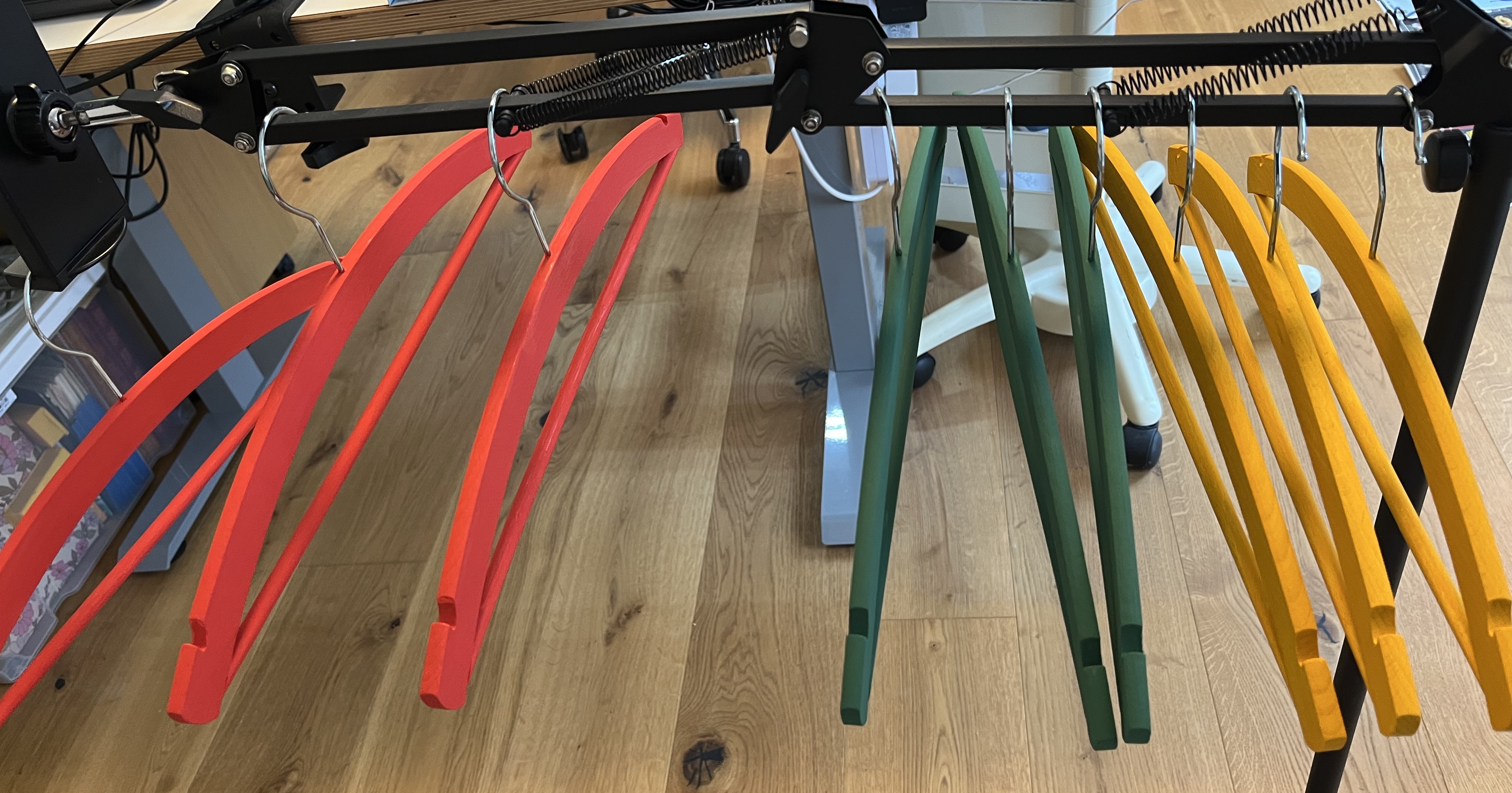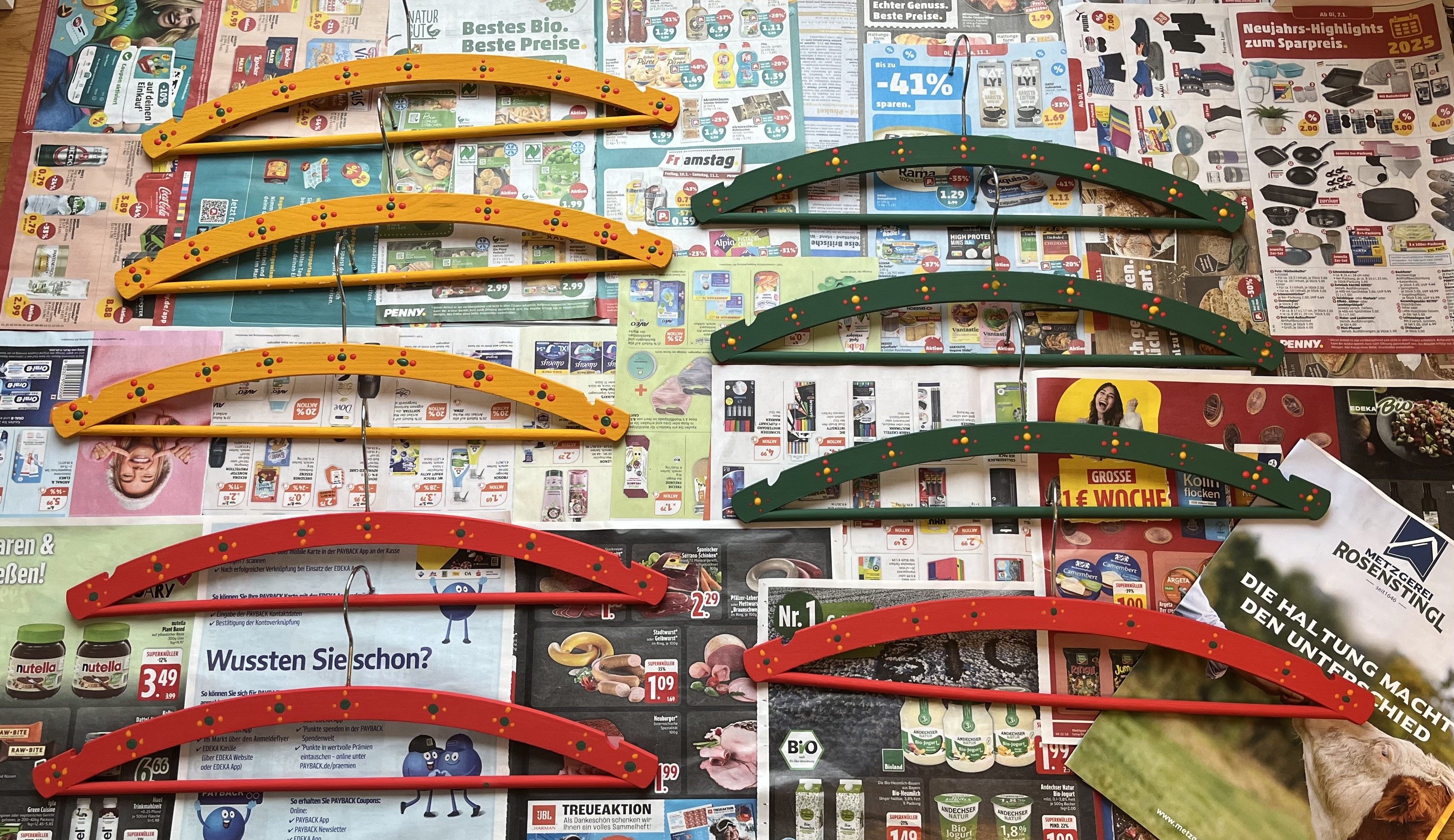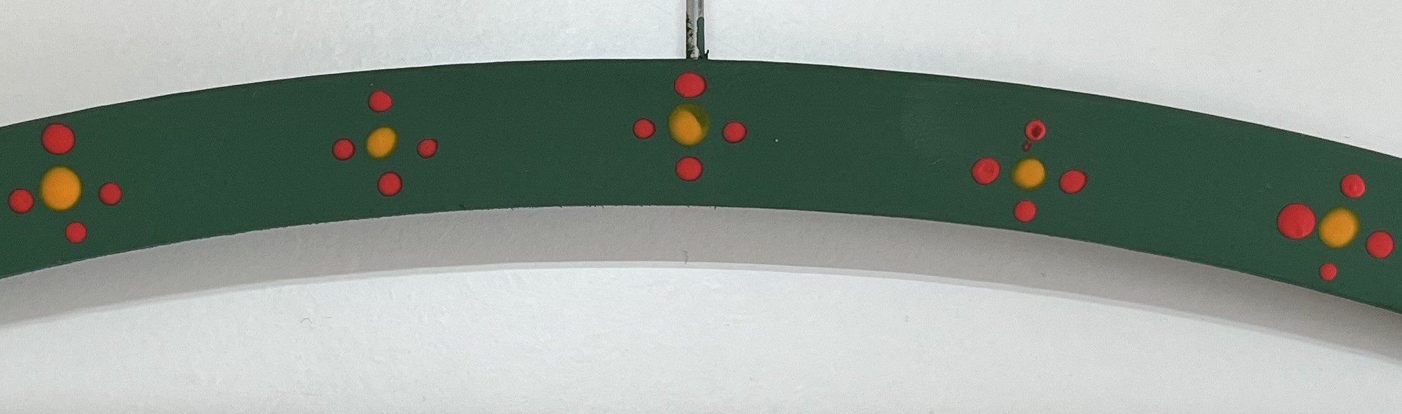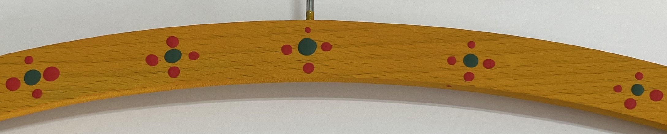 One of the older hangers served as the design template. The new hangers have a different form from the old ones and we had no blue paint left. So, the new set of hangers looks different than the first batch – see below.
