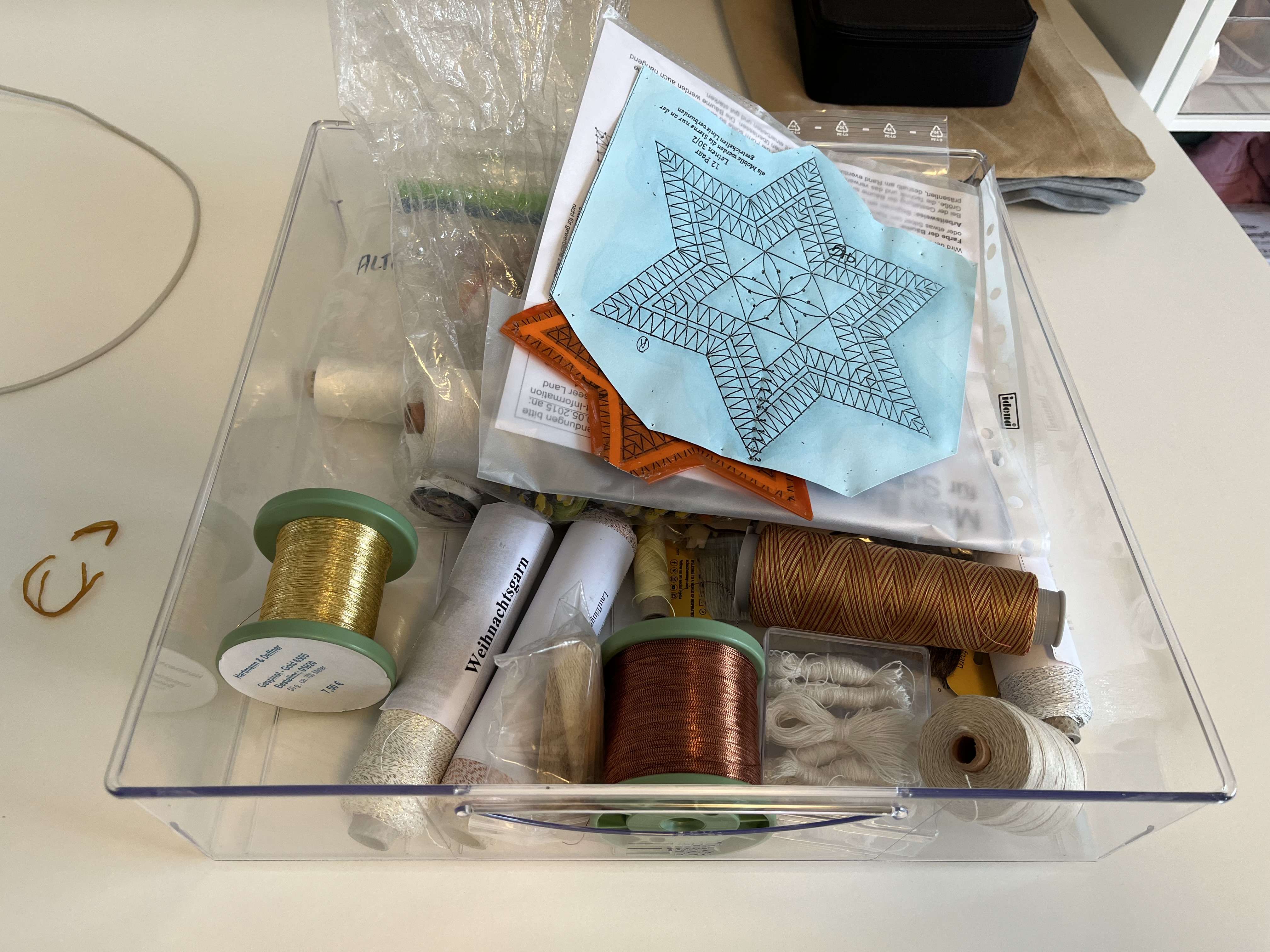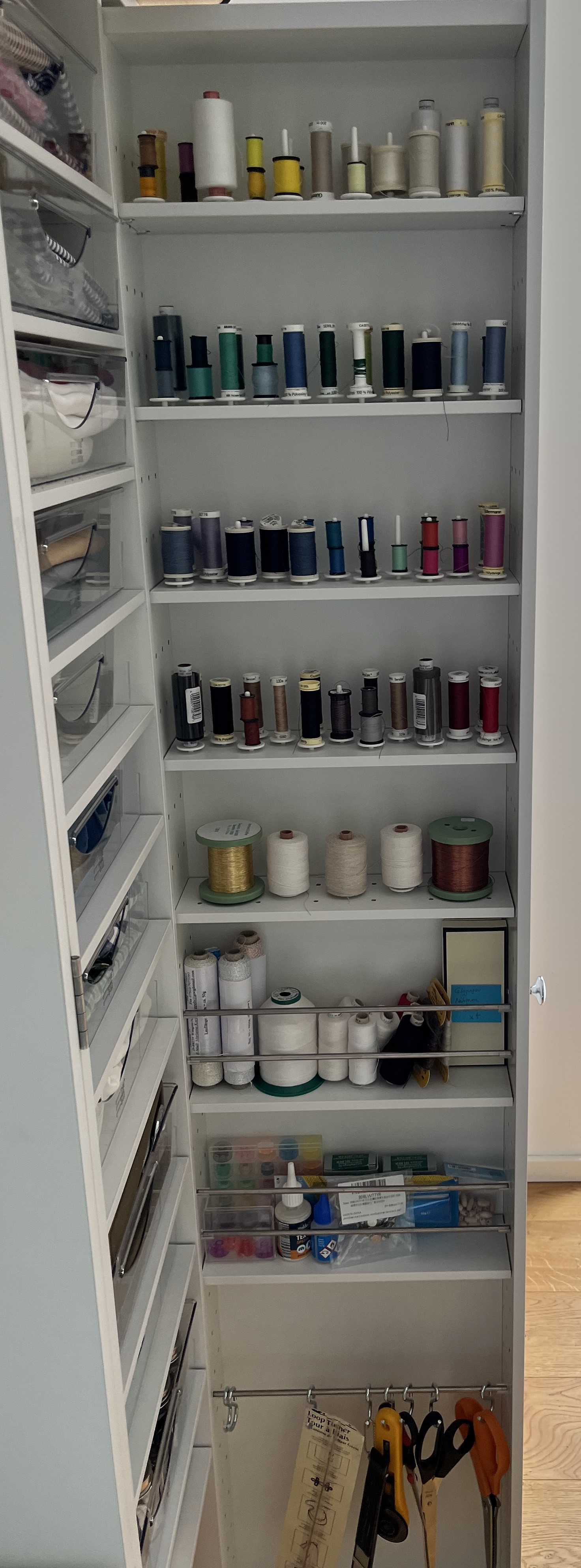 Initially, the idea was to create a specific section in the crafts closet for each individual craft. But, since all the crafts involved textiles of some sort, some items were common to all crafts, such things as: pins, needles, thread, scissors, books. So, this got me thinking, maybe I should organize the items by product category, so to speak. And then I realized, as so often happens in life: there is no binary, black/white solution to this question. A hybrid solution would be needed!