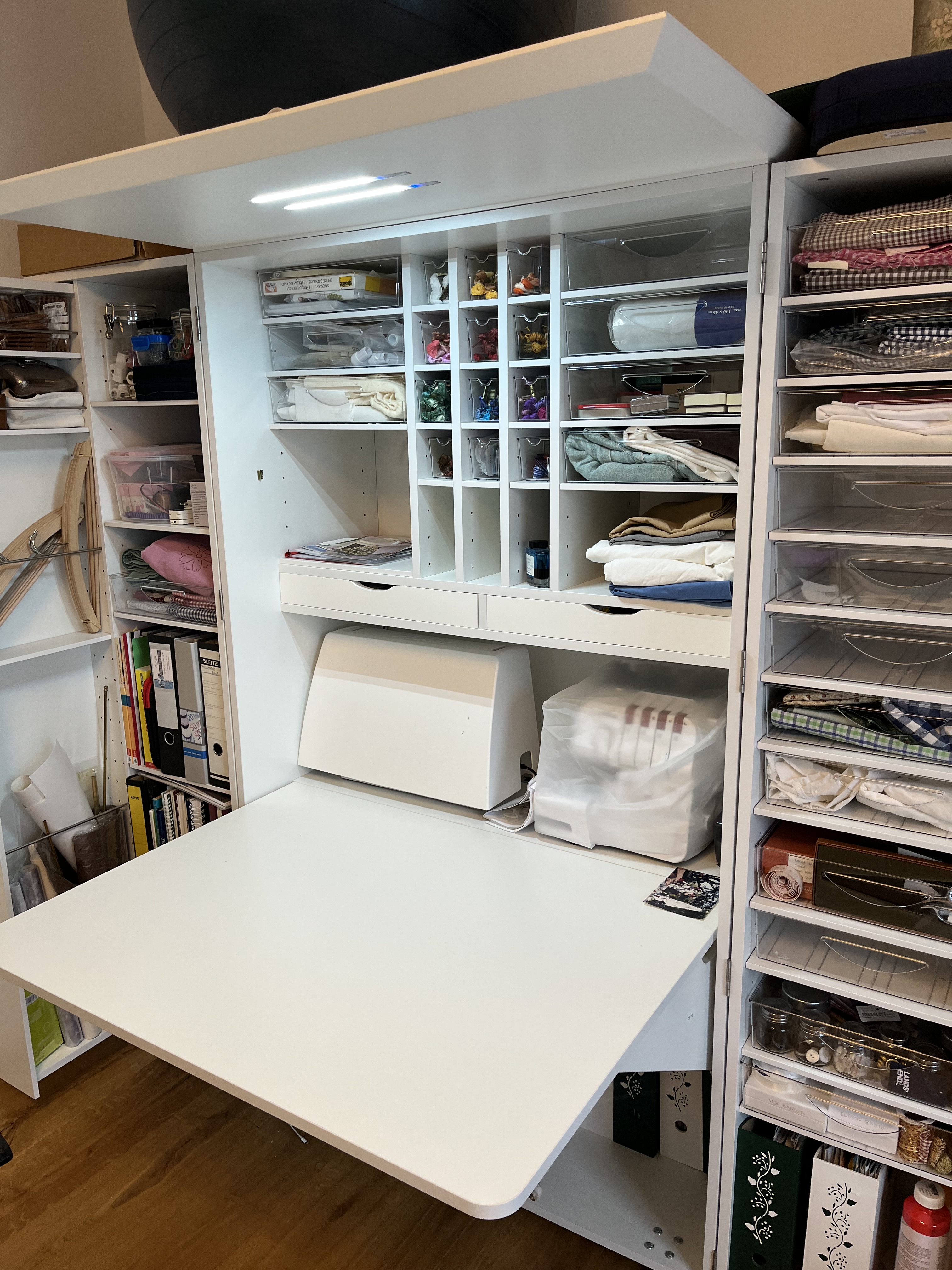 And, thanks to this space-saving way of storing fabric, 8 clear-plastic drawers, which are now stored under the pull-down desk, were no longer needed.