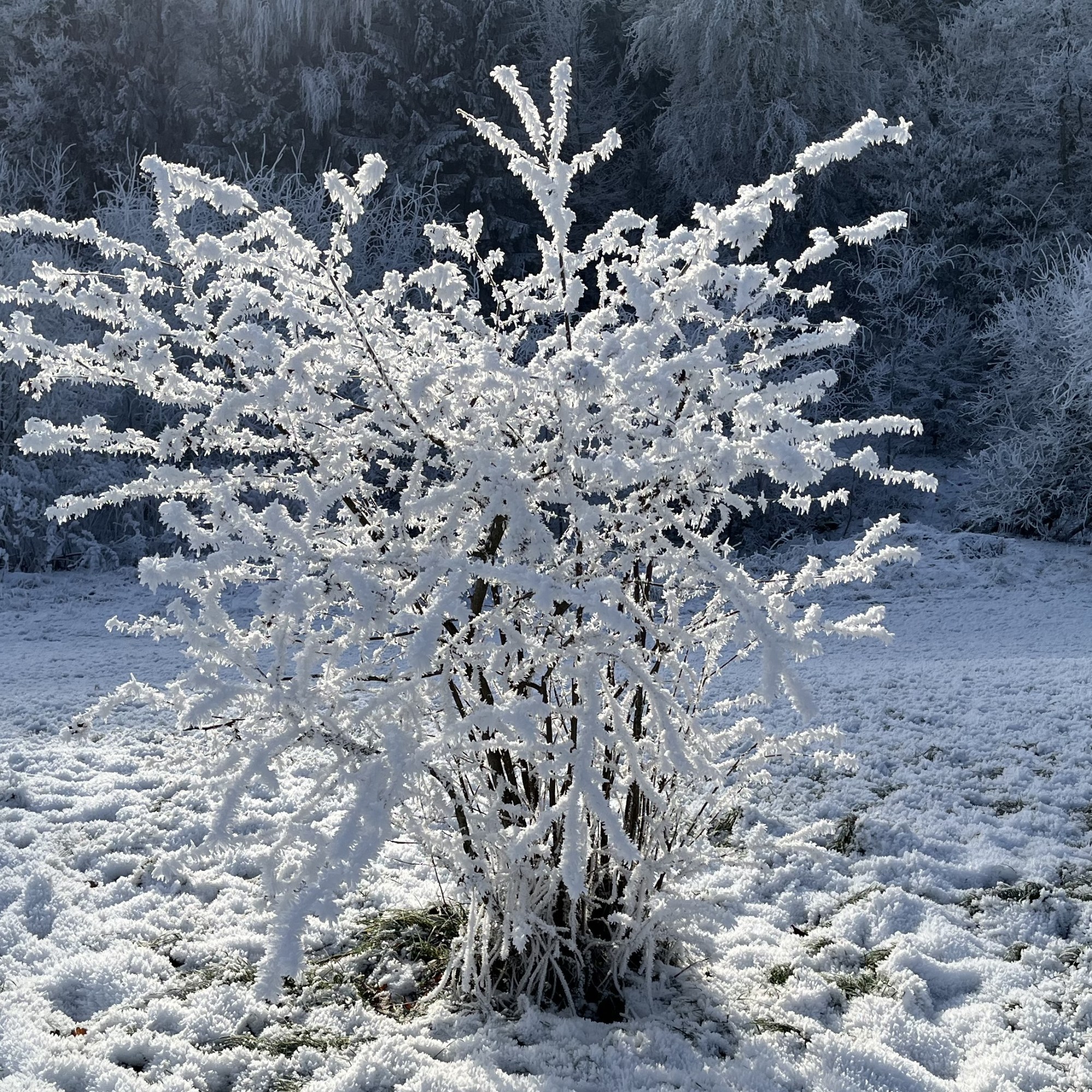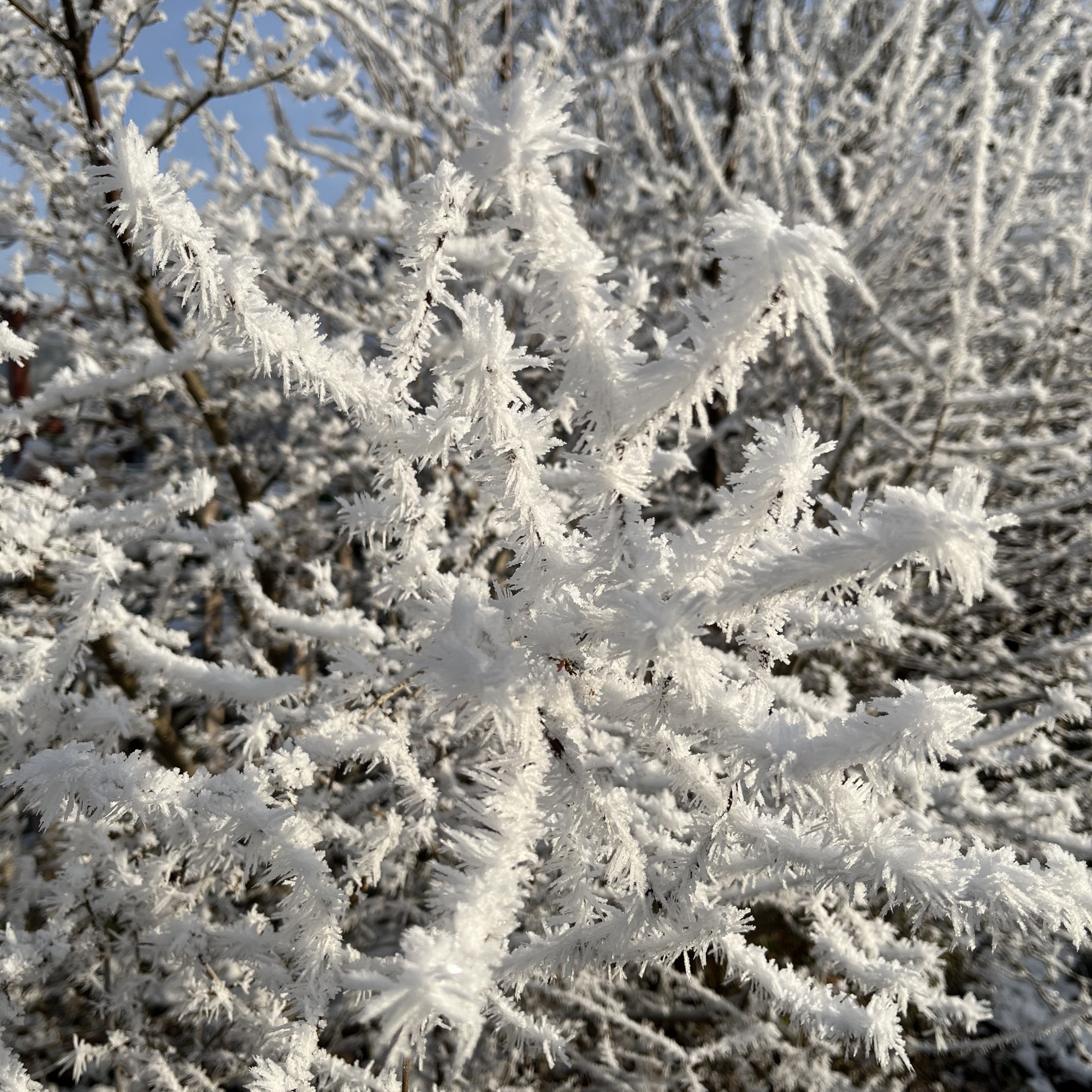 In the photo above right, you can see how the hoarfrost grows on the Christmas lights – the little bulbs have little hoarfrost “blossoms”! I mean really, when the winter world looks so pretty with hoarfrost, who needs the snow?