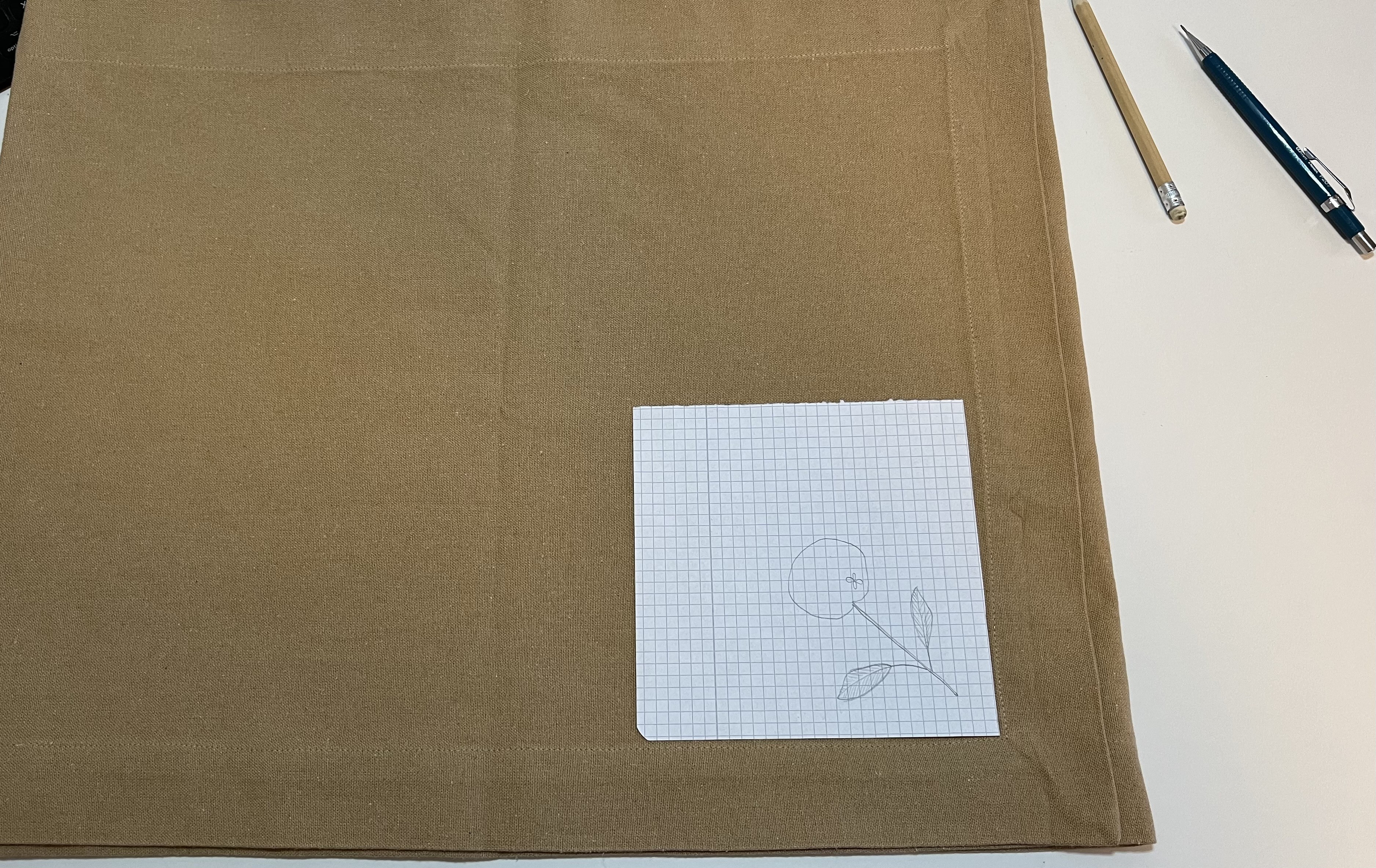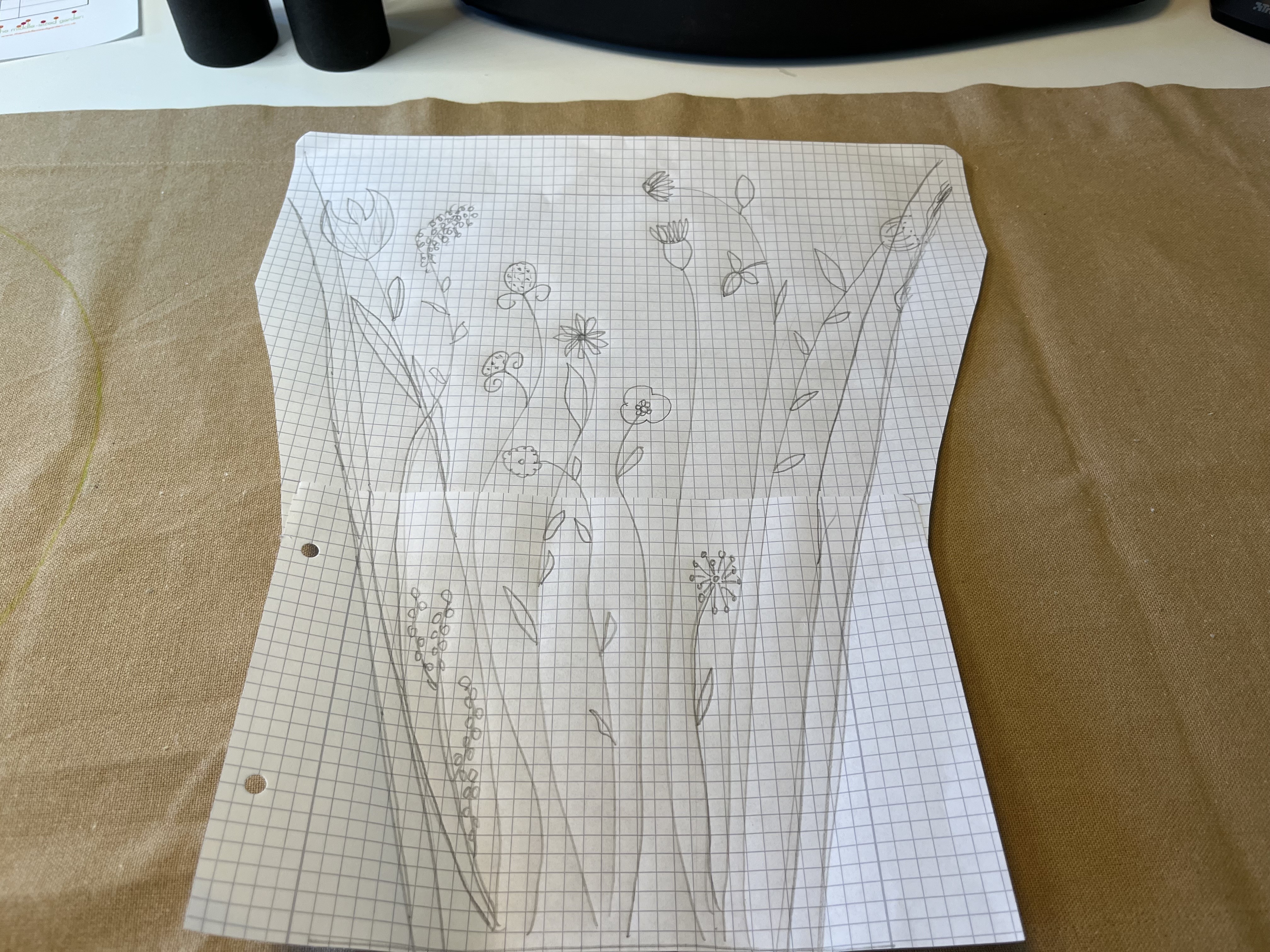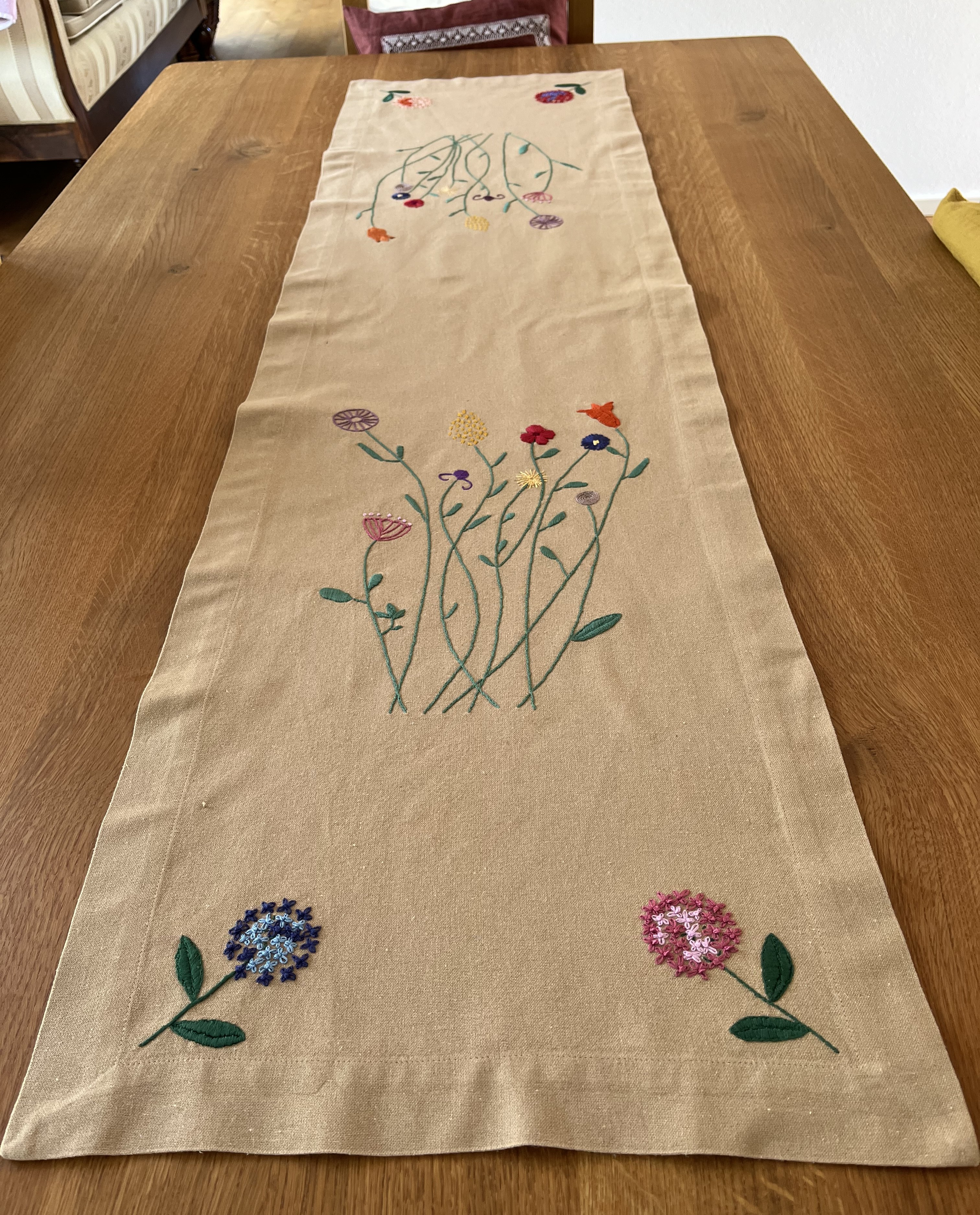 In the meantime, I have been working on the TRP (Table Runner Project). It took me a while to decide what to do with the table runner. Given that I had already started with a floral design, a sashiko design or an abstract/geometric design probably wouldn’t have worked. My first idea was to create a circle in the middle of the runner, a clearly separated space, for a second floral design. I am still kind of toying with that idea – possibly using the same floral design in the corners somehow.