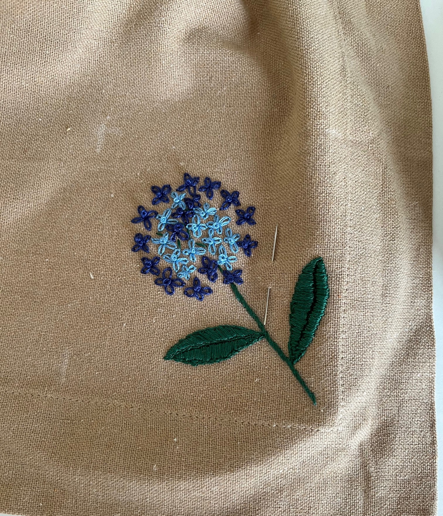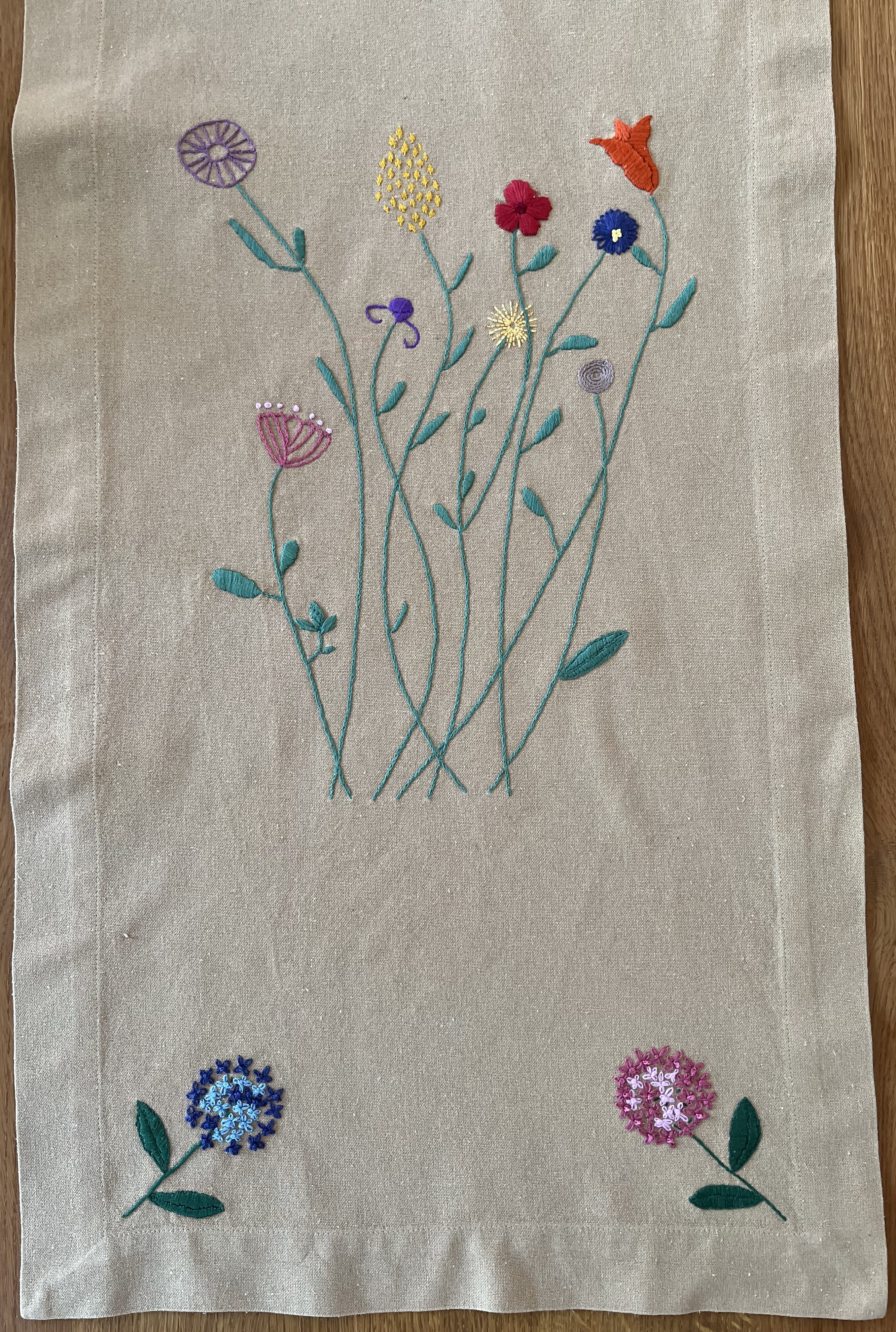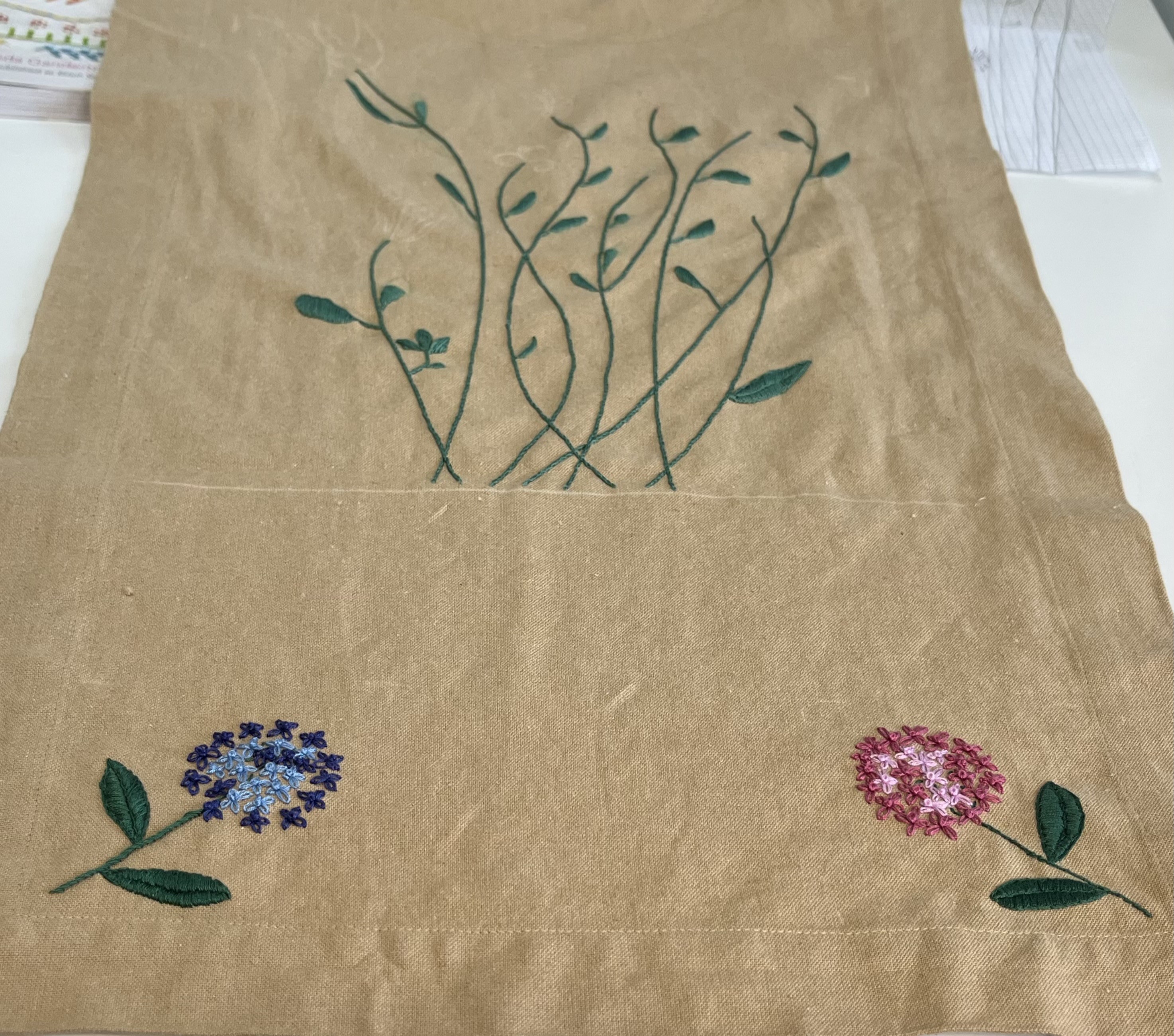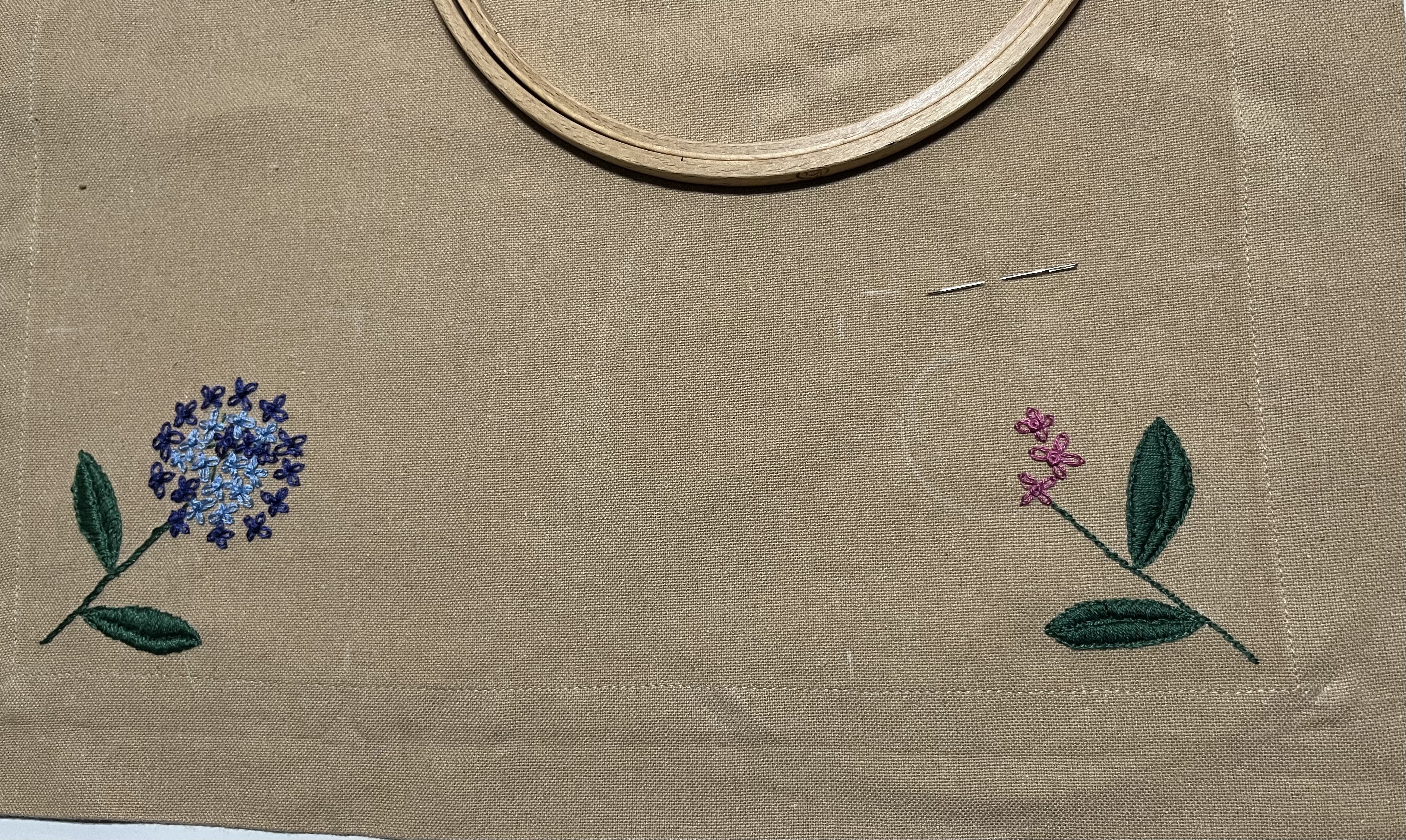 But, how to implement it? What direction should the flowers “grow”? Depending on what side of the table you were sitting at, the blossoms might be looking at or away from you. That could look kind of stupid. And, this is where my lack of an artist’s eye is a real handicap. I can imagine roughly how something might look but not precisely enough to know if it will look good or not; I just have to try it out and see. I guess if I could draw well, I could draw a design out fully and decide. But, my skill isn’t that developed. I just have to embroider it how I plan it and hope for the best. Believe me, because of this approach, I have quite the collection of failed embroidery projects – projects that didn’t work out but I can’t bring myself to throw them out.