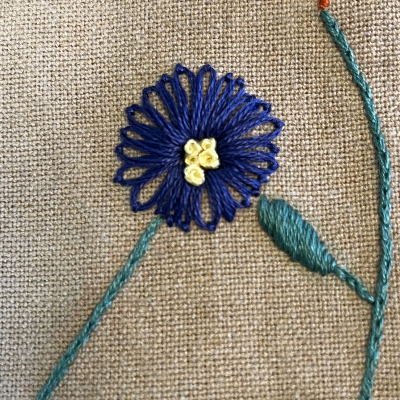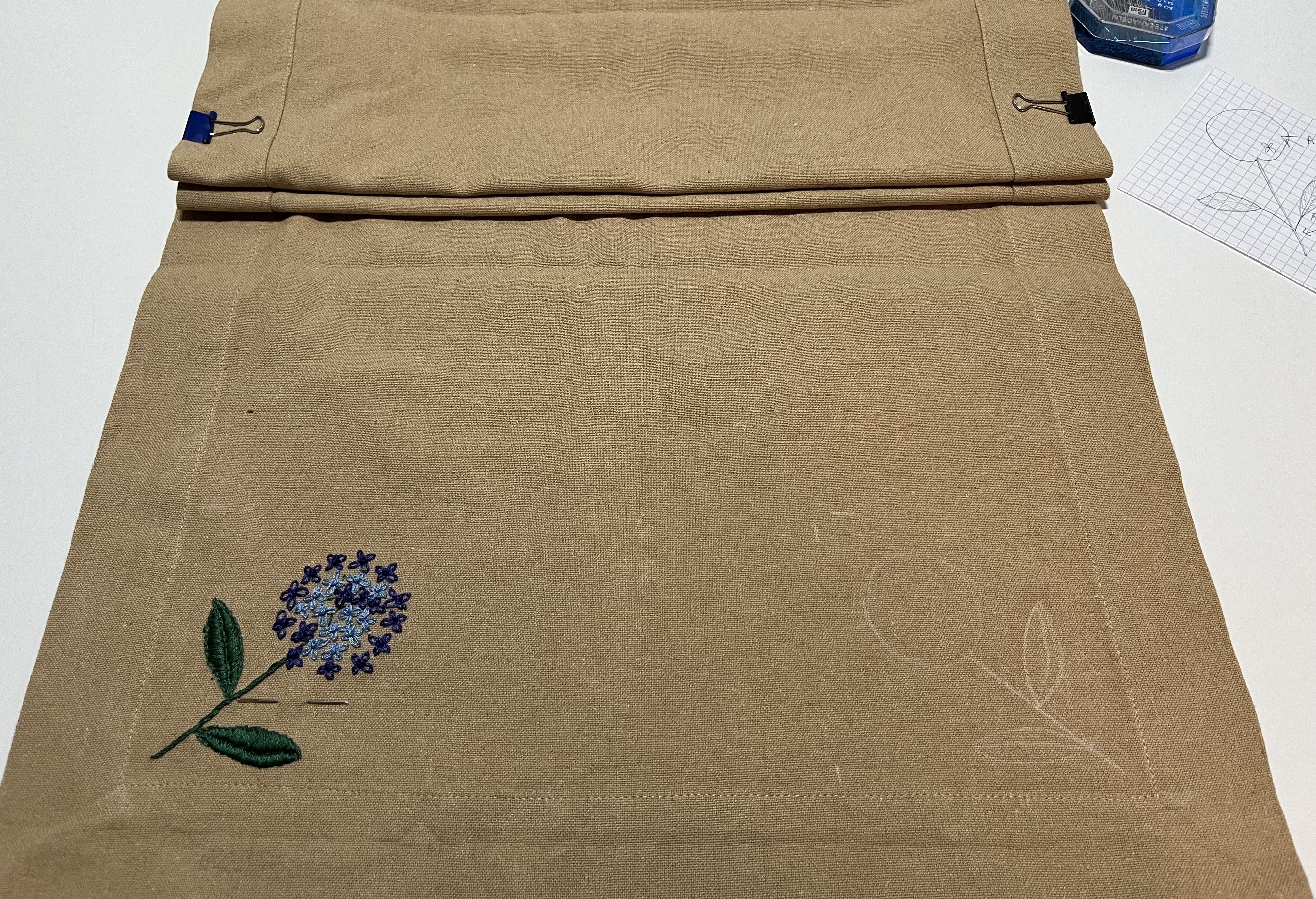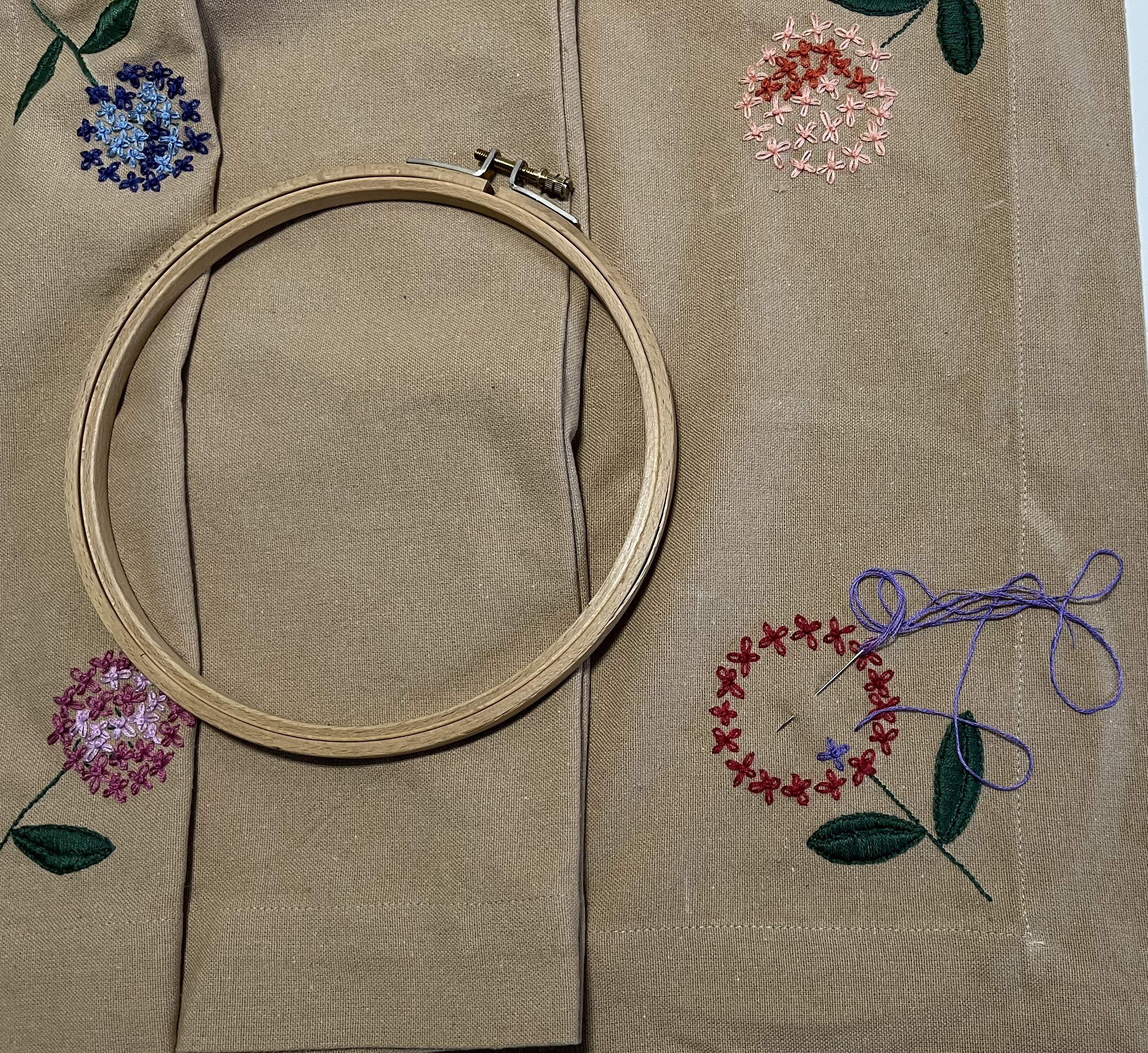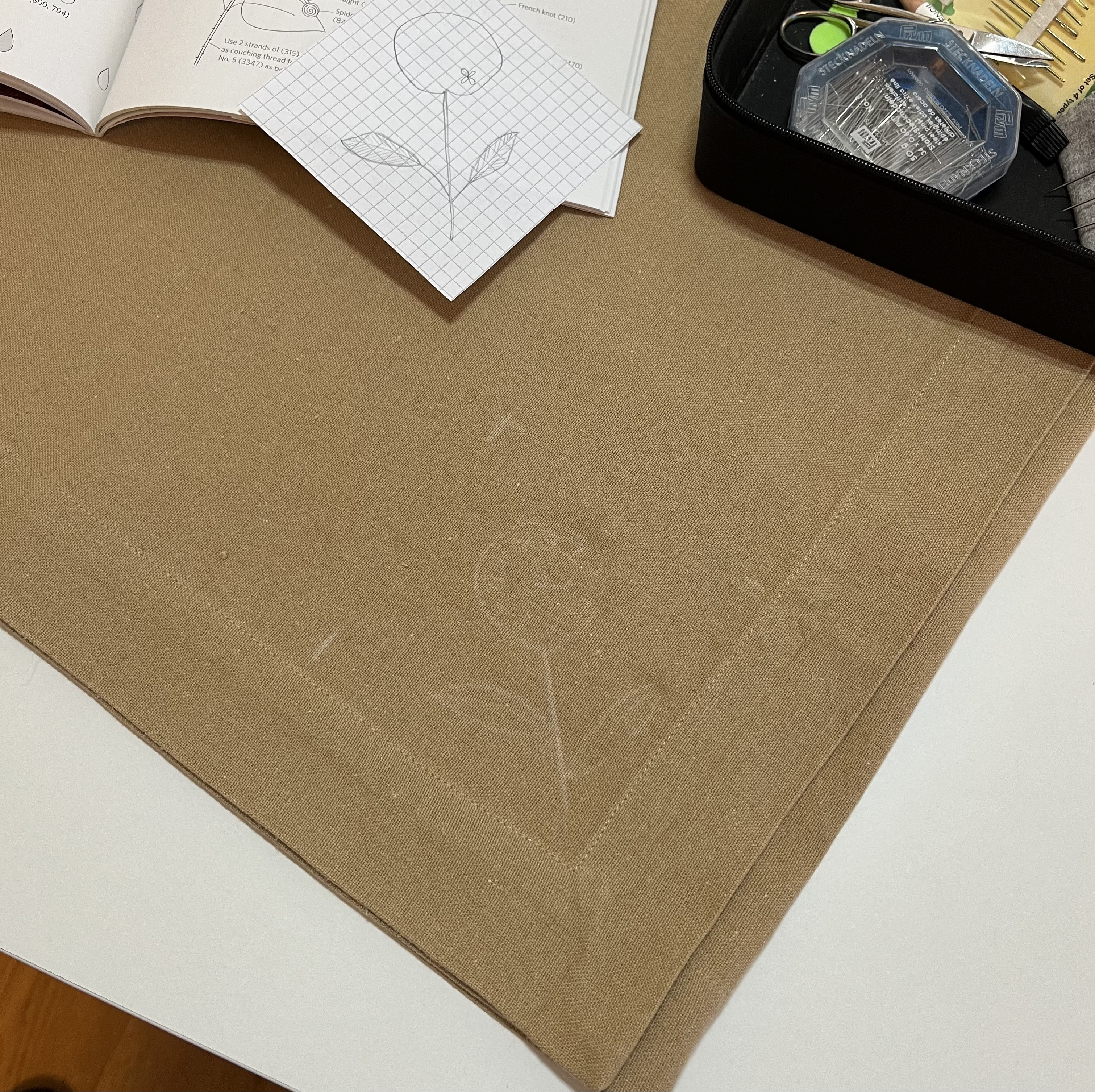 But, how to implement it? What direction should the flowers “grow”? Depending on what side of the table you were sitting at, the blossoms might be looking at or away from you. That could look kind of stupid. And, this is where my lack of an artist’s eye is a real handicap. I can imagine roughly how something might look but not precisely enough to know if it will look good or not; I just have to try it out and see. I guess if I could draw well, I could draw a design out fully and decide. But, my skill isn’t that developed. I just have to embroider it how I plan it and hope for the best. Believe me, because of this approach, I have quite the collection of failed embroidery projects – projects that didn’t work out but I can’t bring myself to throw them out.