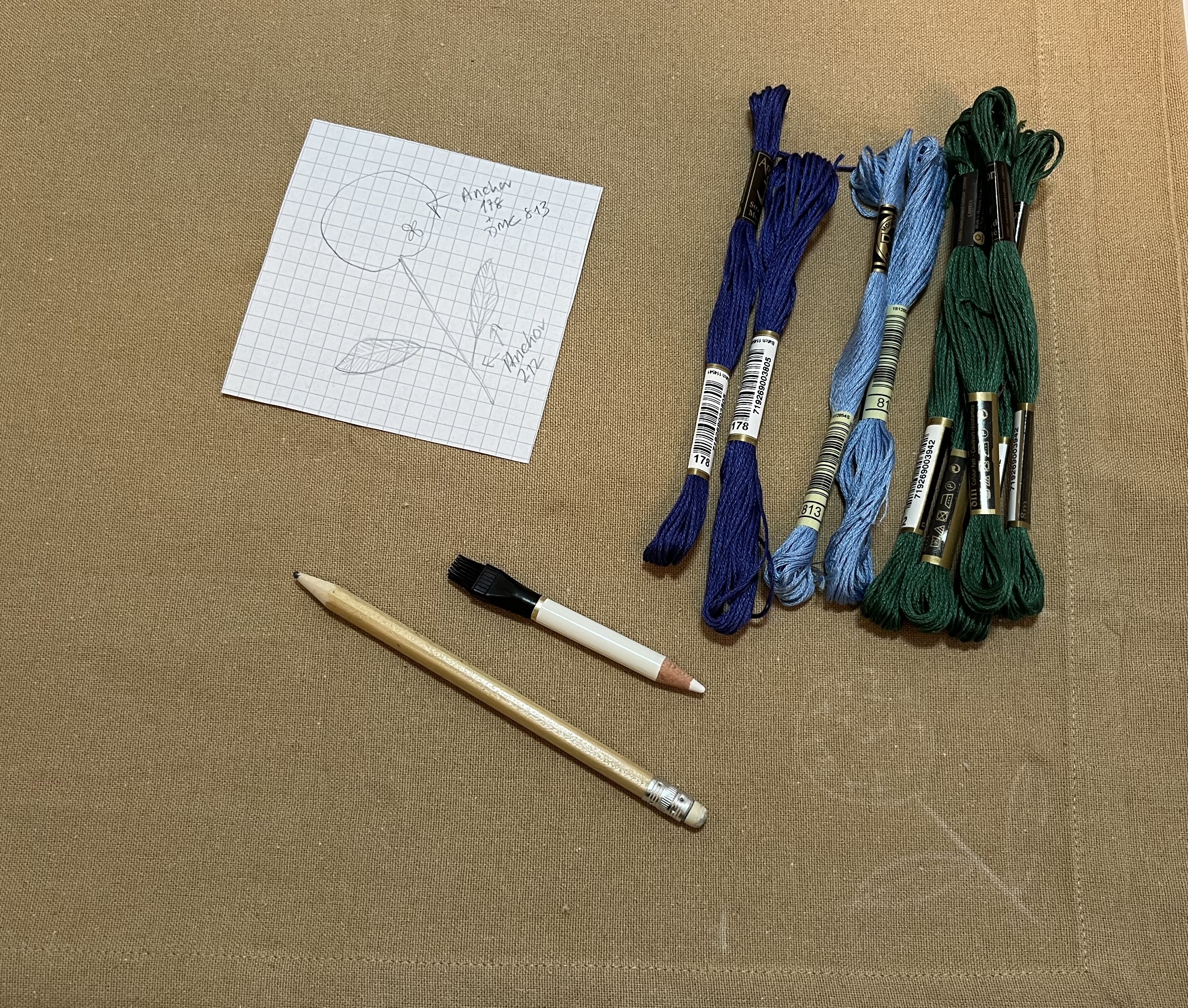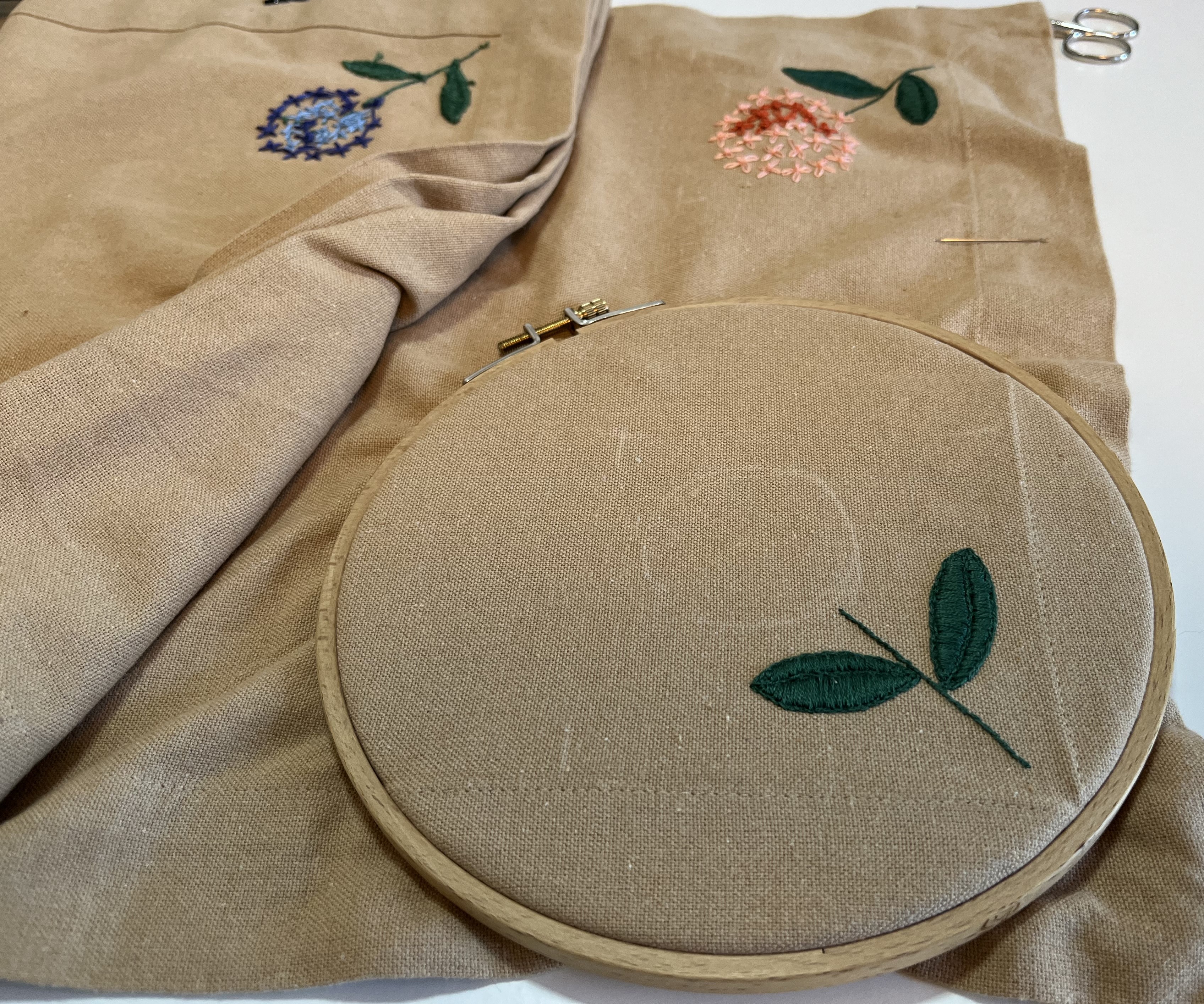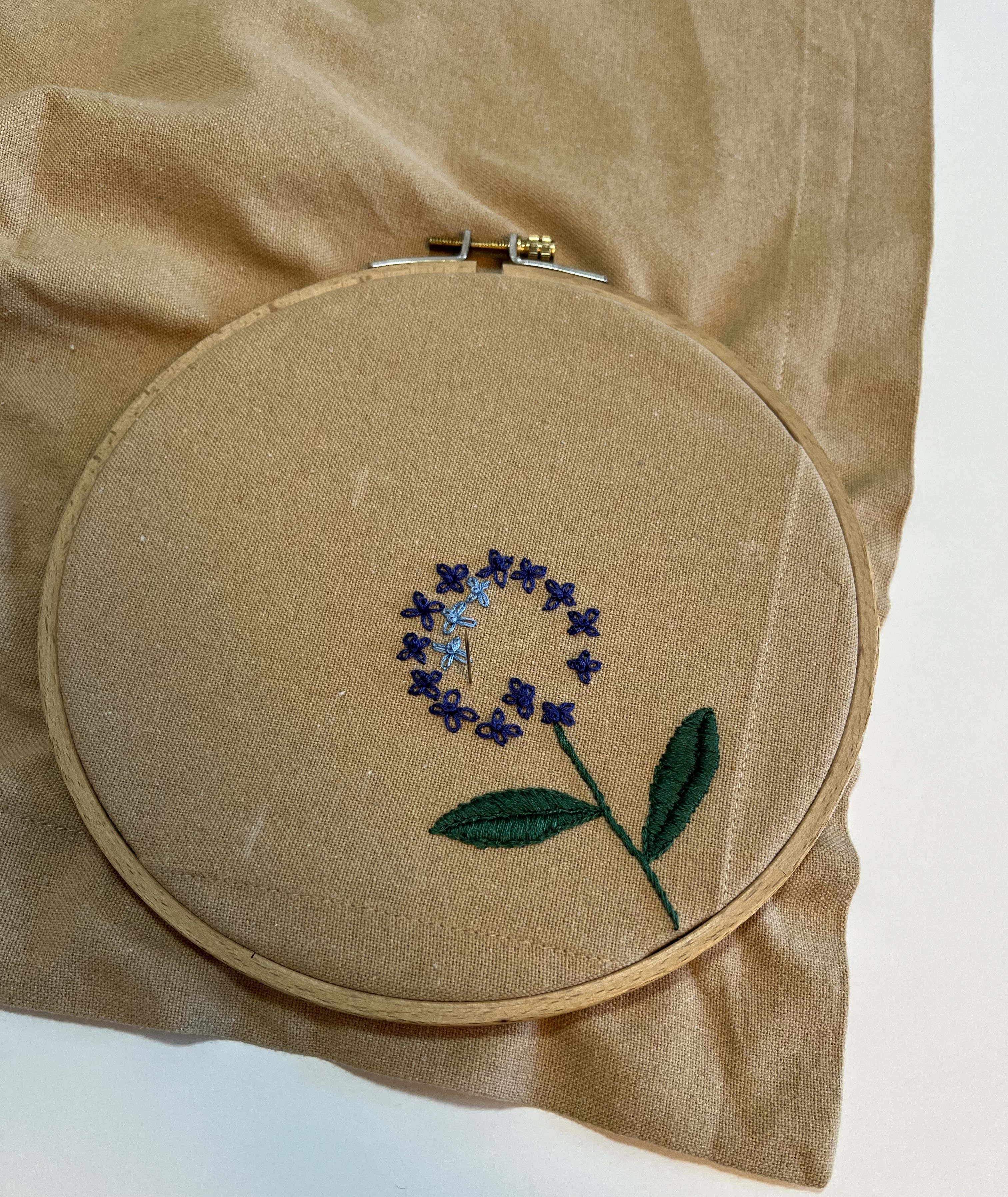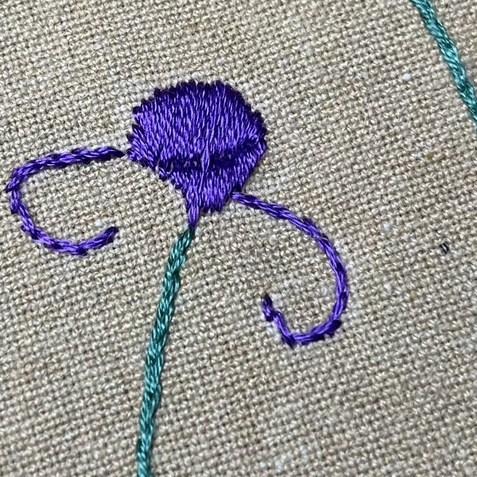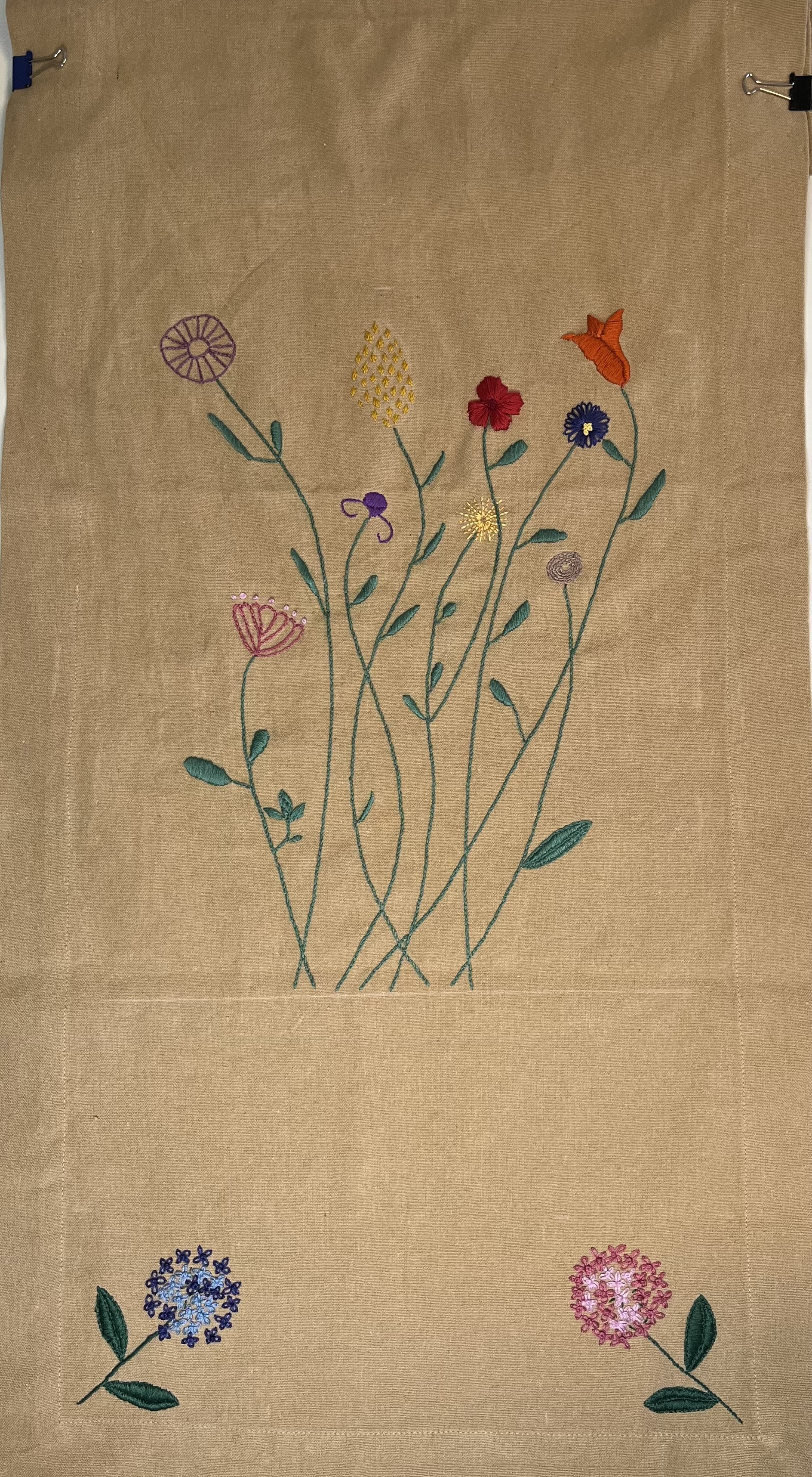 But, how to implement it? What direction should the flowers “grow”? Depending on what side of the table you were sitting at, the blossoms might be looking at or away from you. That could look kind of stupid. And, this is where my lack of an artist’s eye is a real handicap. I can imagine roughly how something might look but not precisely enough to know if it will look good or not; I just have to try it out and see. I guess if I could draw well, I could draw a design out fully and decide. But, my skill isn’t that developed. I just have to embroider it how I plan it and hope for the best. Believe me, because of this approach, I have quite the collection of failed embroidery projects – projects that didn’t work out but I can’t bring myself to throw them out.