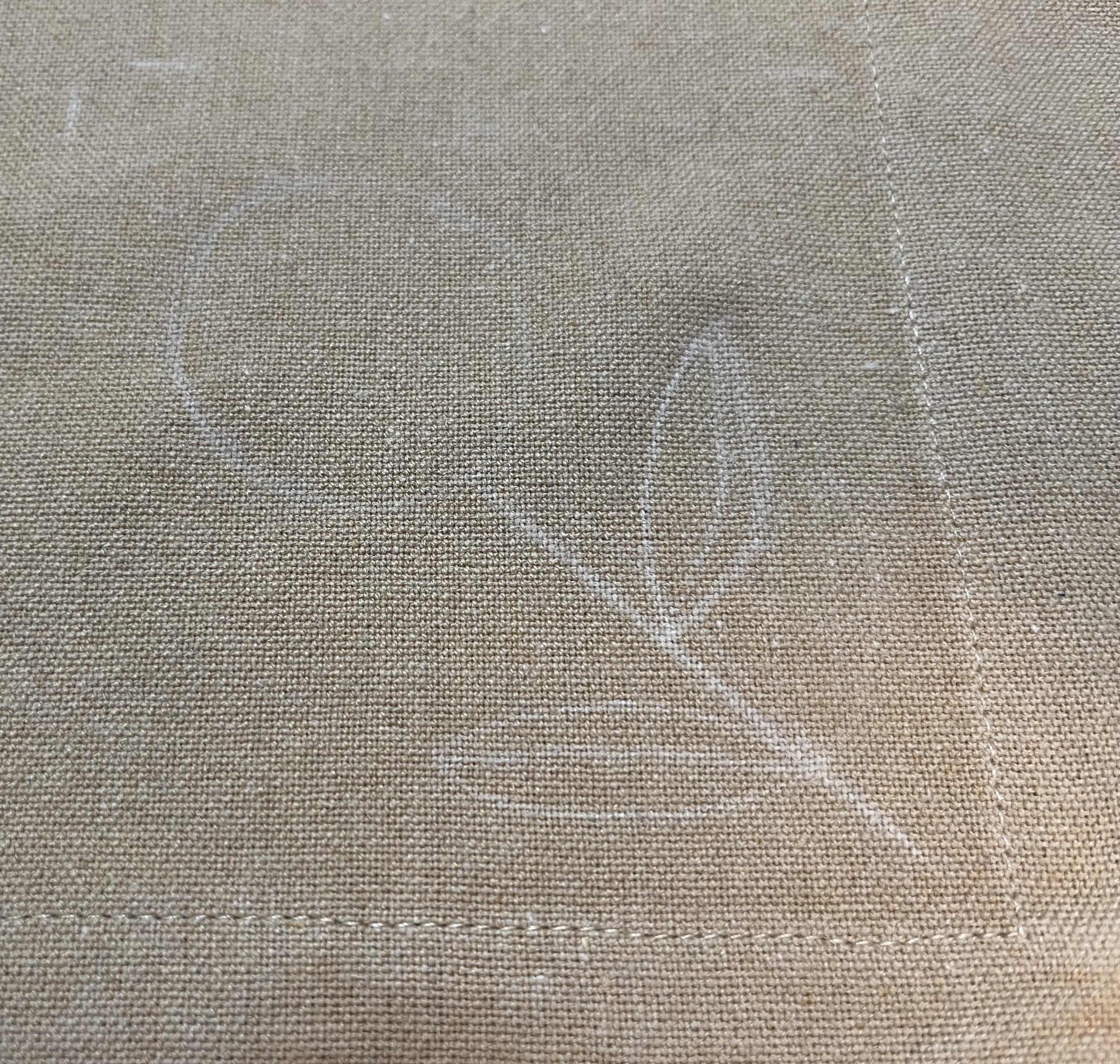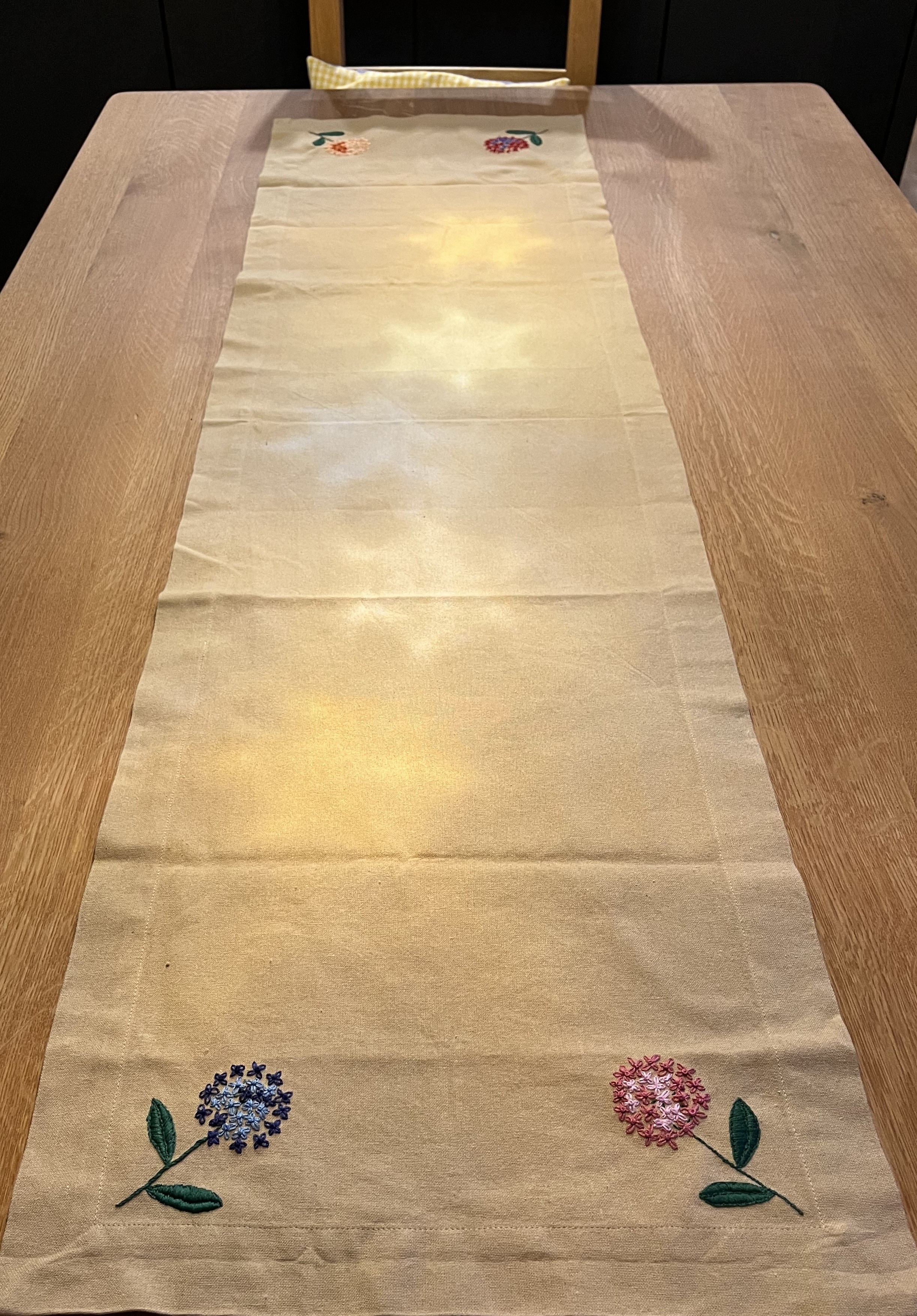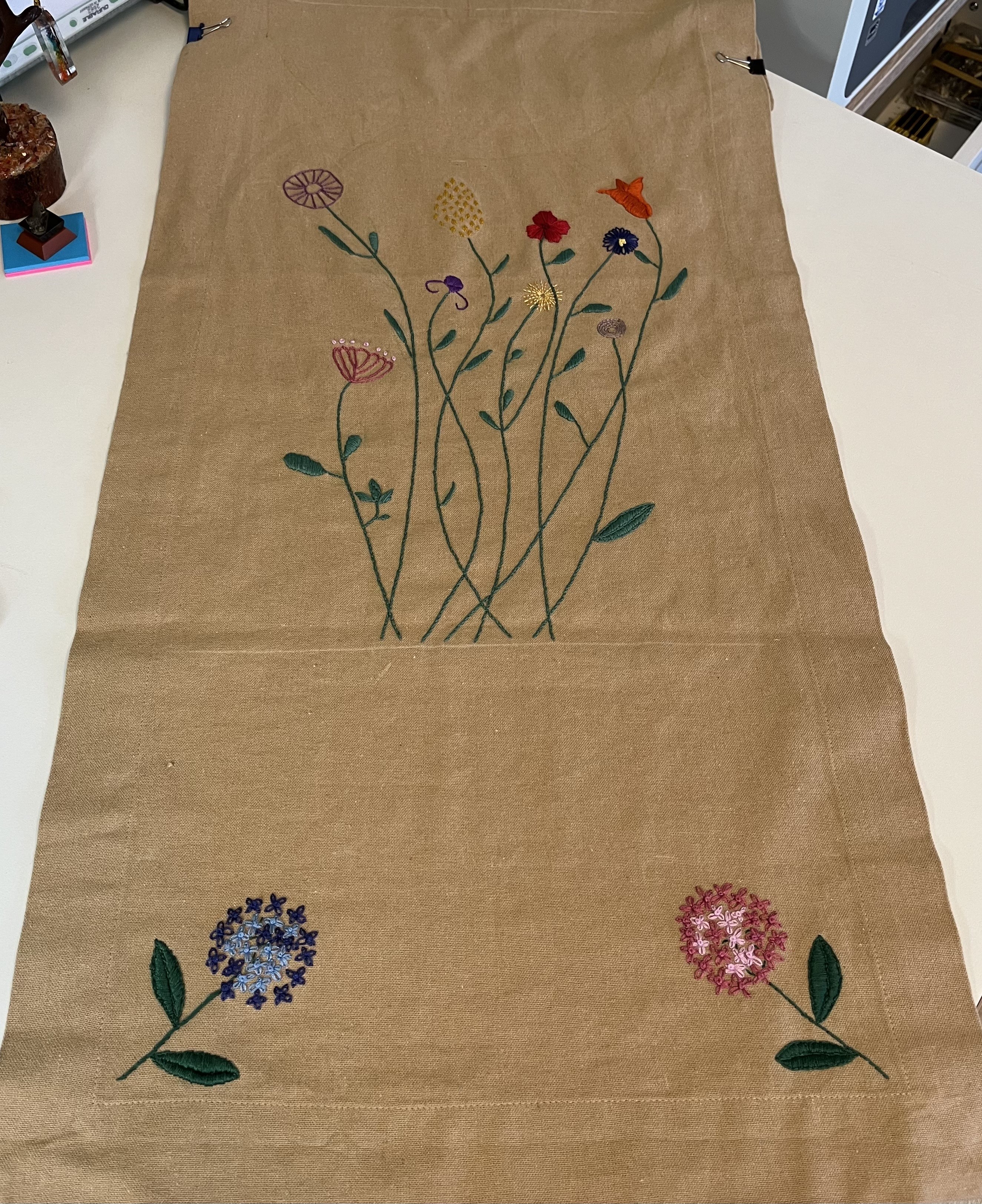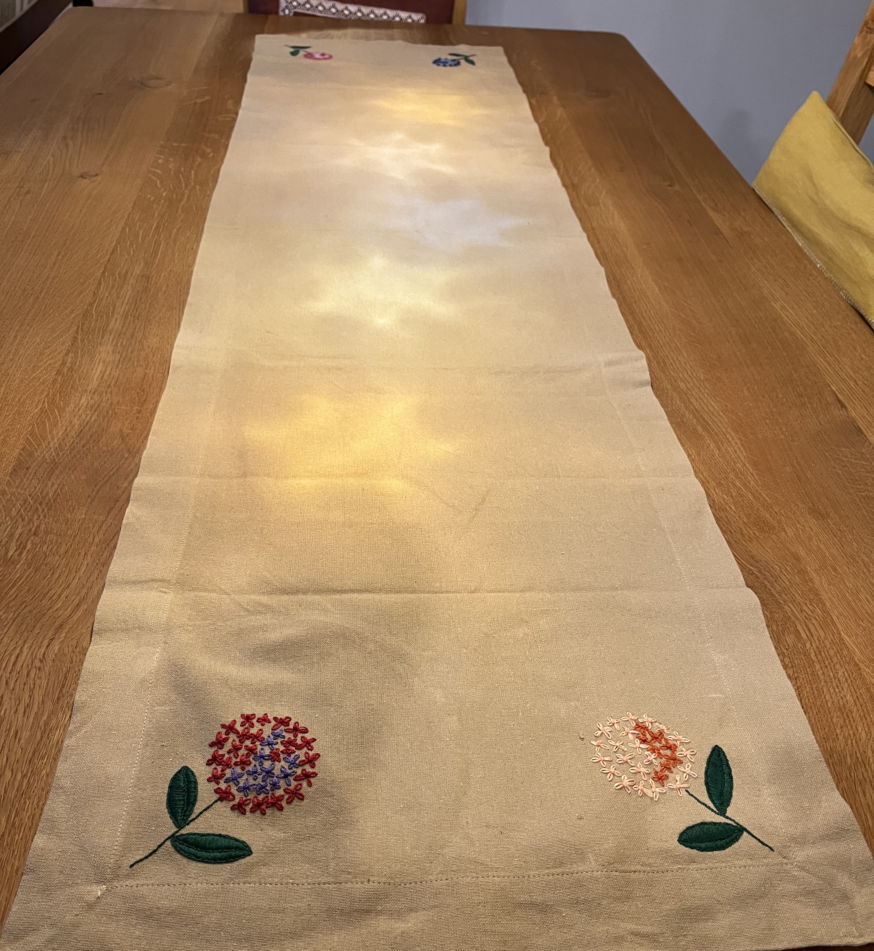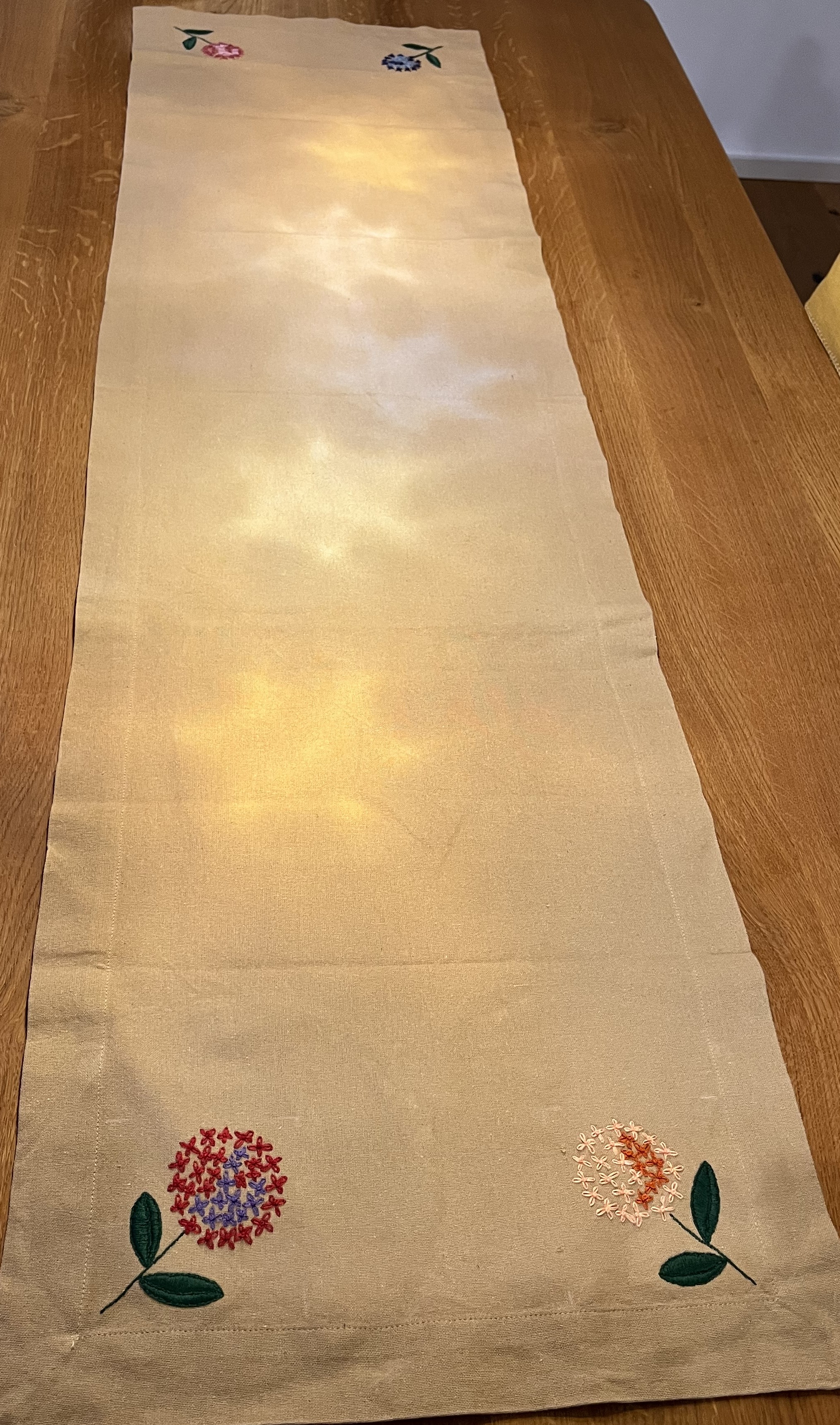 If you’ll recall, I was unsure if I should embroider something in the center of the runner and had even drawn a circle to mark the area. But, I like the space between the two sides – it leaves a spot for a vase with (real) flowers, for instance. Those of you with sharp eyes will notice that the two embroidered groups of flowers differ from each other. Yeah, that is my lack of drawing talent at work again. Oh well … at least it is obviously not machine-made! LOL