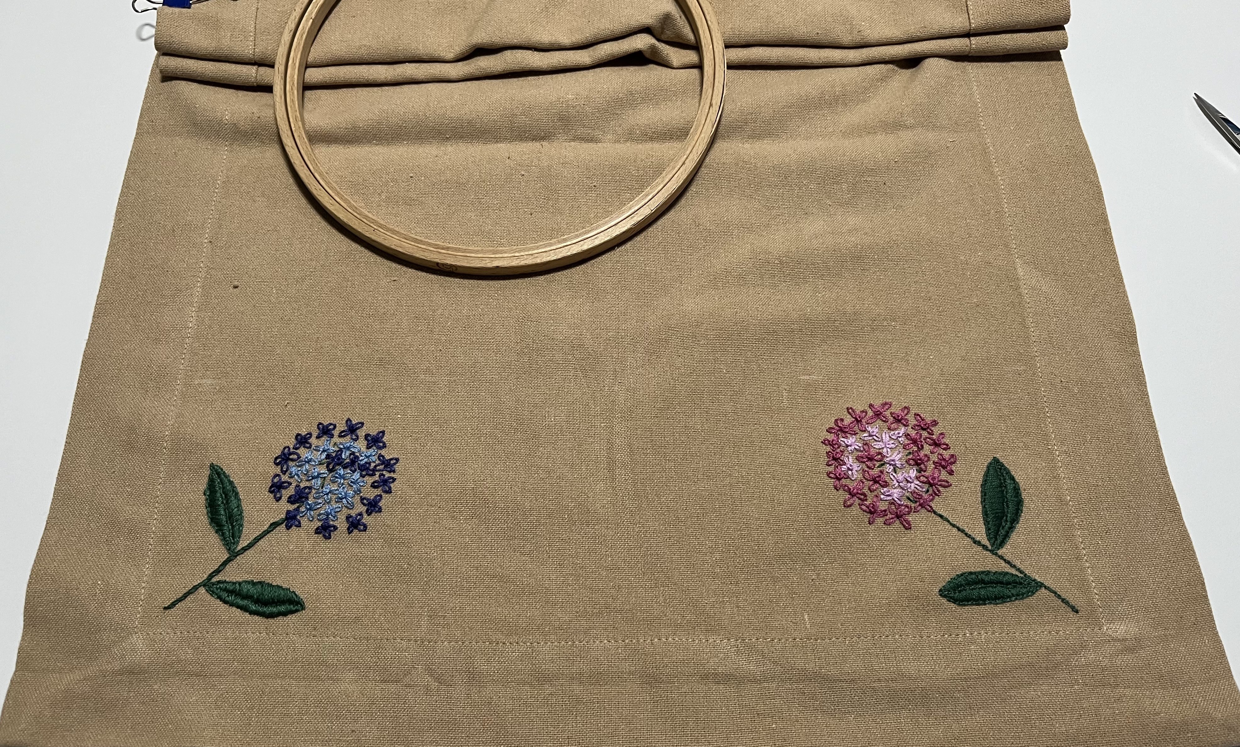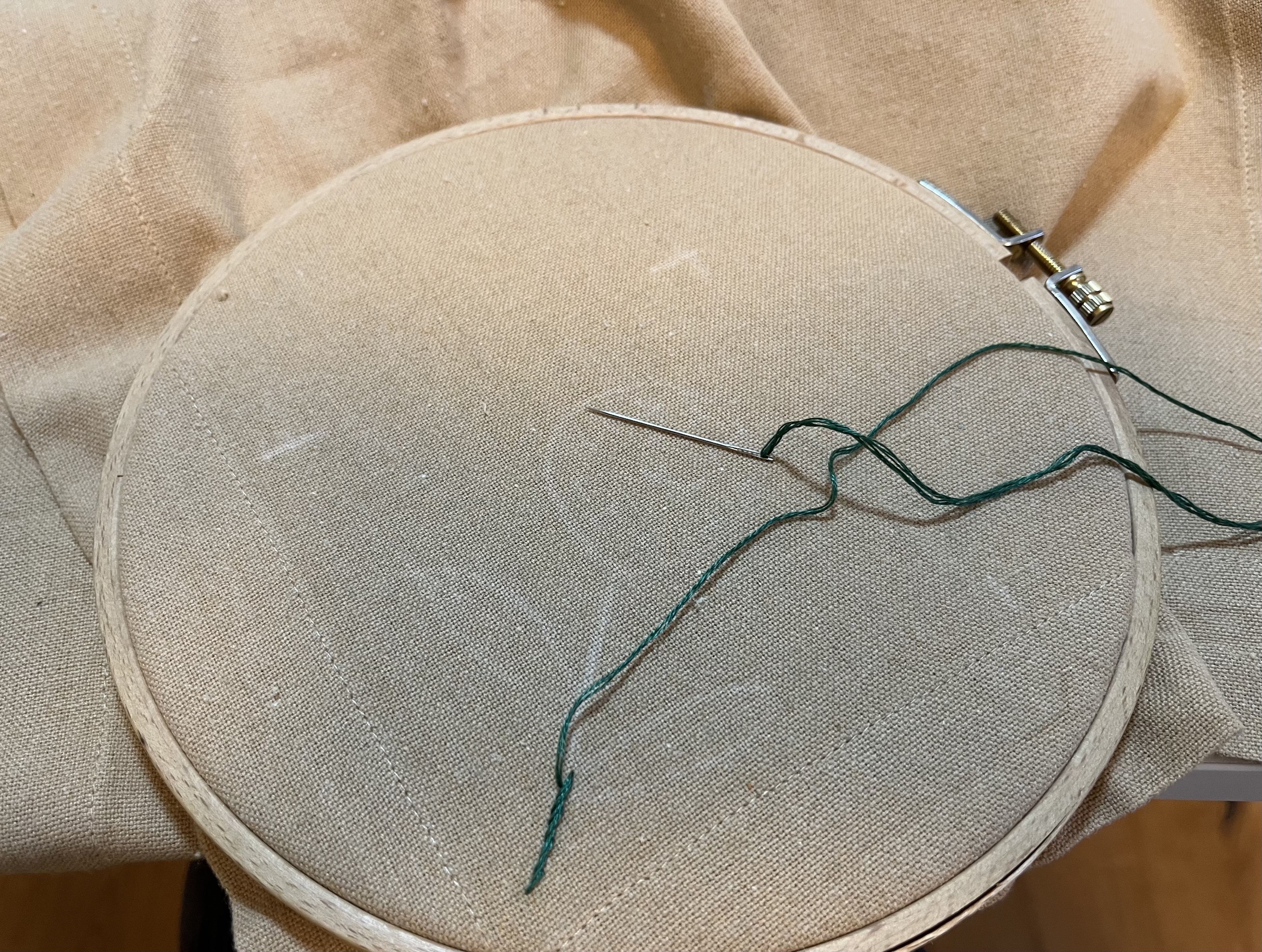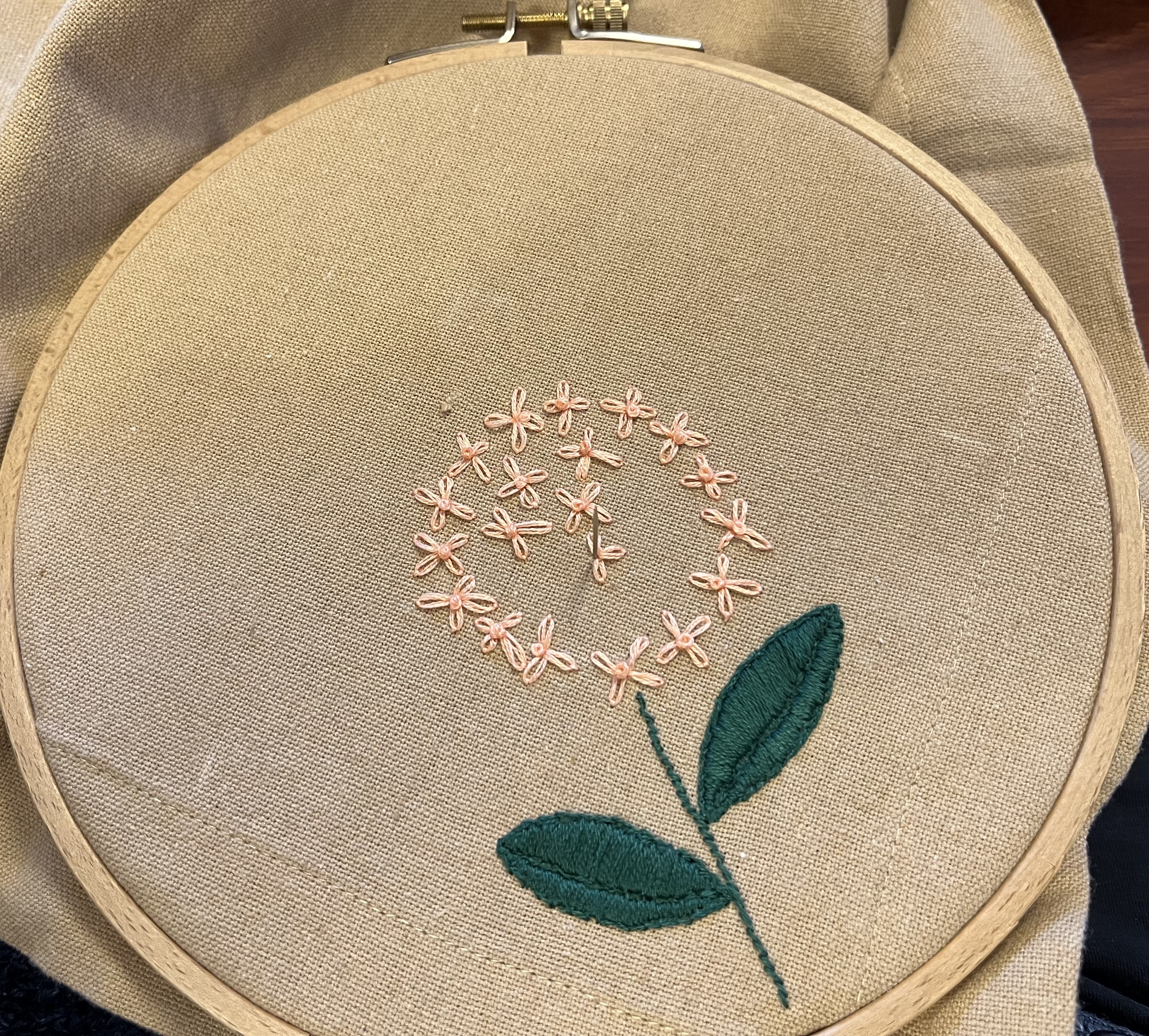 The stems are almost finished and I’ll get started on the leaves and blossoms shortly. Once the one side is finished completely, I’ll get started on the other side. Then, we’ll see how it looks and if something has to be embroidered inside the circle or not. Stay tuned!