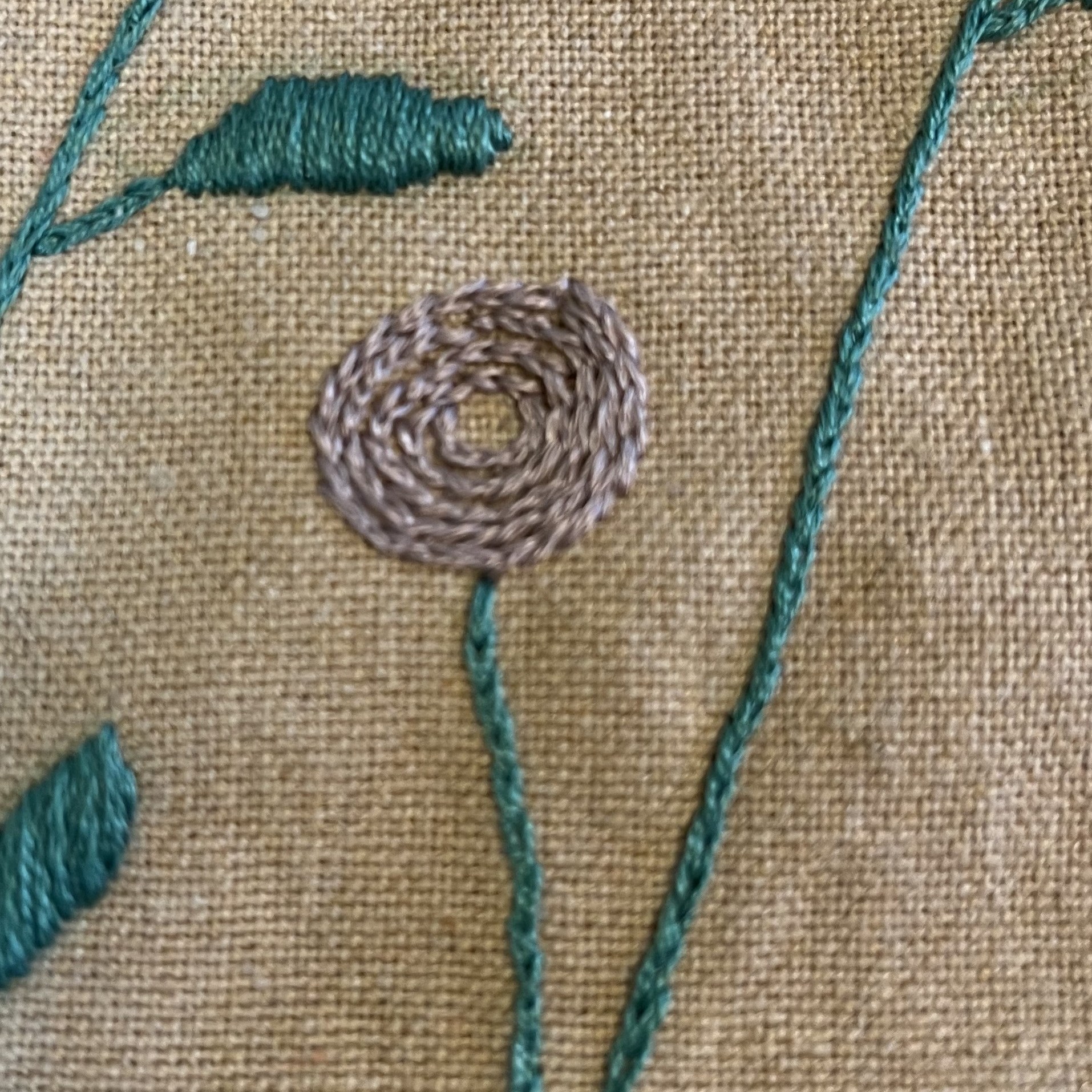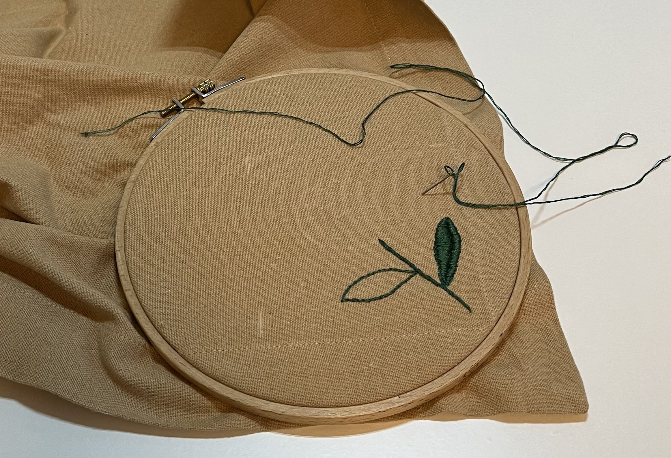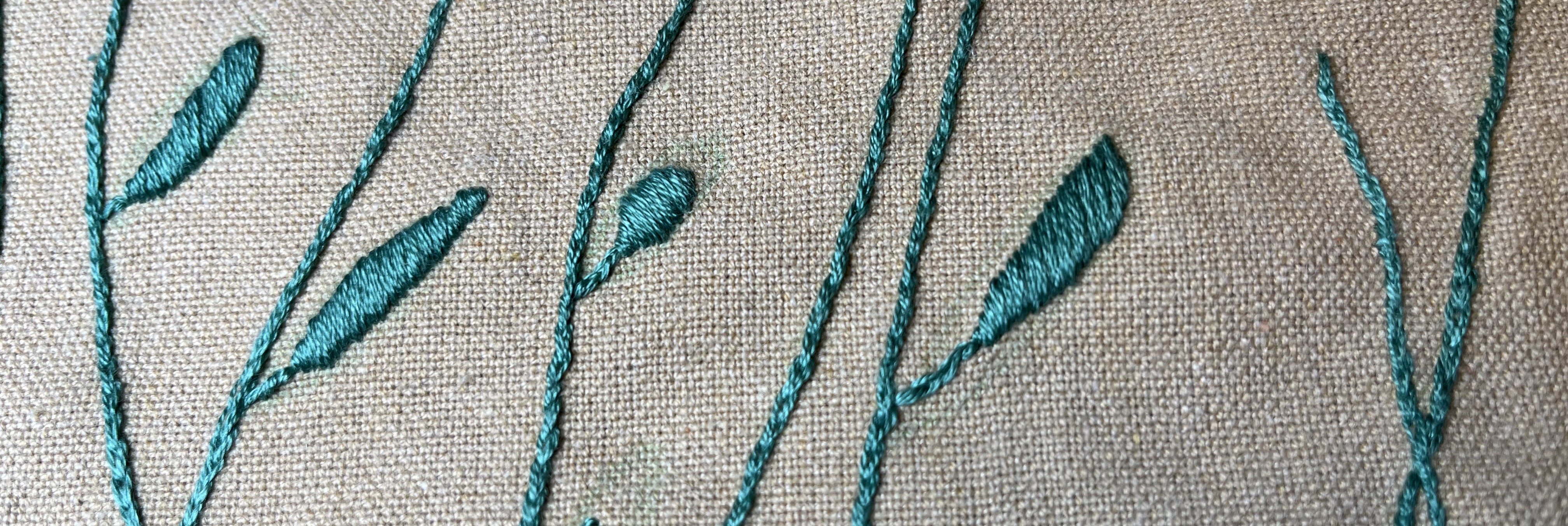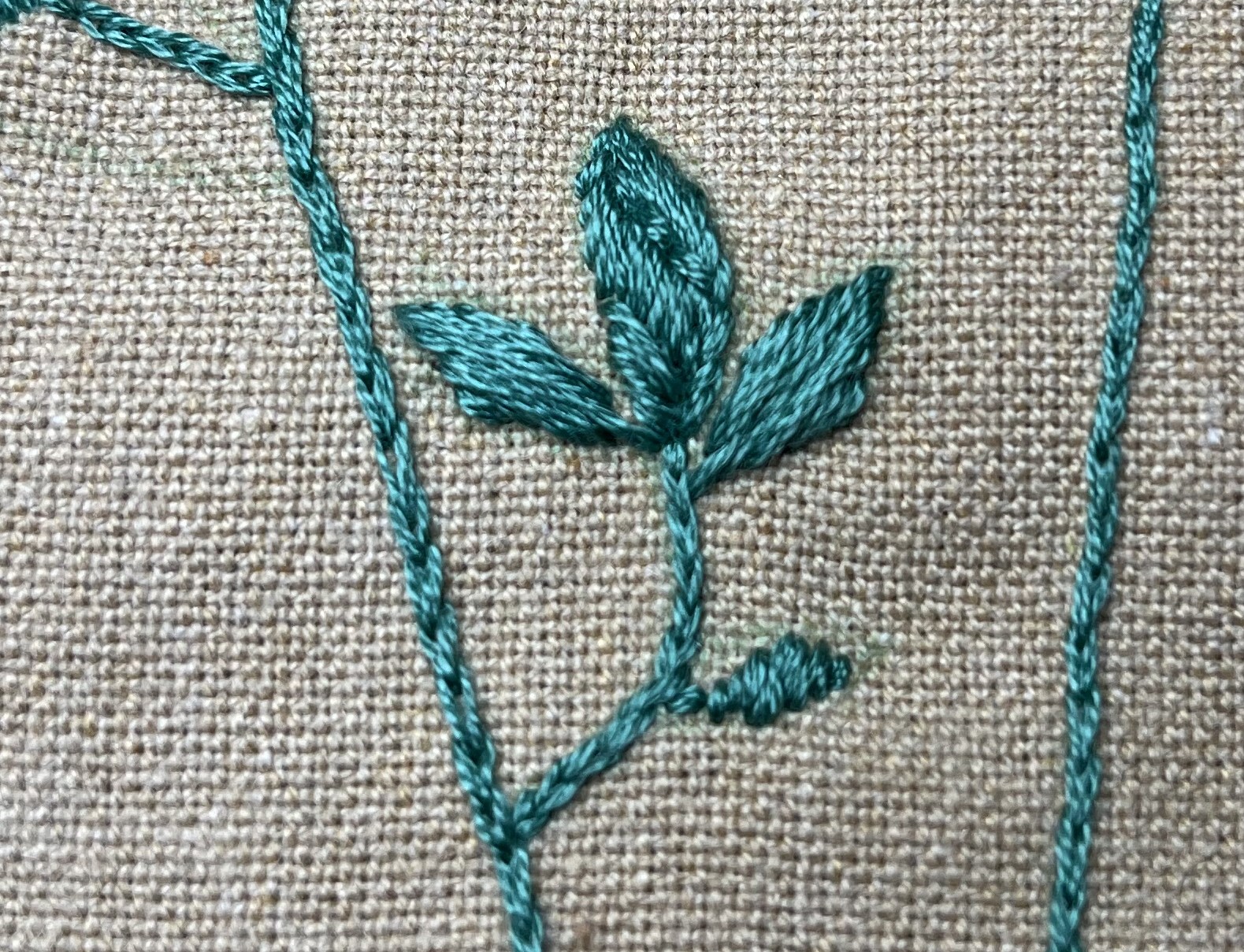 For the stems, I used a simple chain stitch. I like how the light hits it and it gives the stems a little more heft than other stitch-options would. For the leaves, I tried a couple of different techniques …