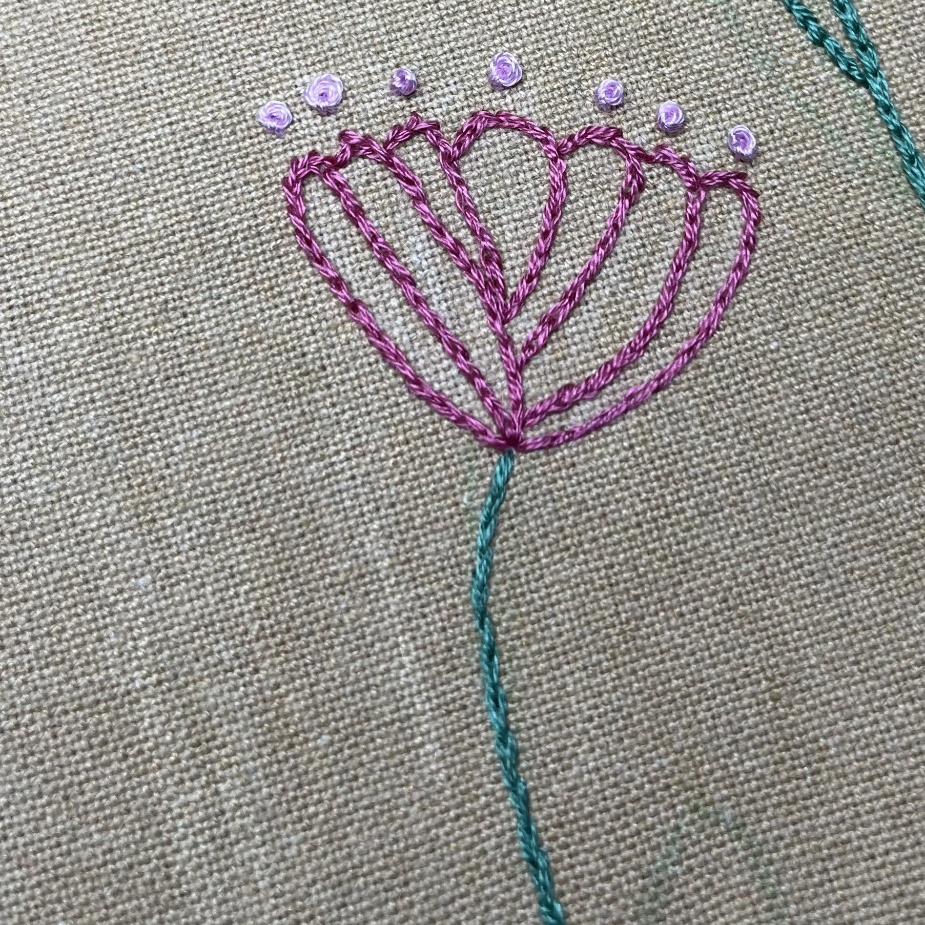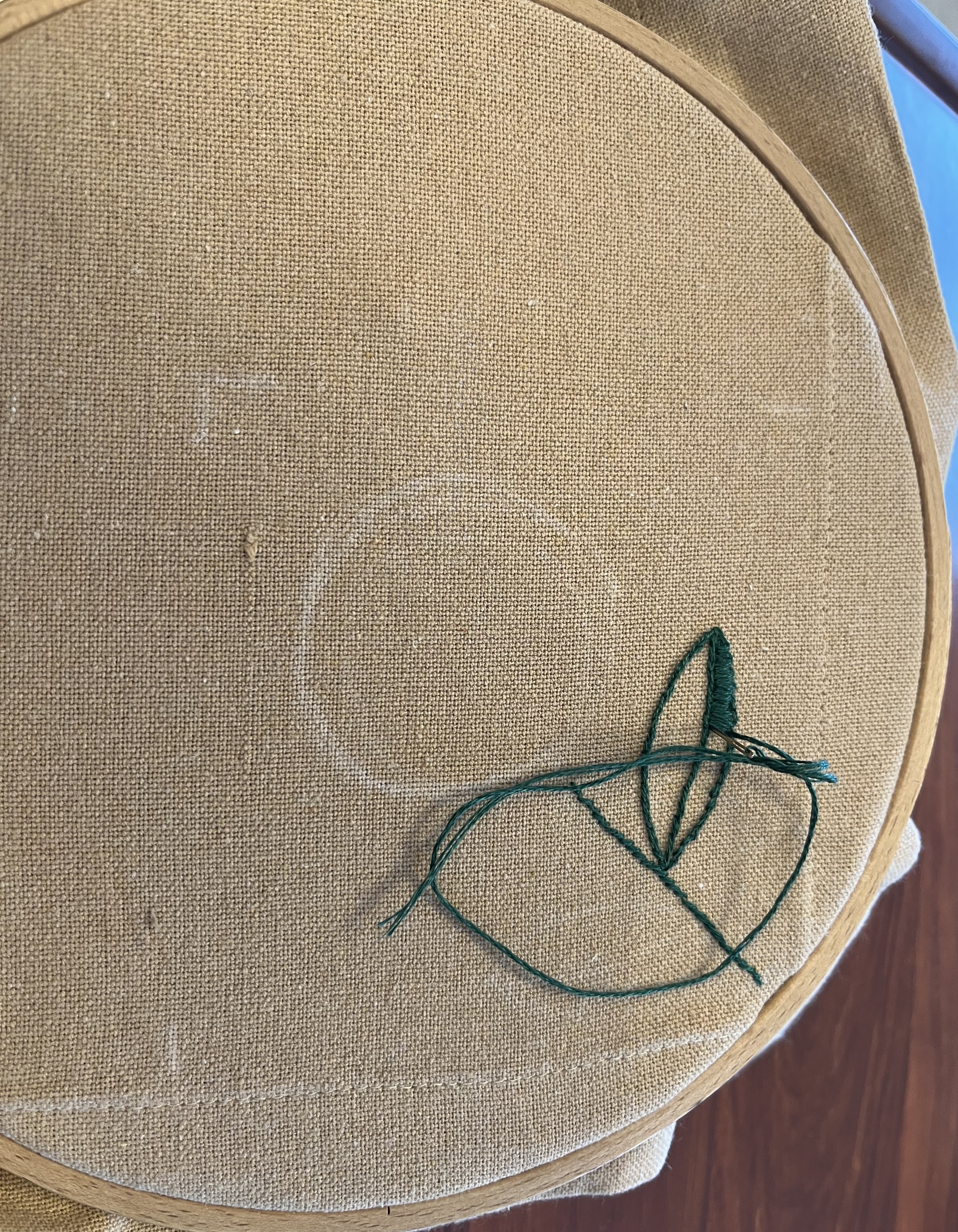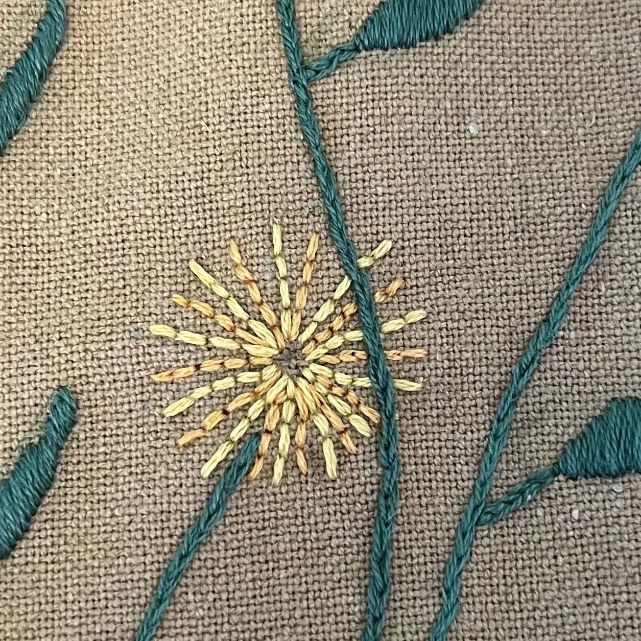 For the stems, I used a simple chain stitch. I like how the light hits it and it gives the stems a little more heft than other stitch-options would. For the leaves, I tried a couple of different techniques …