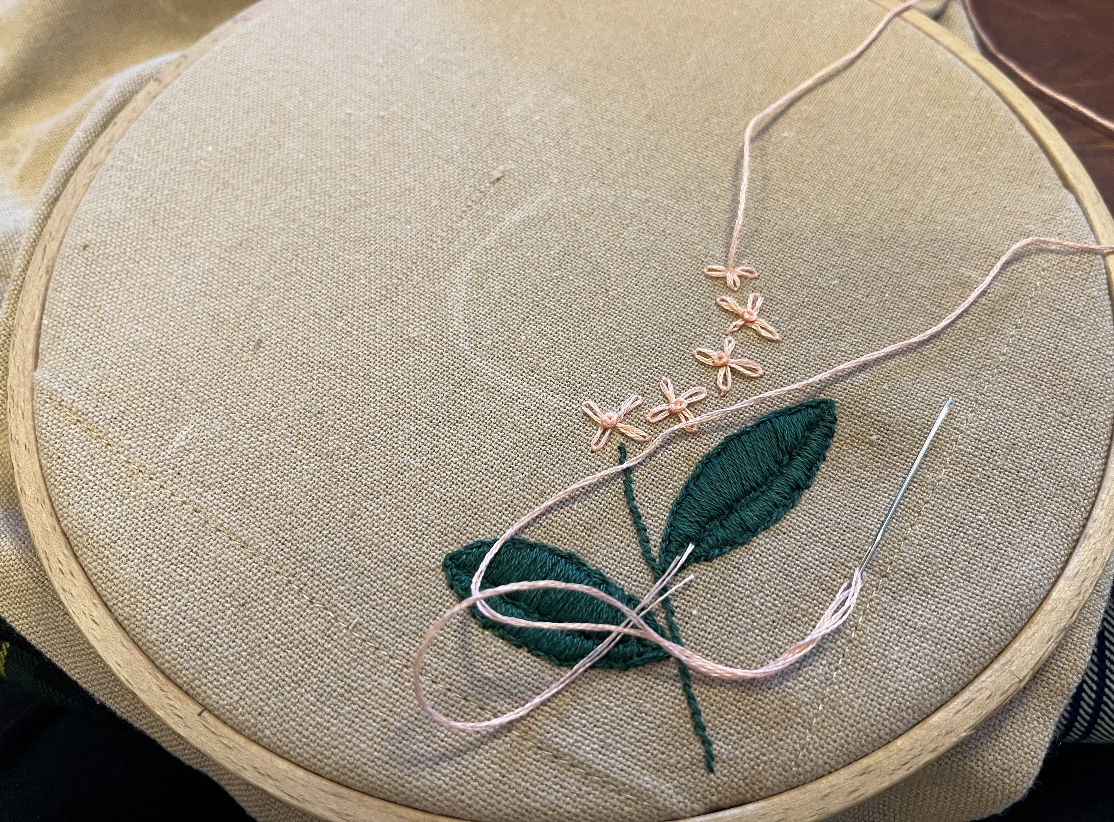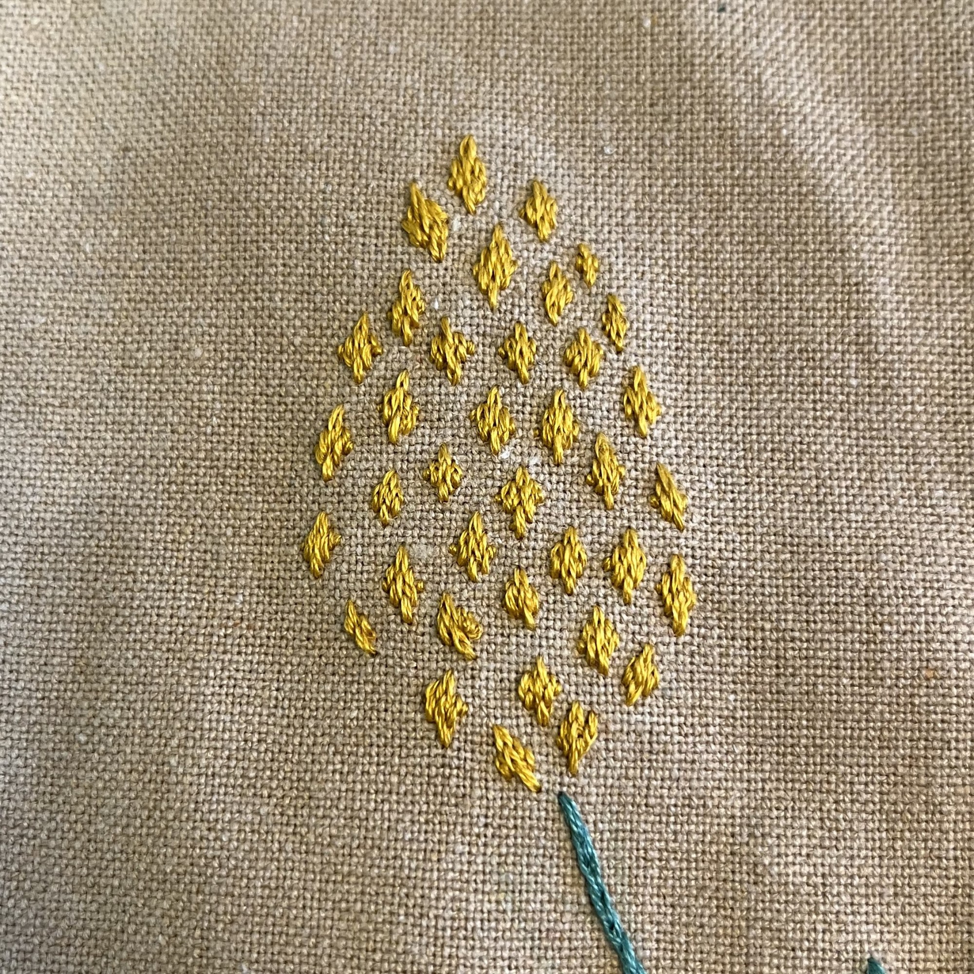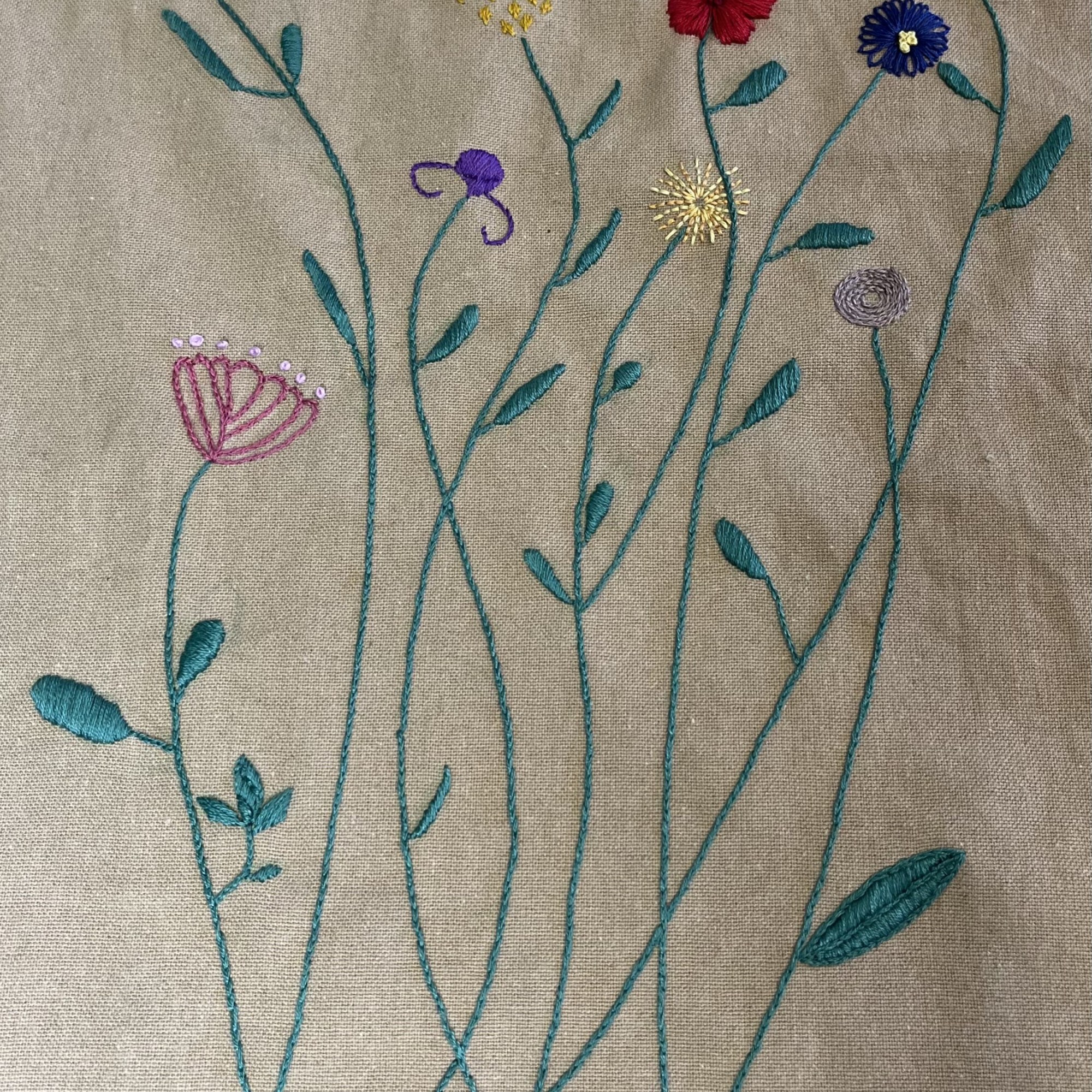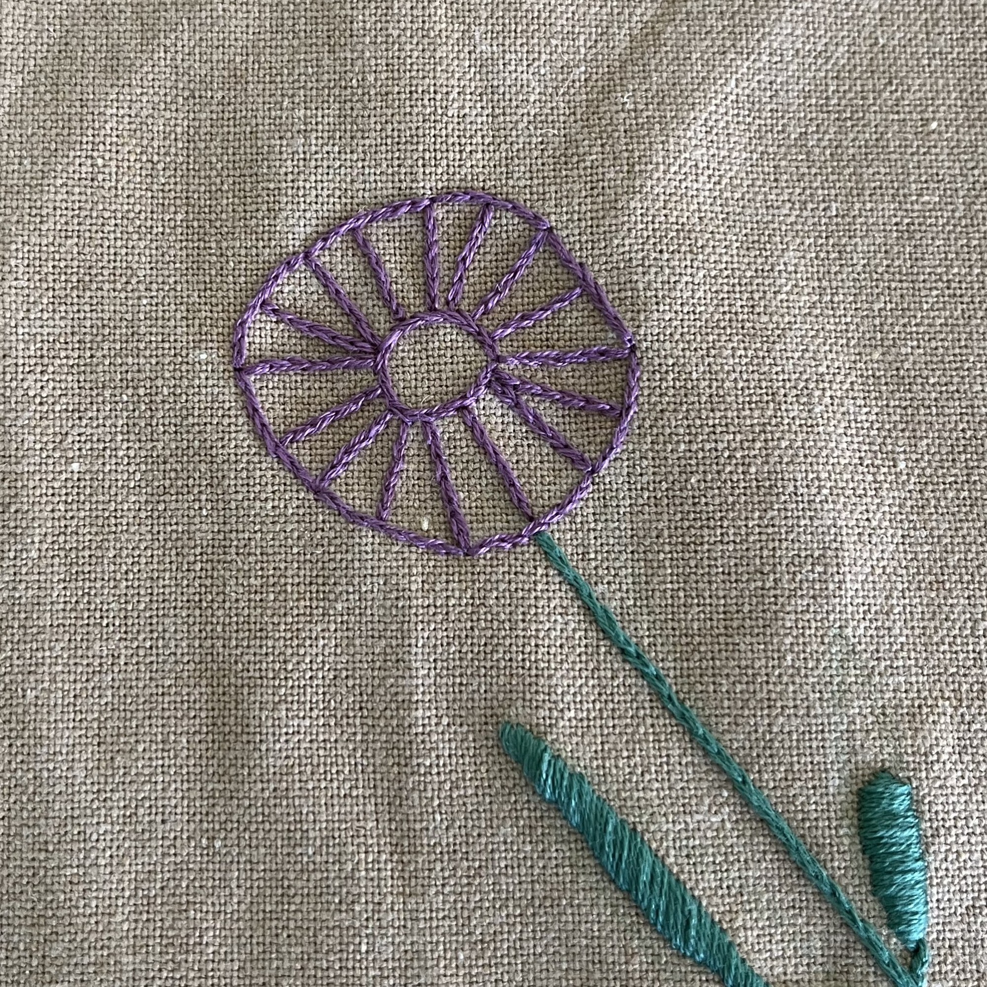 For the stems, I used a simple chain stitch. I like how the light hits it and it gives the stems a little more heft than other stitch-options would. For the leaves, I tried a couple of different techniques …
