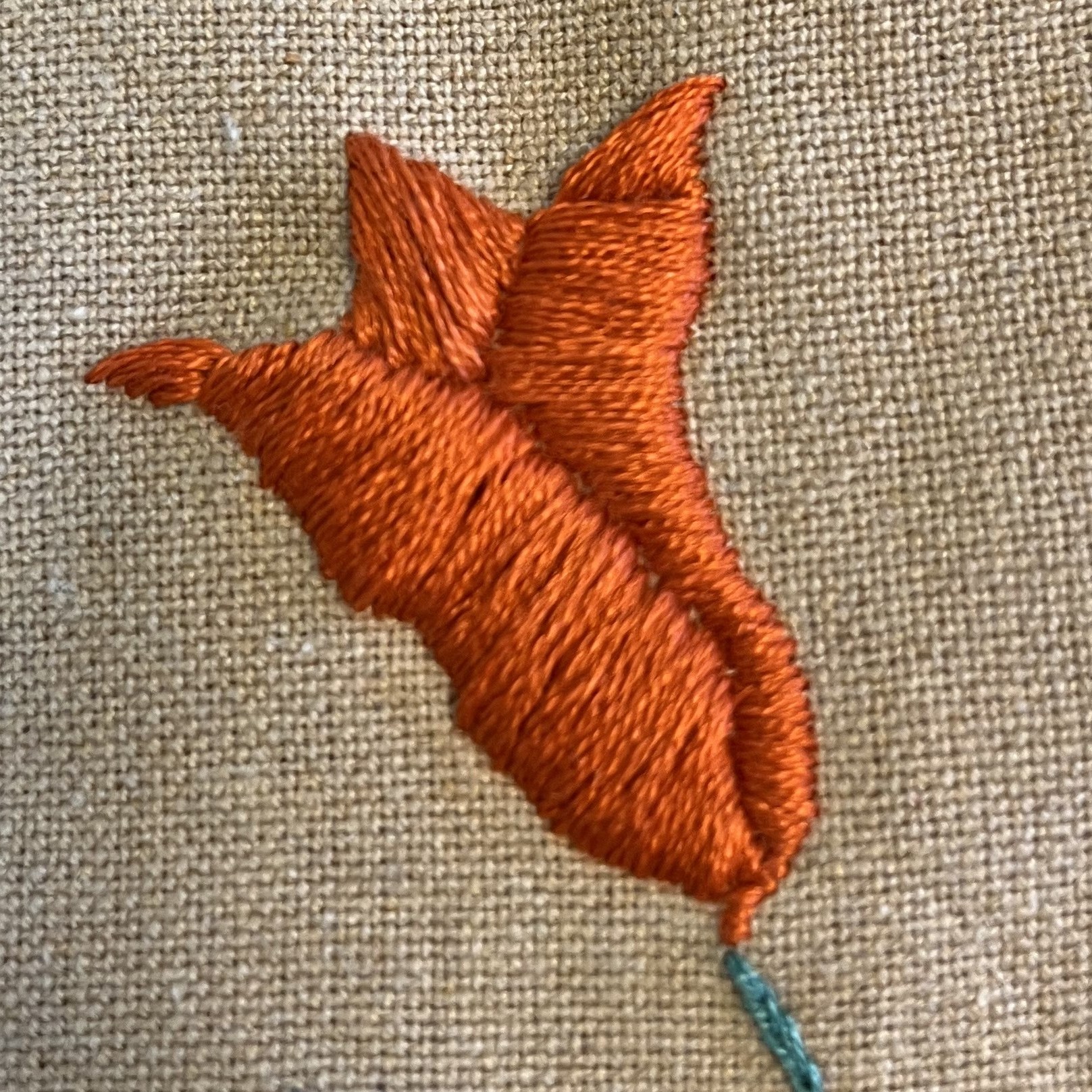 Above left, I split the overall leaf into three sections. I stitched the middle leaf in three sections to try and play with how the light reflected off of it. In the middle picture above, I combined the chain stitch with a satin stitch. This creates a cool kind of quasi-variegated look. But, as you can see in the picture on the right, most of the leaves are just the simple satin stitch. For the stems and the leaves, I used 4 strands of the embroidery floss – in the past, I usually used 3 strands. Using more strands gives a fuller look.