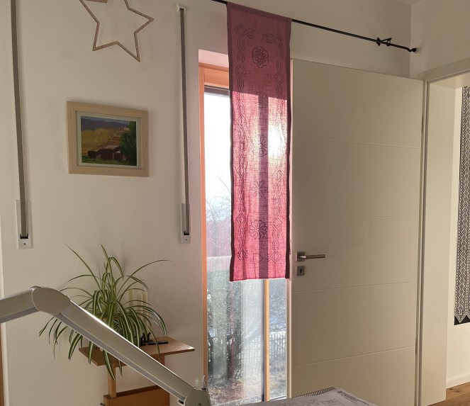 As the weeks go by, the sun is changing its position in the sky. The atelier gets great morning sun but it hits the desk just at the wrong angle, which blinds me when working at the pc. But, I have the perfect solution for this: one of the panels I embroidered!!! So, I put it up this morning and it works really well – it lets the sun in but I am not blinded by it!