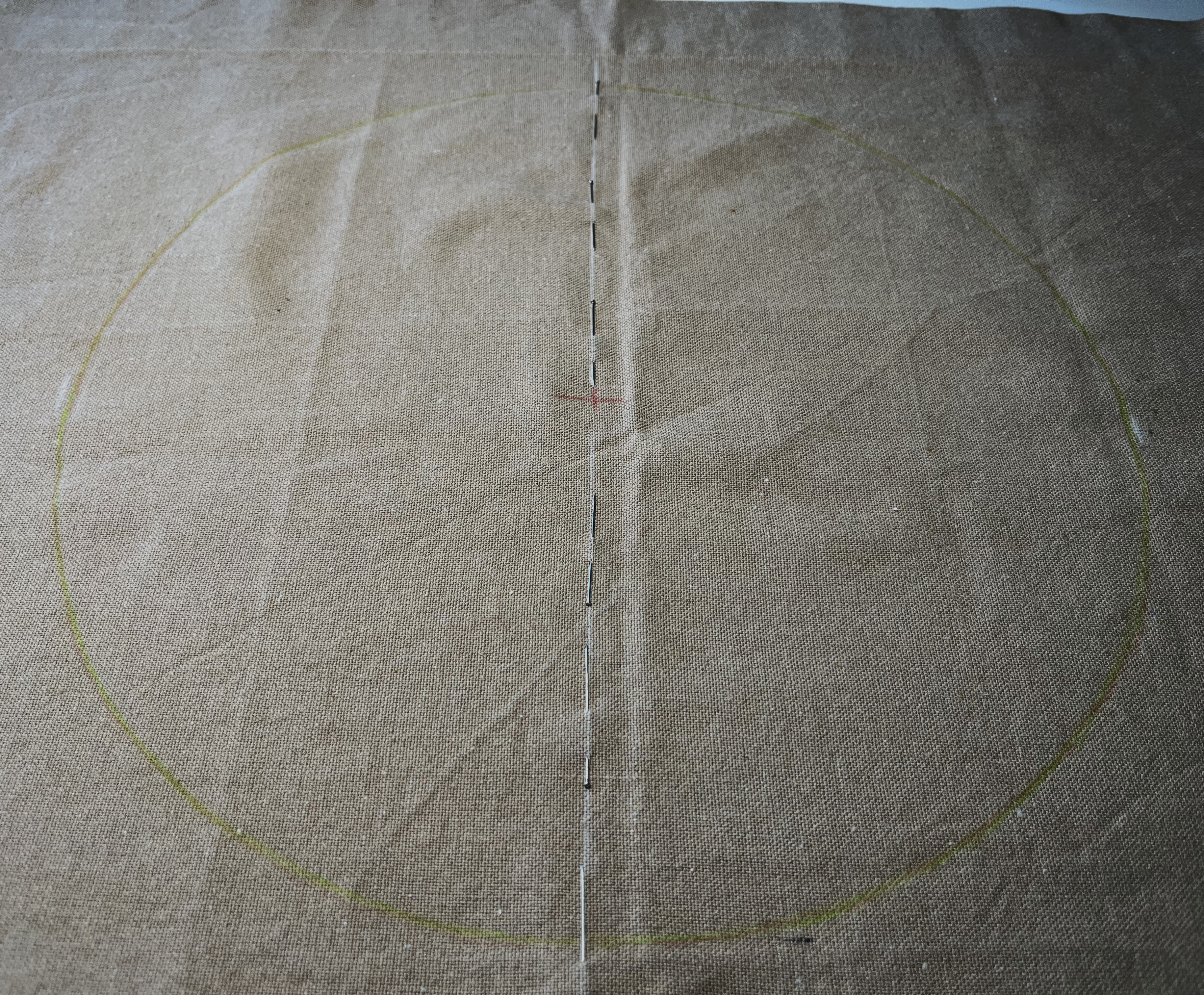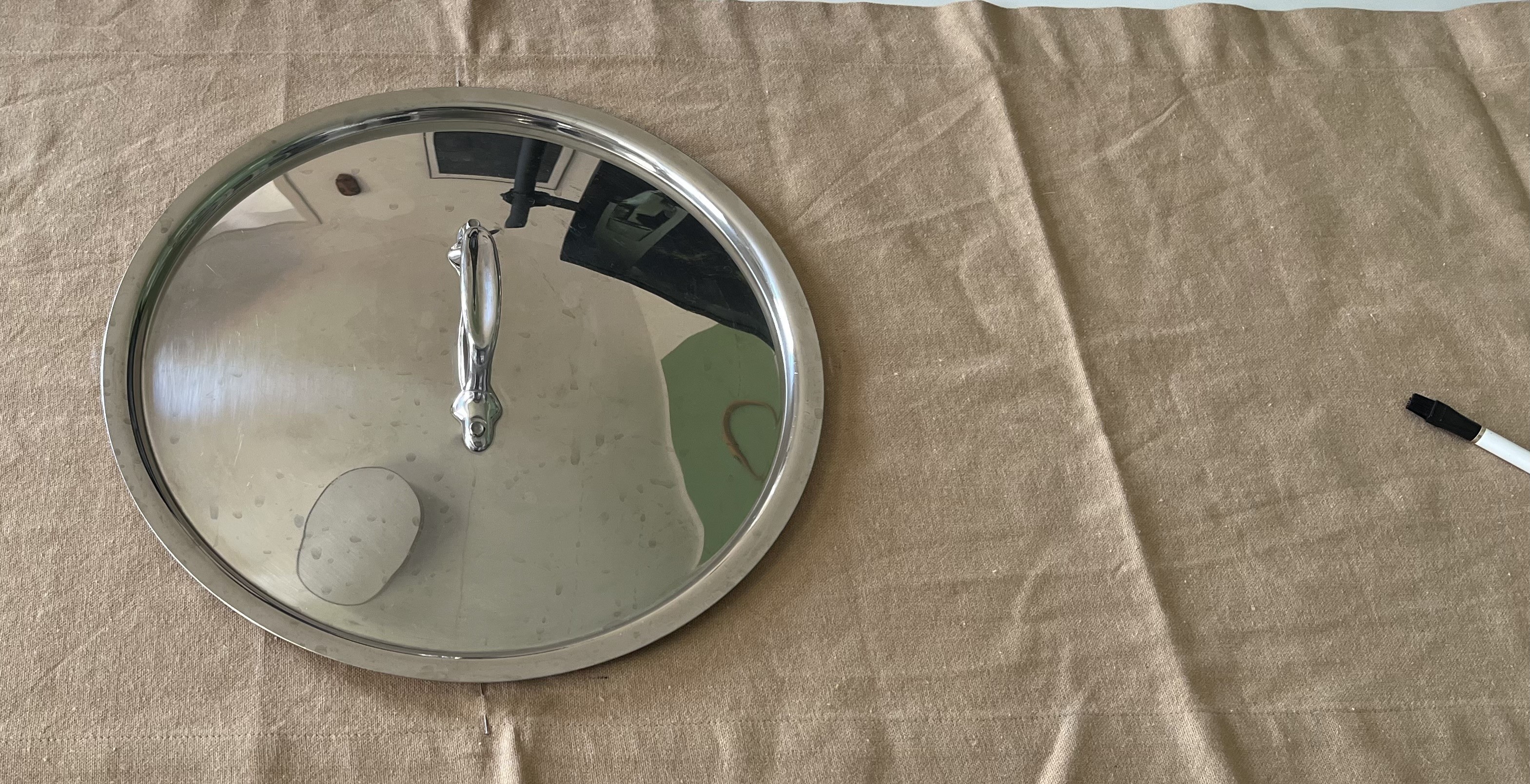 Circles are hard to do perfectly without help. I cannot draw a perfect circle to save my life. I do have a geometric compass but it is too big for the runner. What to do? So, being the hausfrau I am, I went into the kitchen to see if I could find a plate, bowl or something round to use to trace a perfect circle. One of my pot tops did the trick!