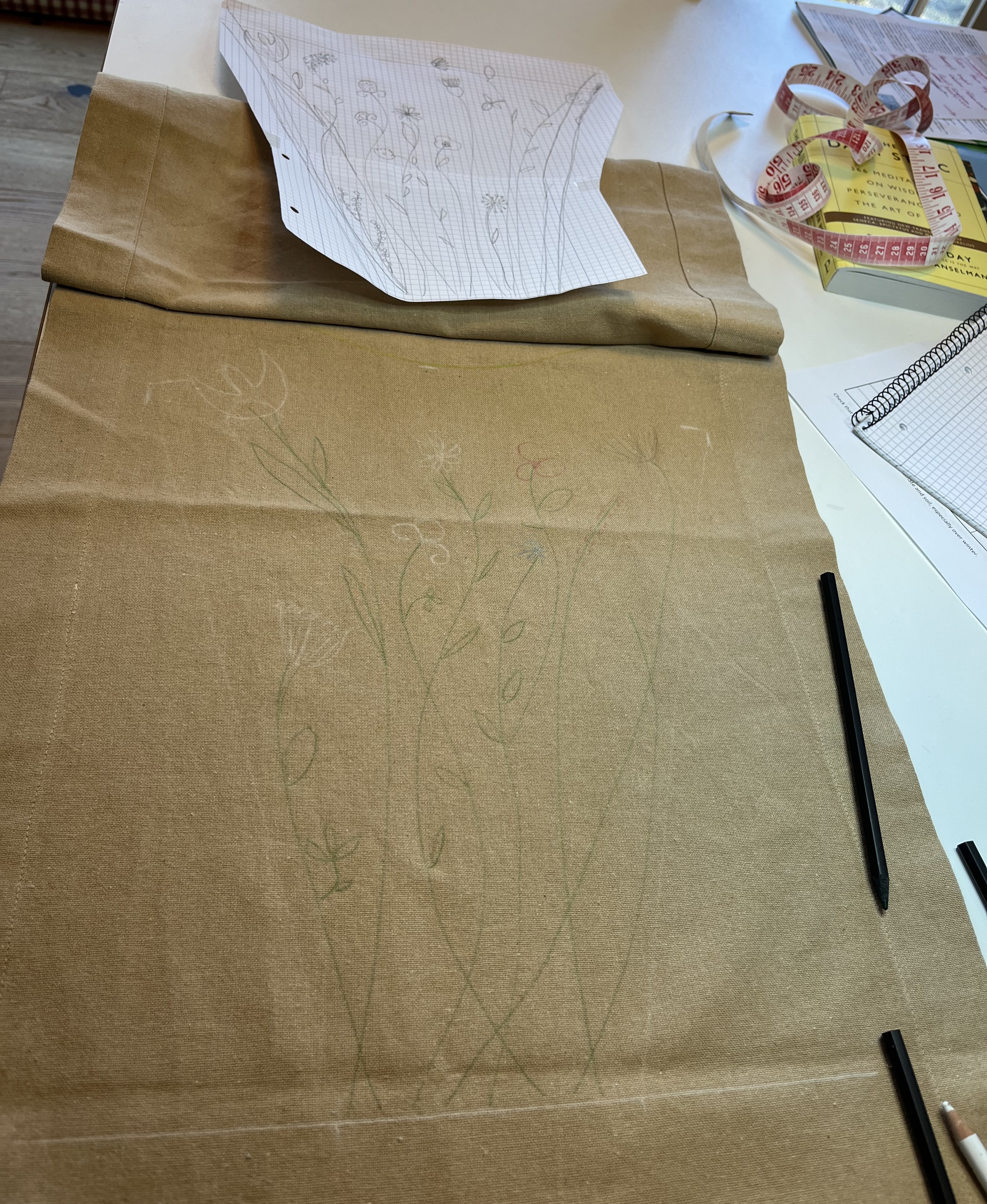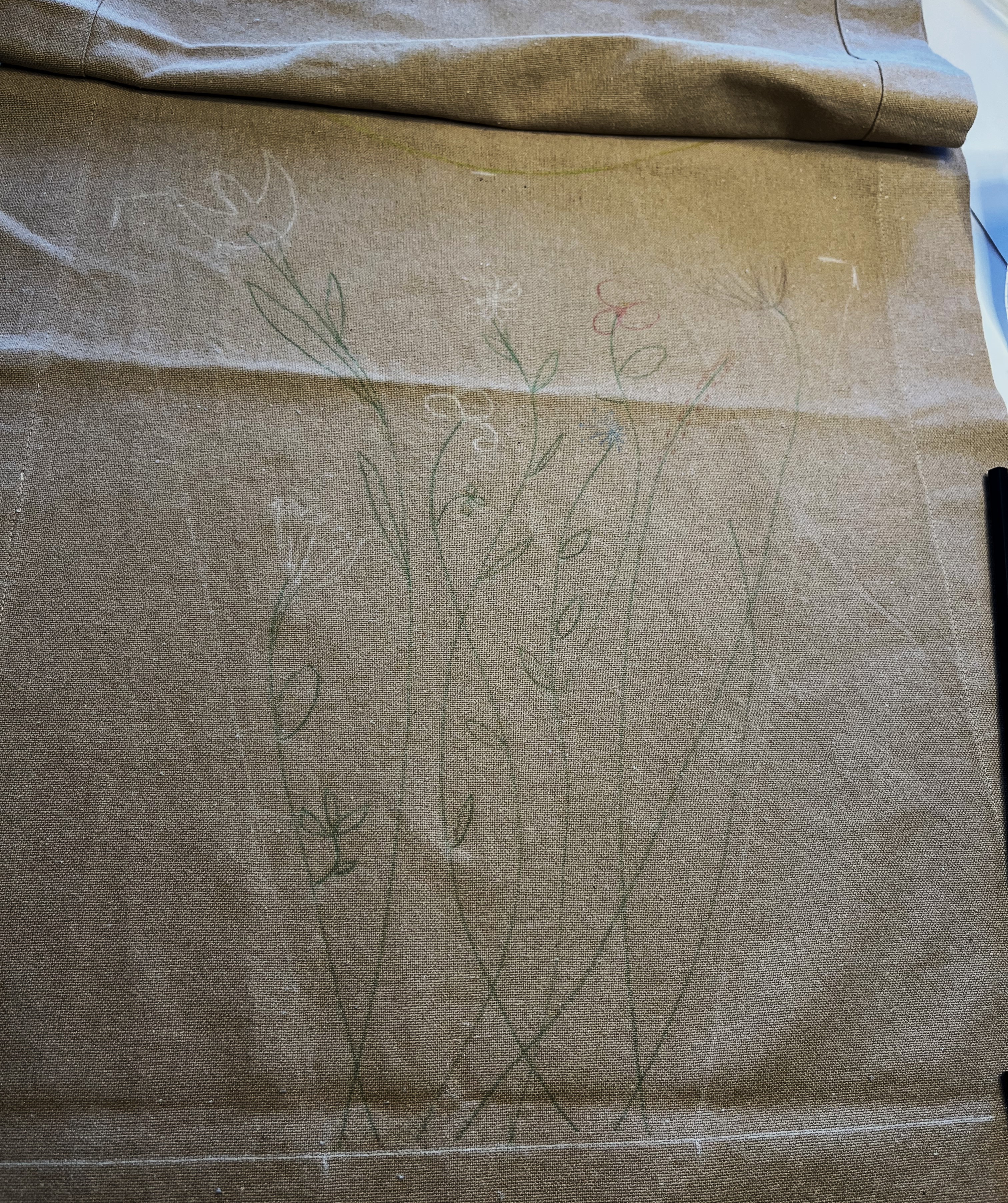 The next step now is to plop flowers on the ends of those stems. You can’t really see them in the above photos but I drew rough outlines for the flowers – different shapes and sizes. I haven’t decided on what colors to use, though. Given that I used 4 different “families” of colors for the flowers in each corner, I am tending towards sticking to those 4 color groups … with maybe a pop of one or two additional colors. Stay tuned!