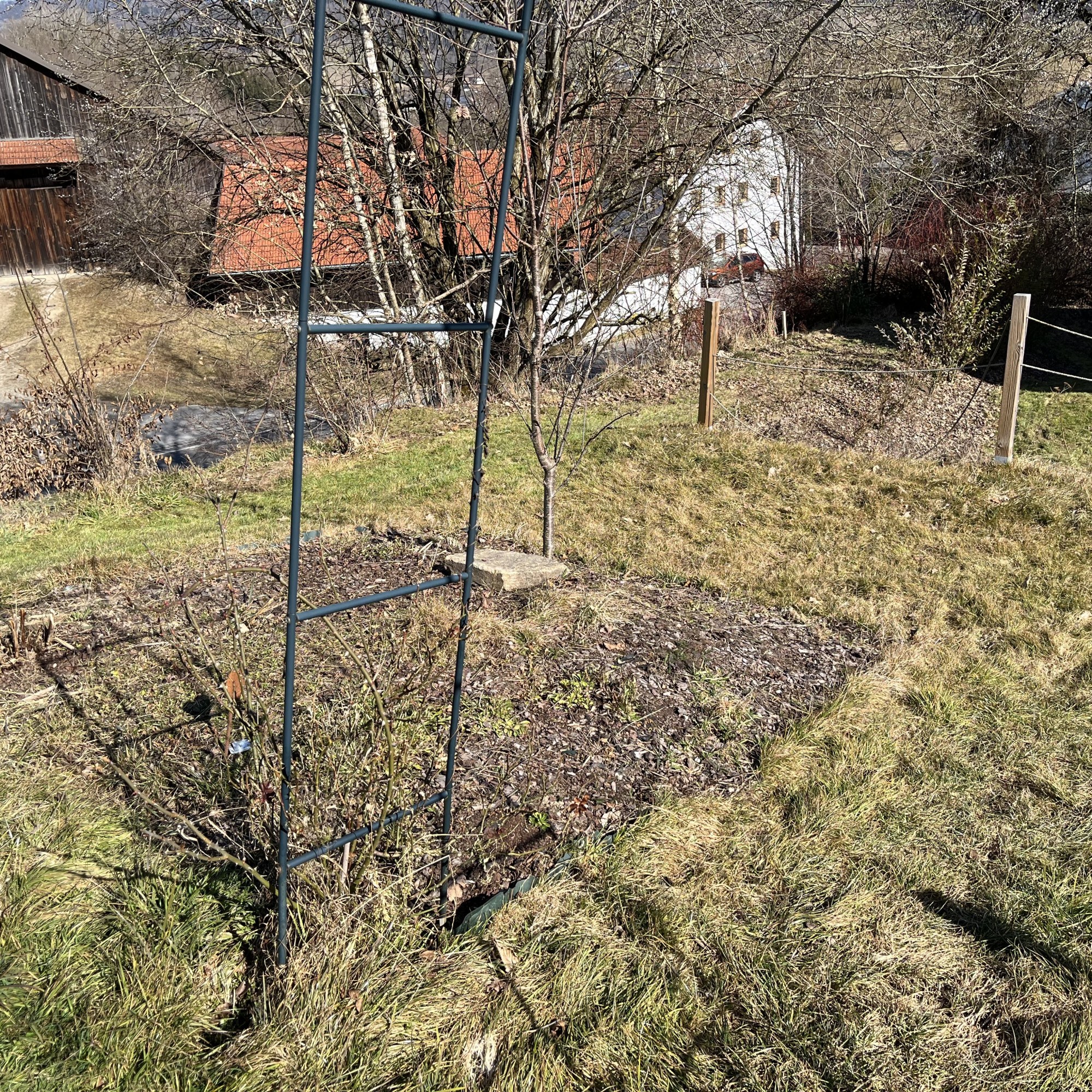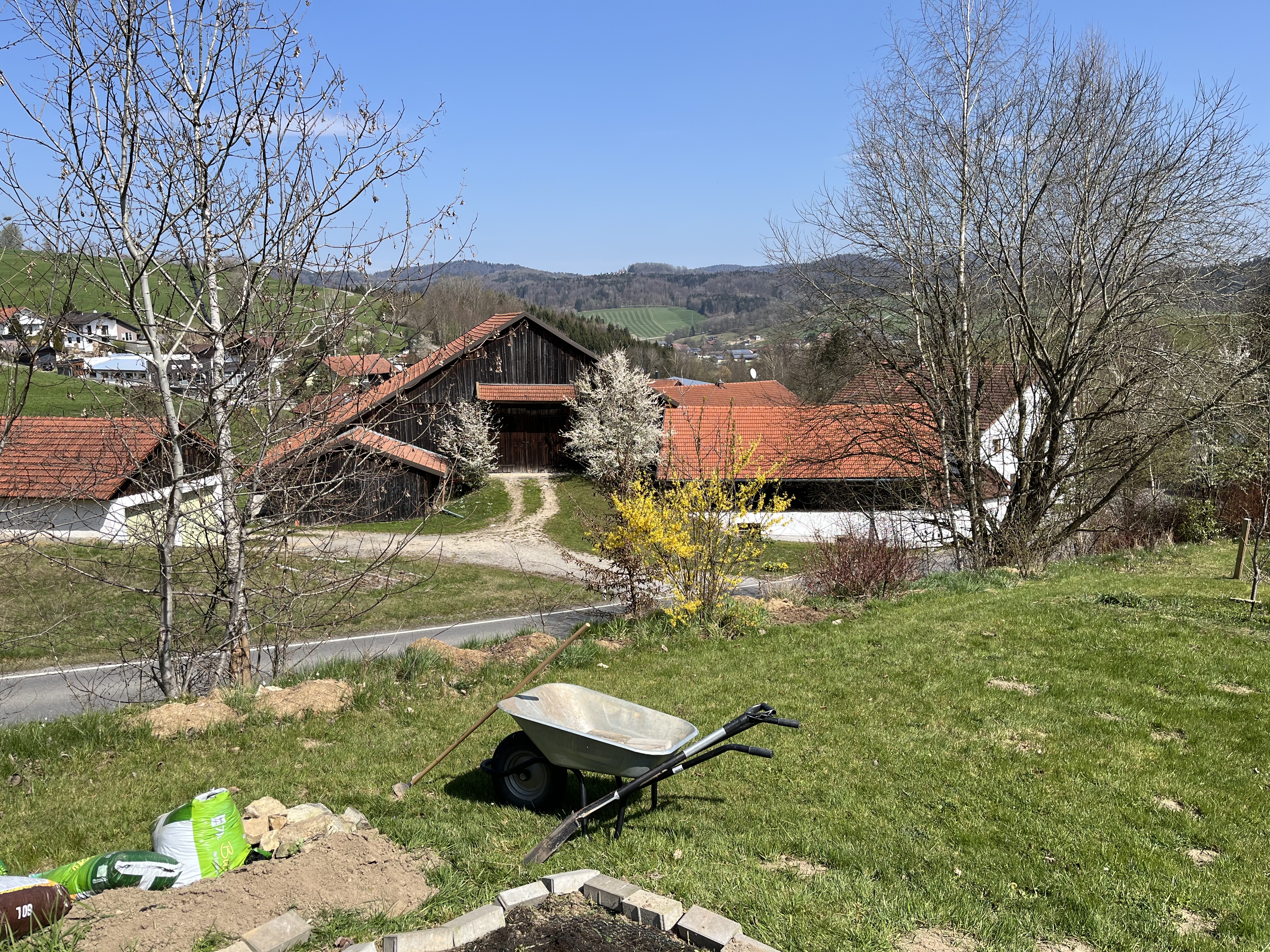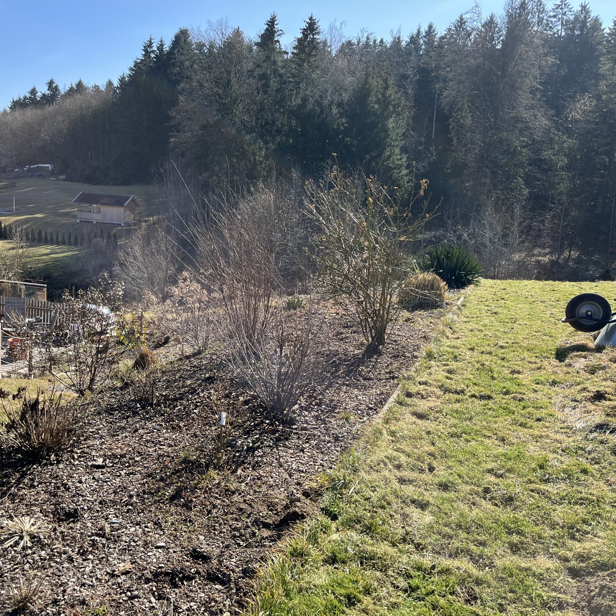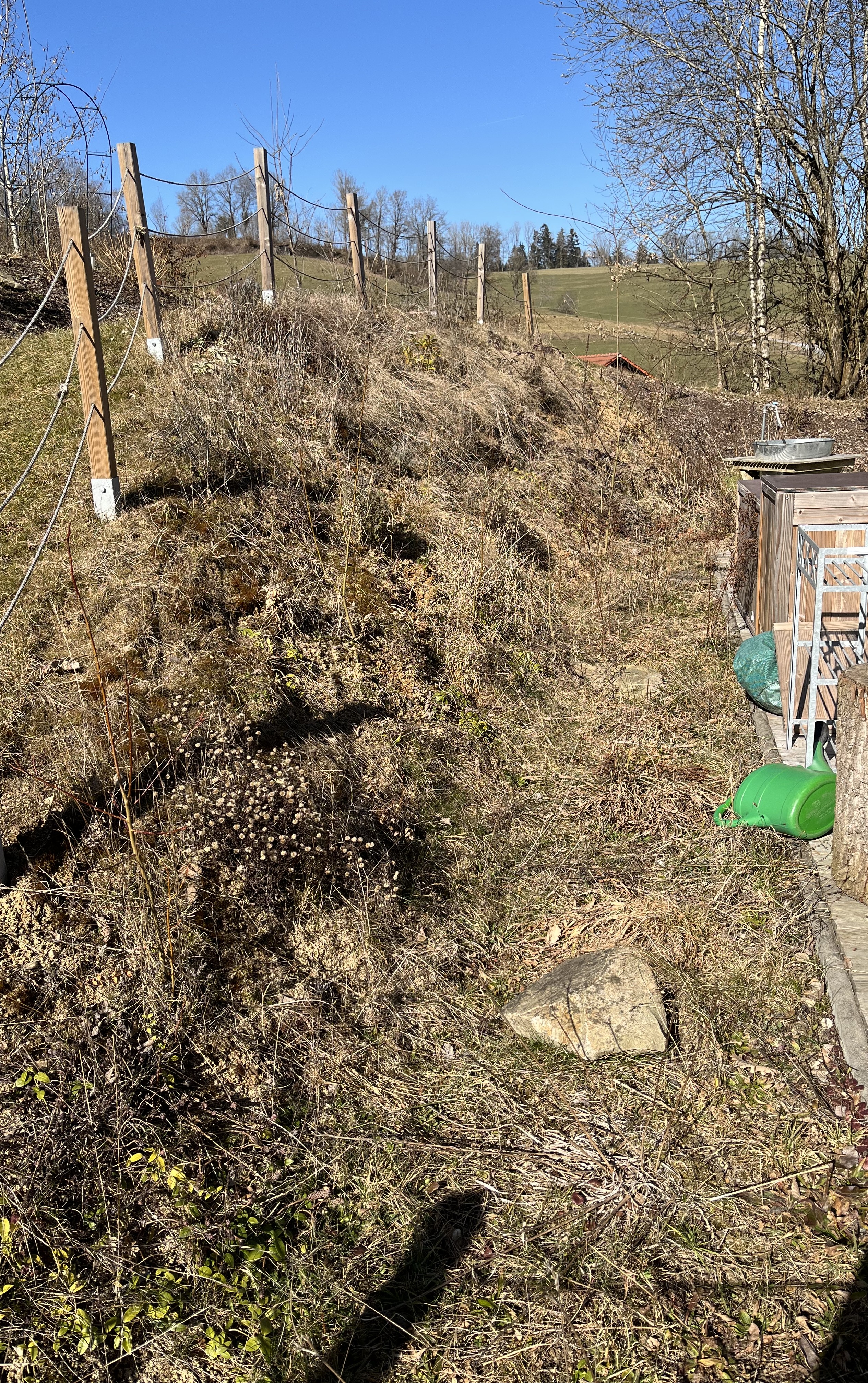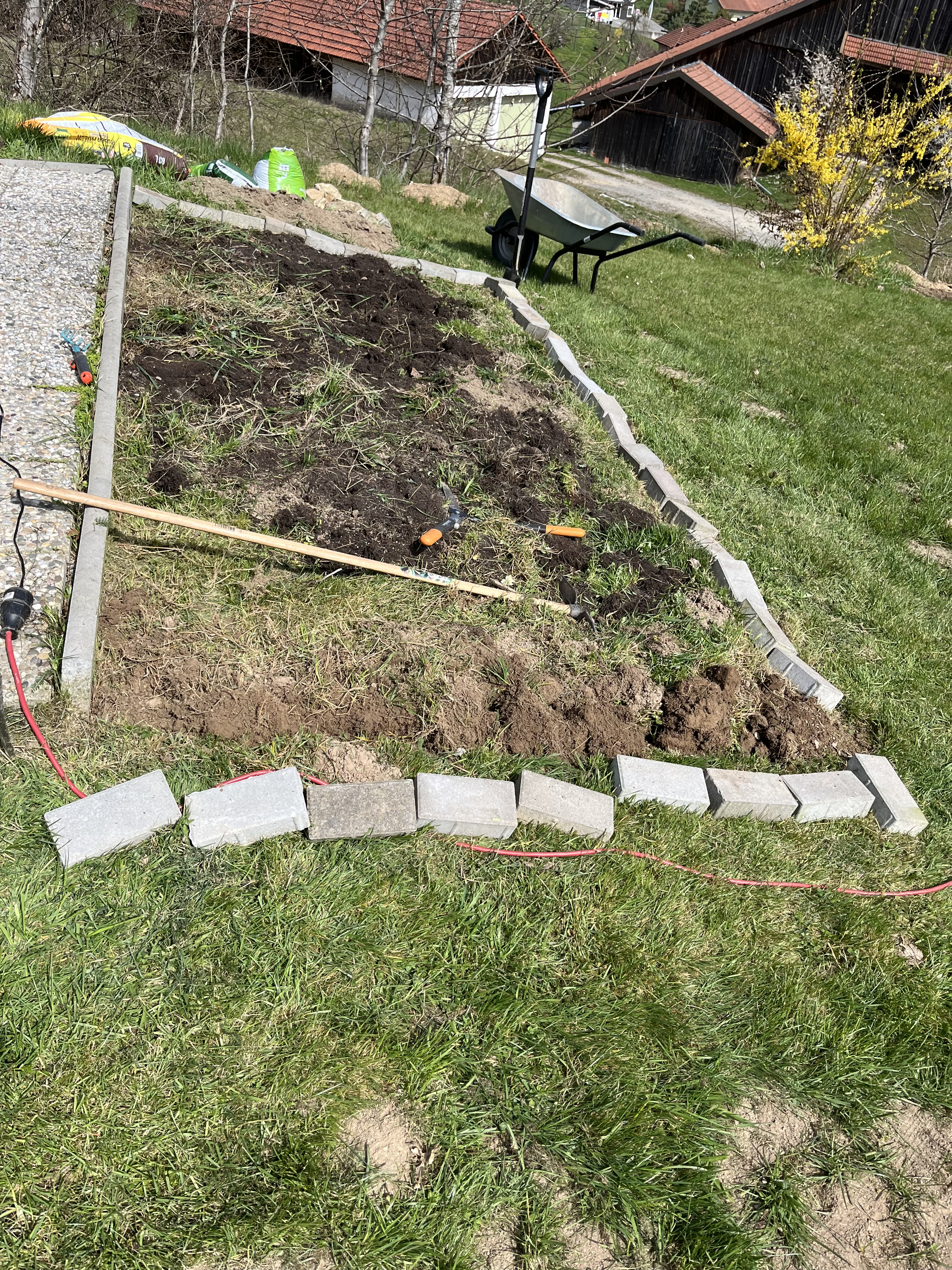 While weeding the flat section in front of the slope, I suddenly had an idea. I’d plant the Passauer Pomeranze there and then plant scented herbs in front of it. I am waiting for the delivery of the Pomeranze but already planted Rosemary and Thyme as well as Bayleaf.
