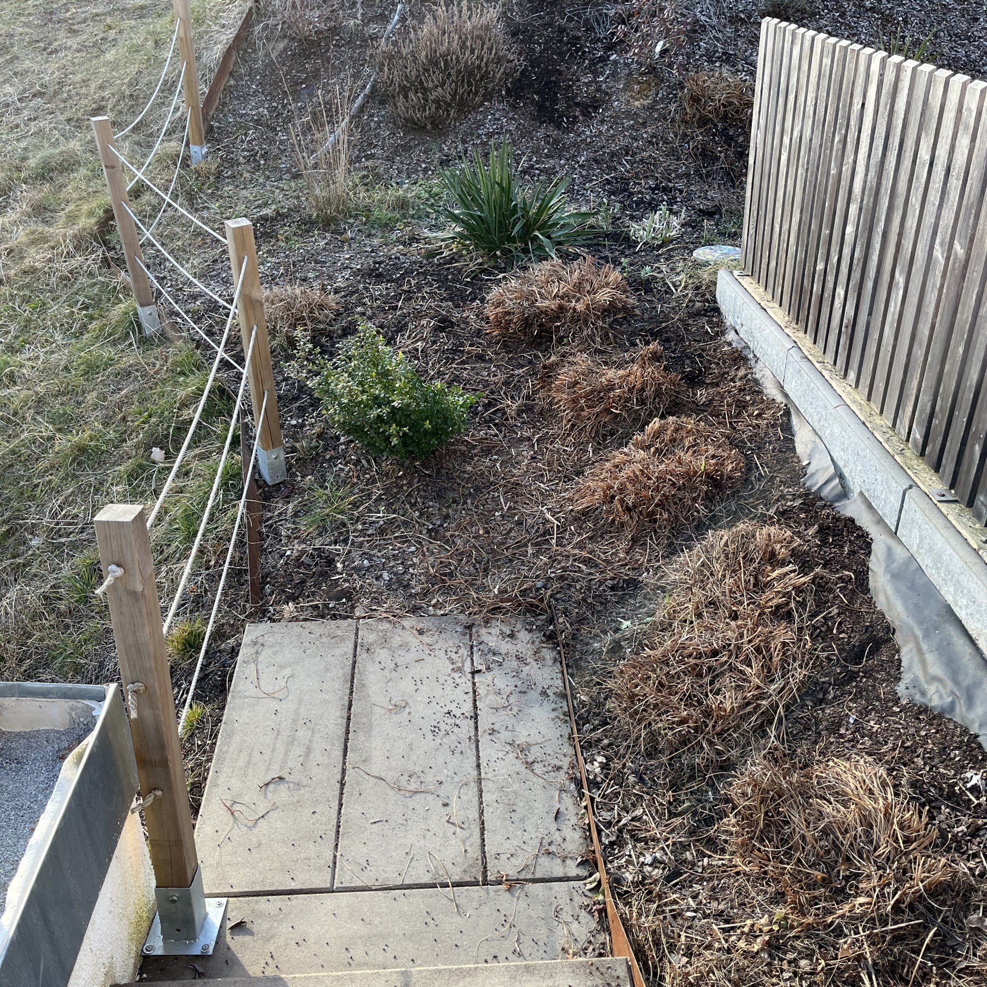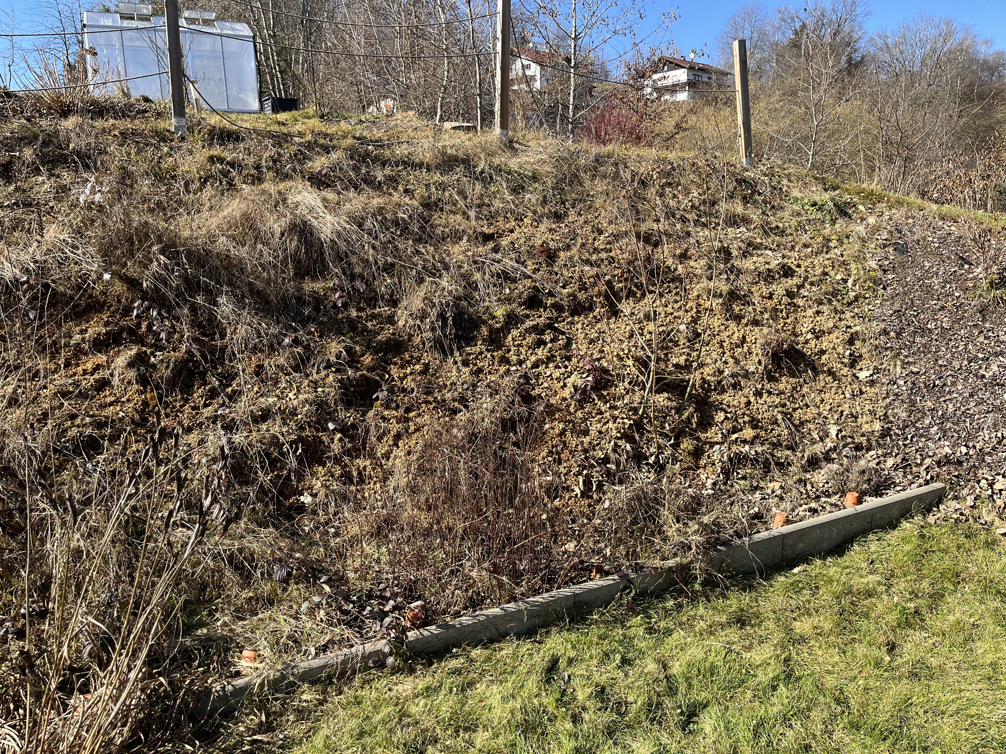 The next step in finalizing the slopes is all on my shoulders. The way the slopes were formed, there is a kind of a ramp leading up from the terrace to the first level. On that first level, there is what feels to me like a natural pathway. The previous owners had planted a couple of plants on this flat area, which did not belong there (the wrong soil and the wrong amount of sunlight, i.e. too much). These were either tossed because they were dead or were transplanted somewhere else on the slope, leaving a flat area that really does kind of invite you to walk on it.