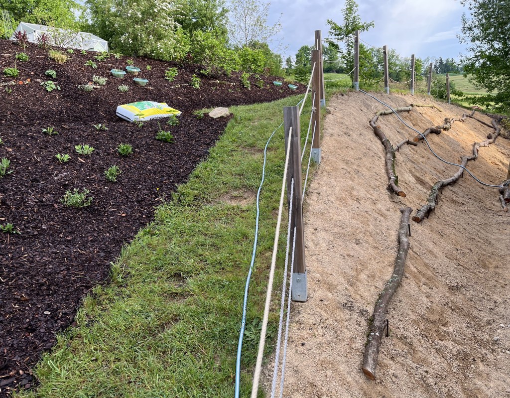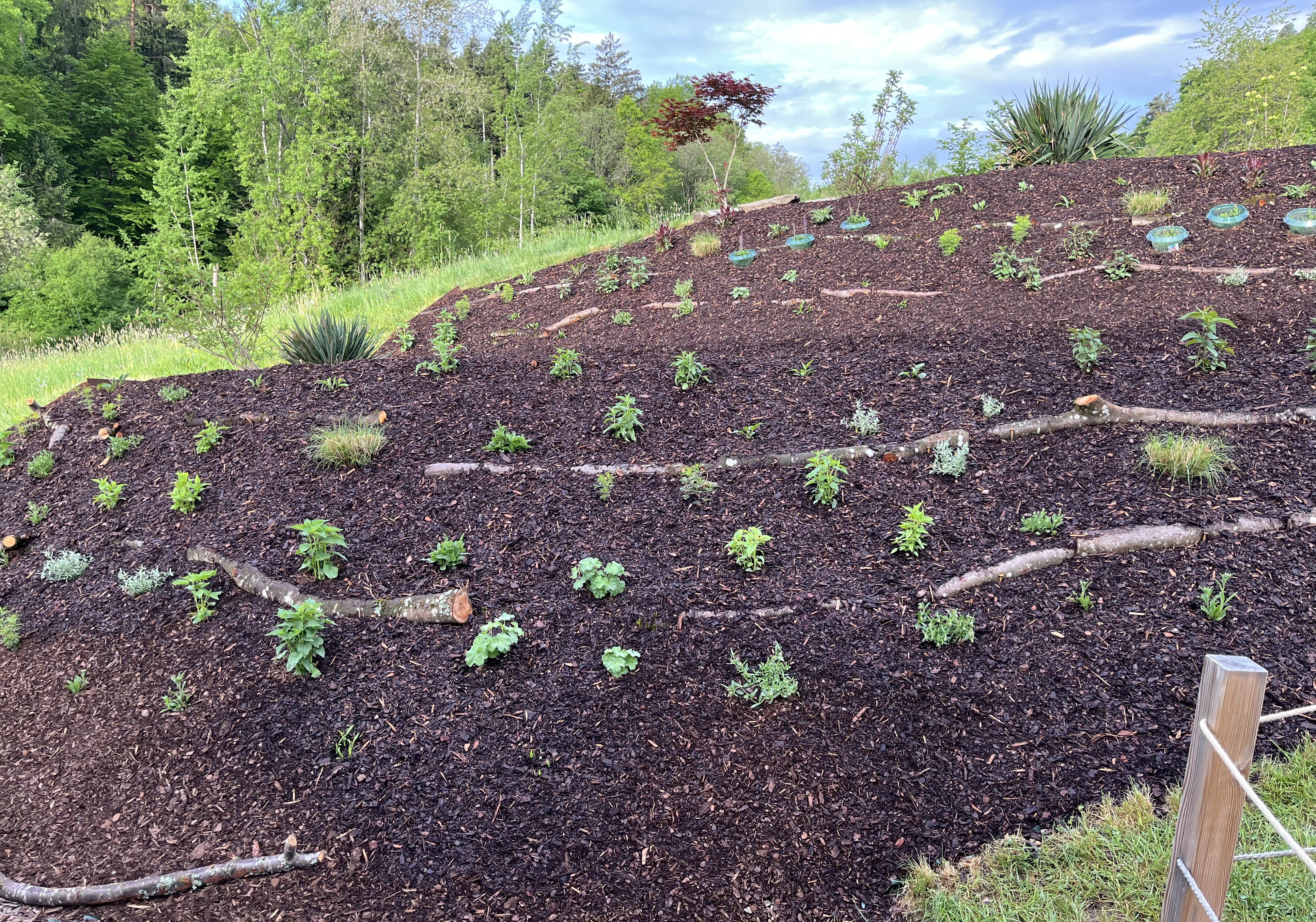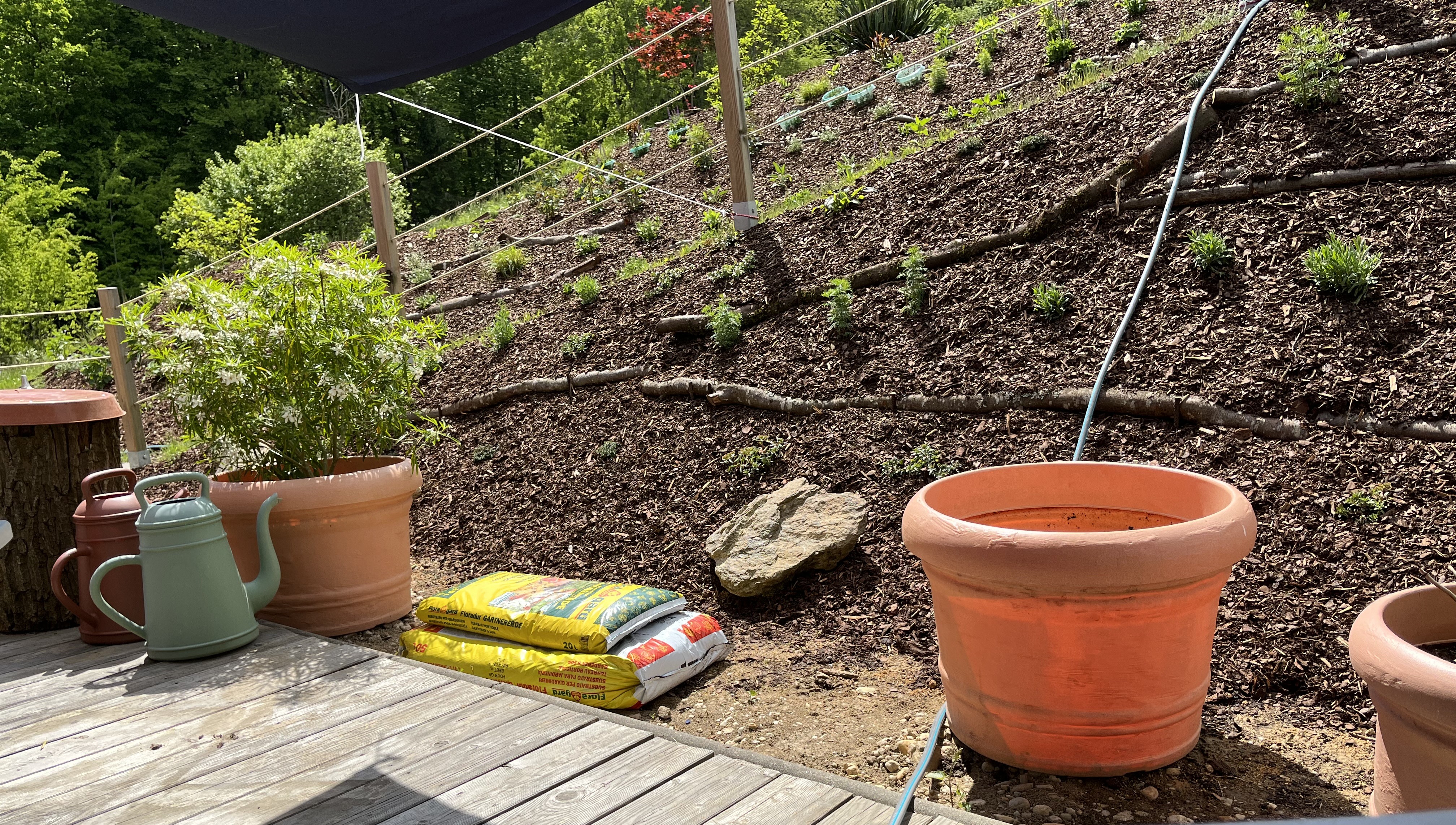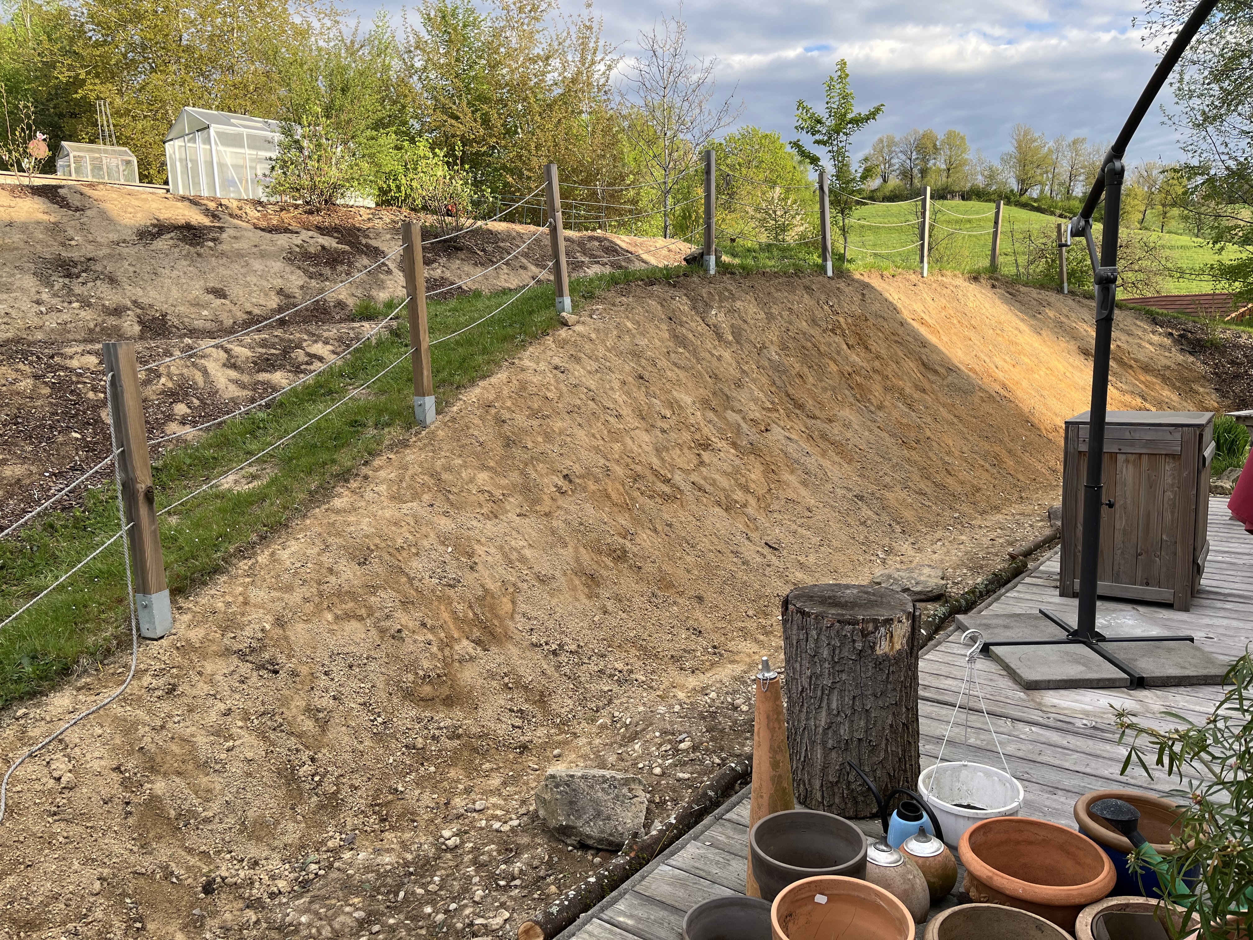 The final slope, the one immediately next to the terrace, still has to be planted but the tree branches have been put into place.