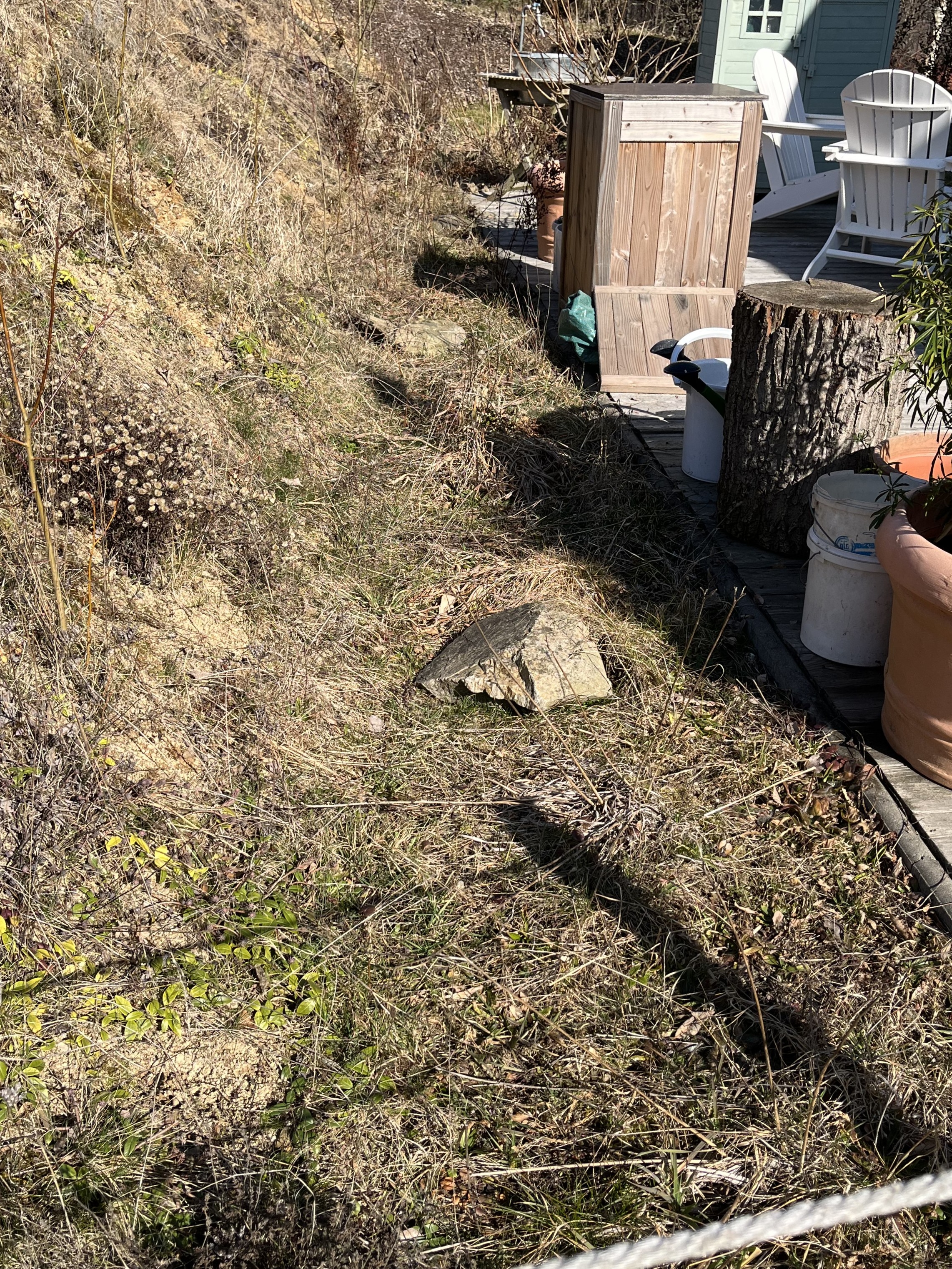 The really pain-in-the-neck project will be the first slope behind the terrace. It looks just awful. It is so steep! I will have to get really creative with how best to deal with it. Certainly, come September, I will be planting crocuses, snowdrops, and daffodils so that come this time next Spring, it will be covered with little dabs of color. It is the getting there that will be tough. Here is what I am up against. Any ideas?