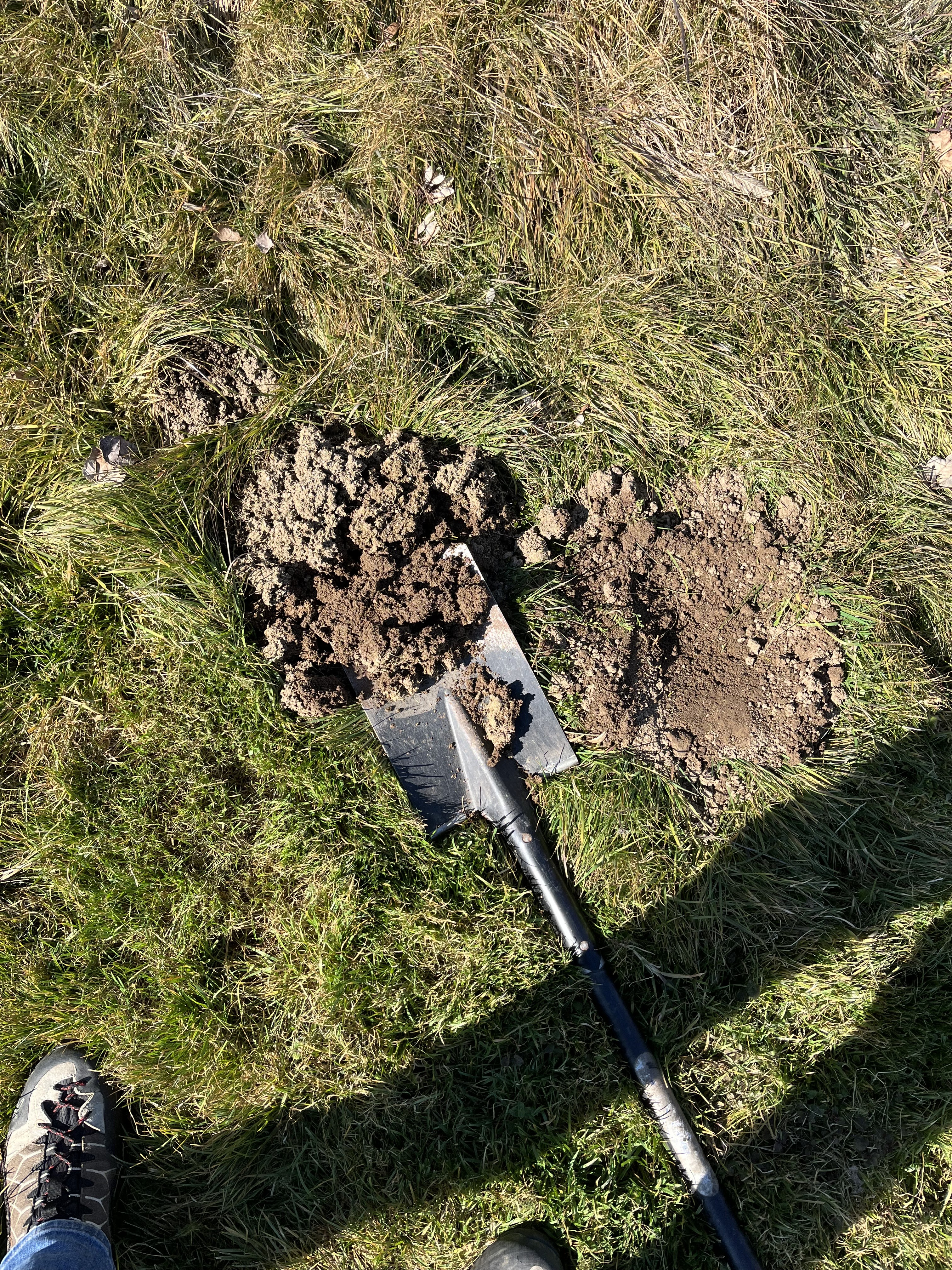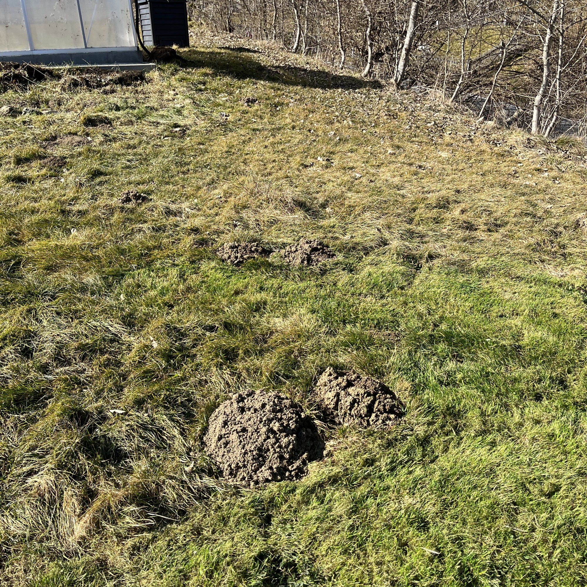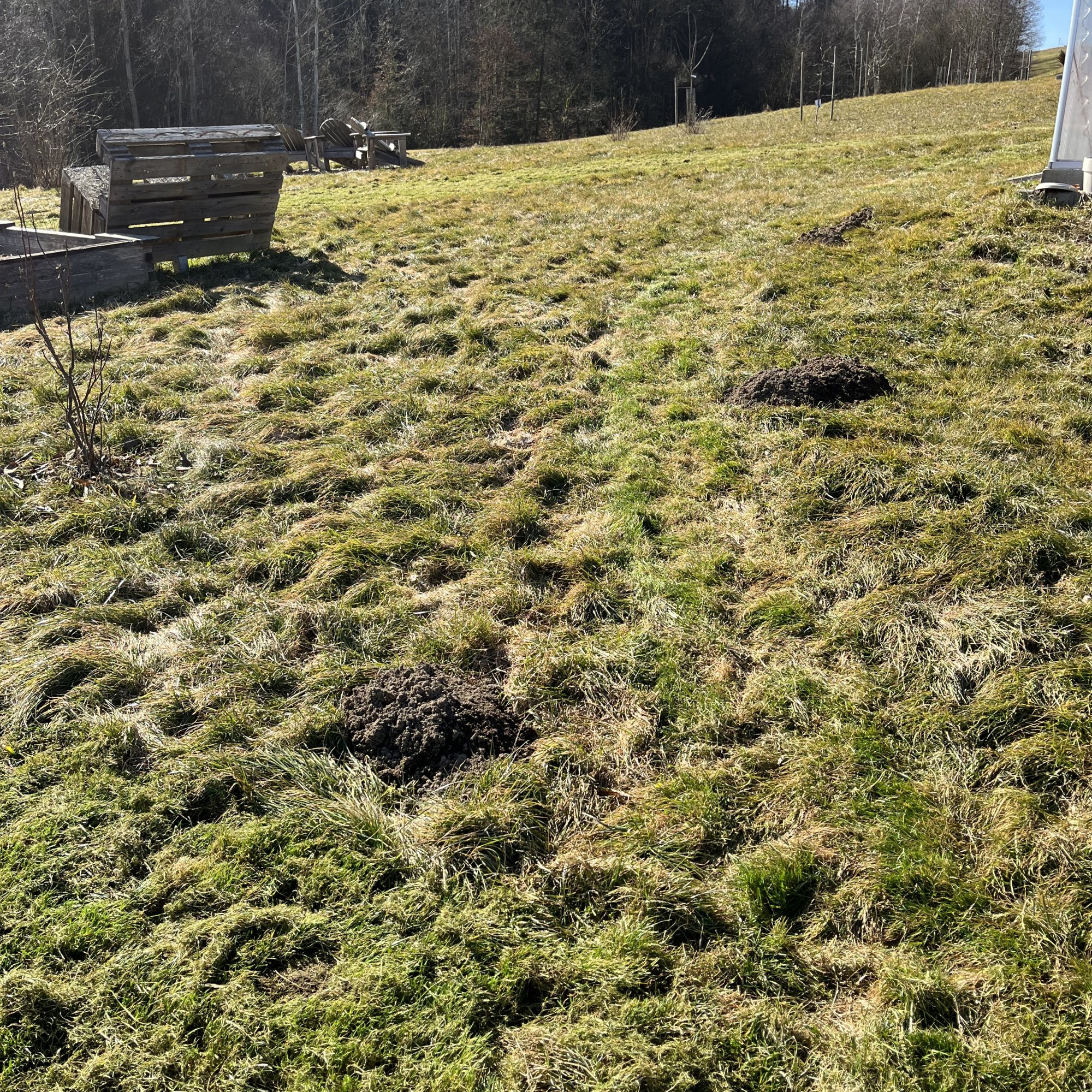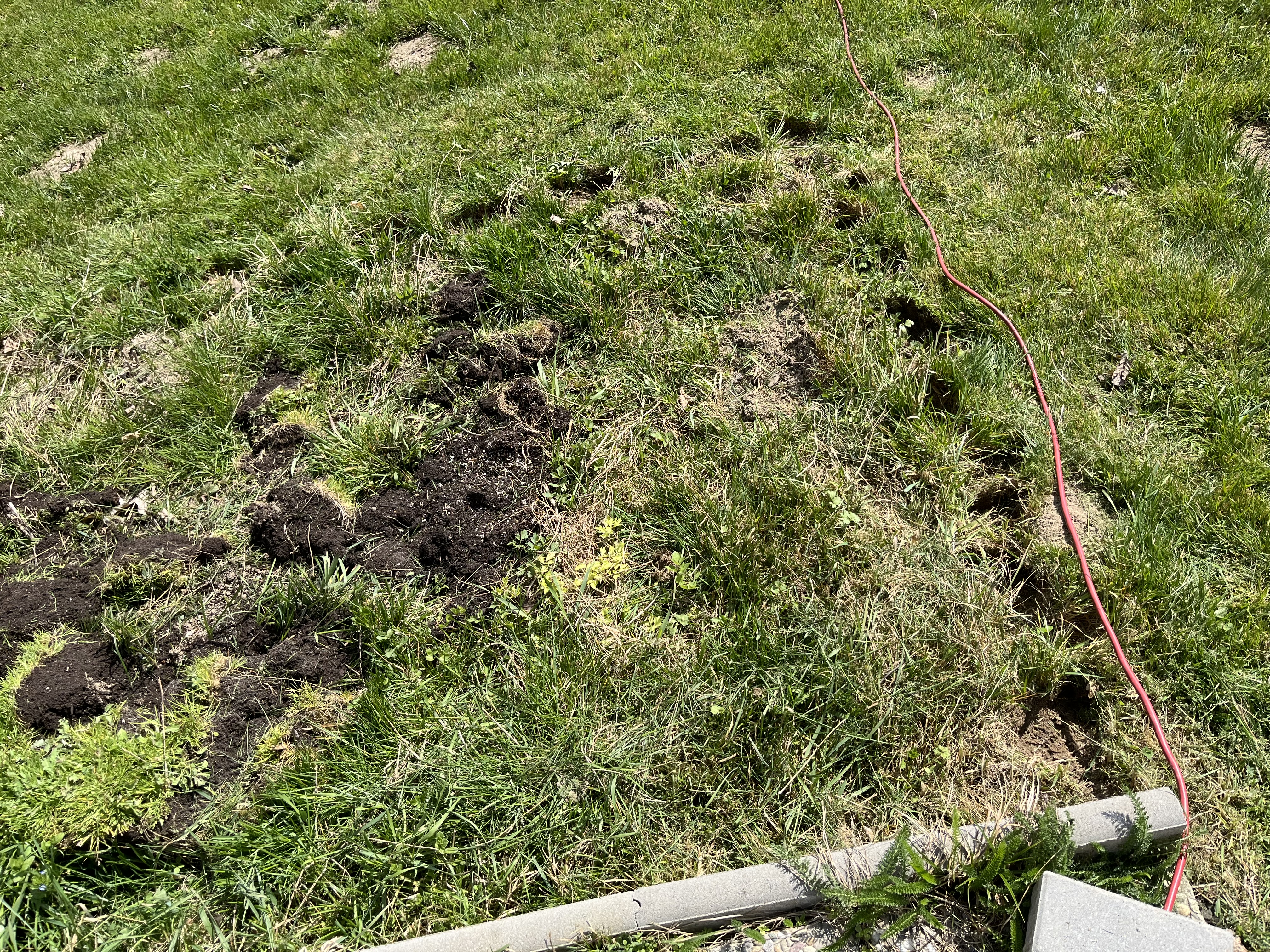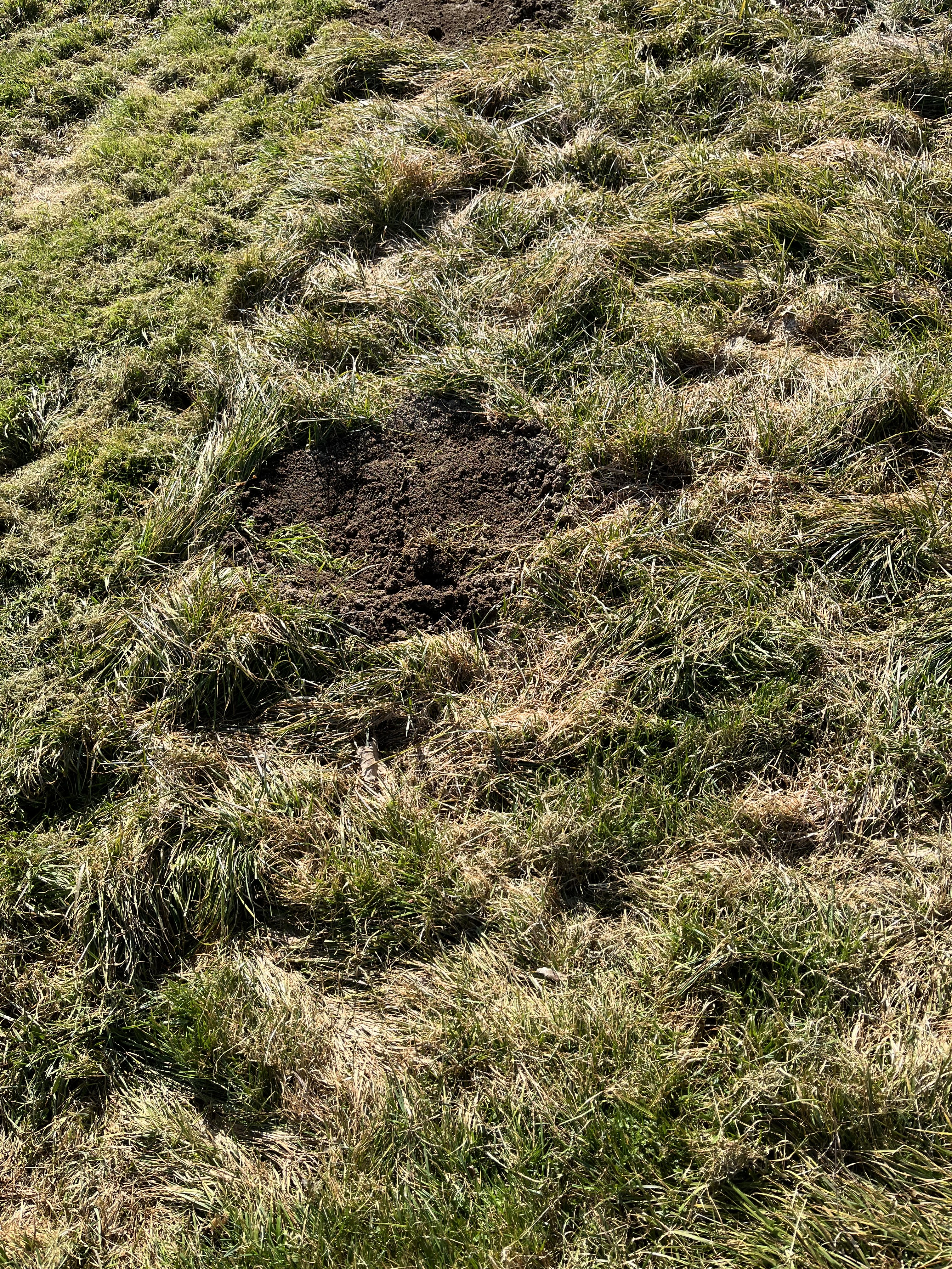I had to start with removing the dirt piled up by the moles. We had little mole hills all over the lawn. They seemed old-ish. And, further up the hill, there are a lot of mole hills; so, I’m hoping “our” mole has moved on. Anyway, first I had to gather the piled up dirt and dump it some where (next to the greenhouse). I didn’t pat down the mole hills because they say, if you do that, the moles will just open it up again. So, I tried to pat down the soil enough so that the lawn mower wouldn’t get caught on it.