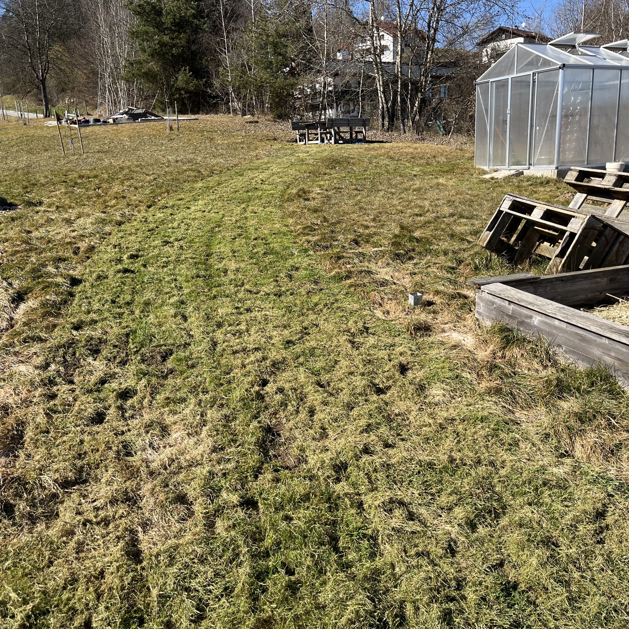 And, that’s my task for today as well: to continue mowing the lawn. I finished the east side of the house relatively quickly. The north side is also cut but will need to be recut to yet a shorter length soon. The hard part is the big meadow in the upper part of the garden. I had to get more gasoline yesterday and will continue mowing as soon as it gets warmer.