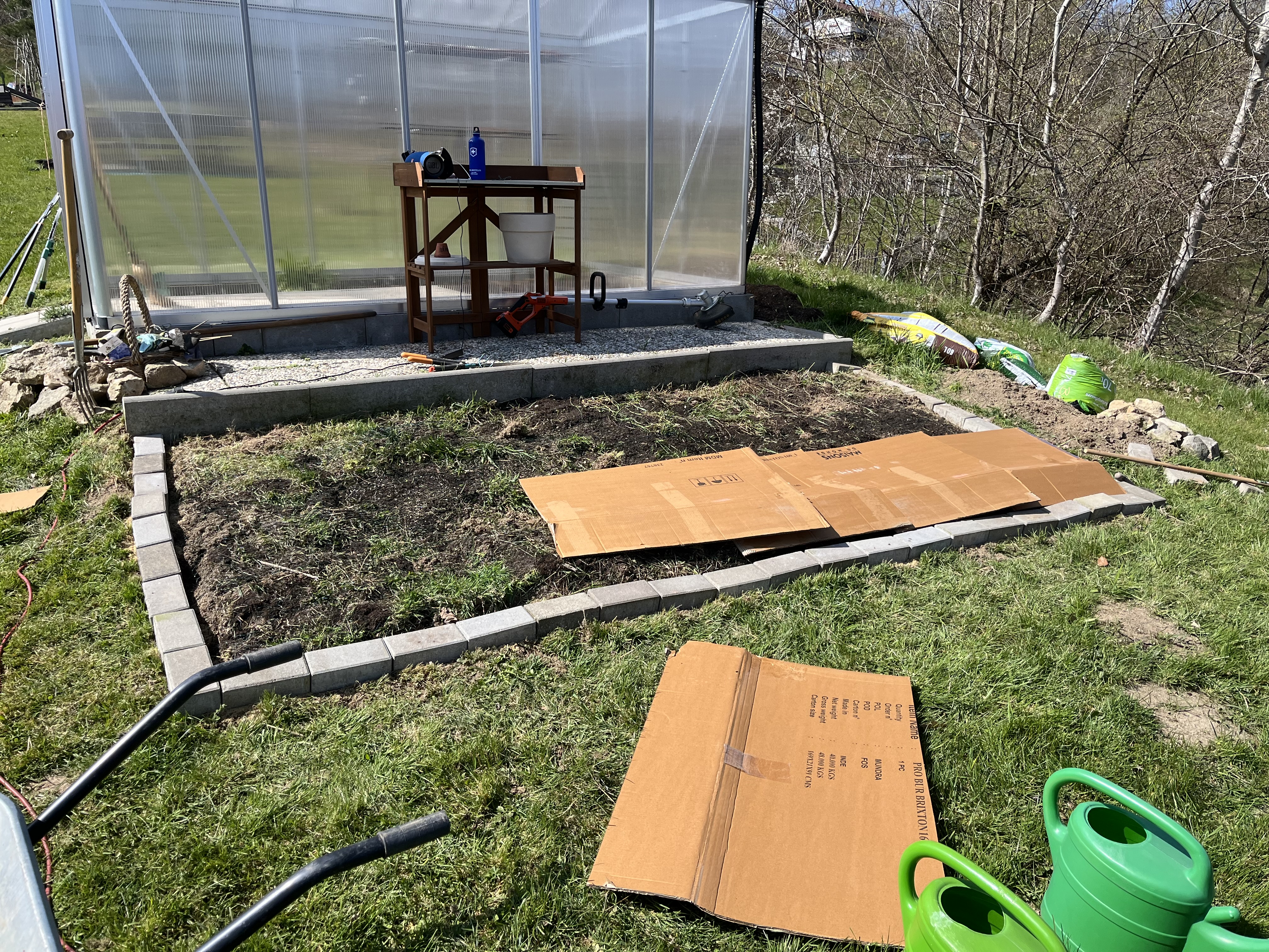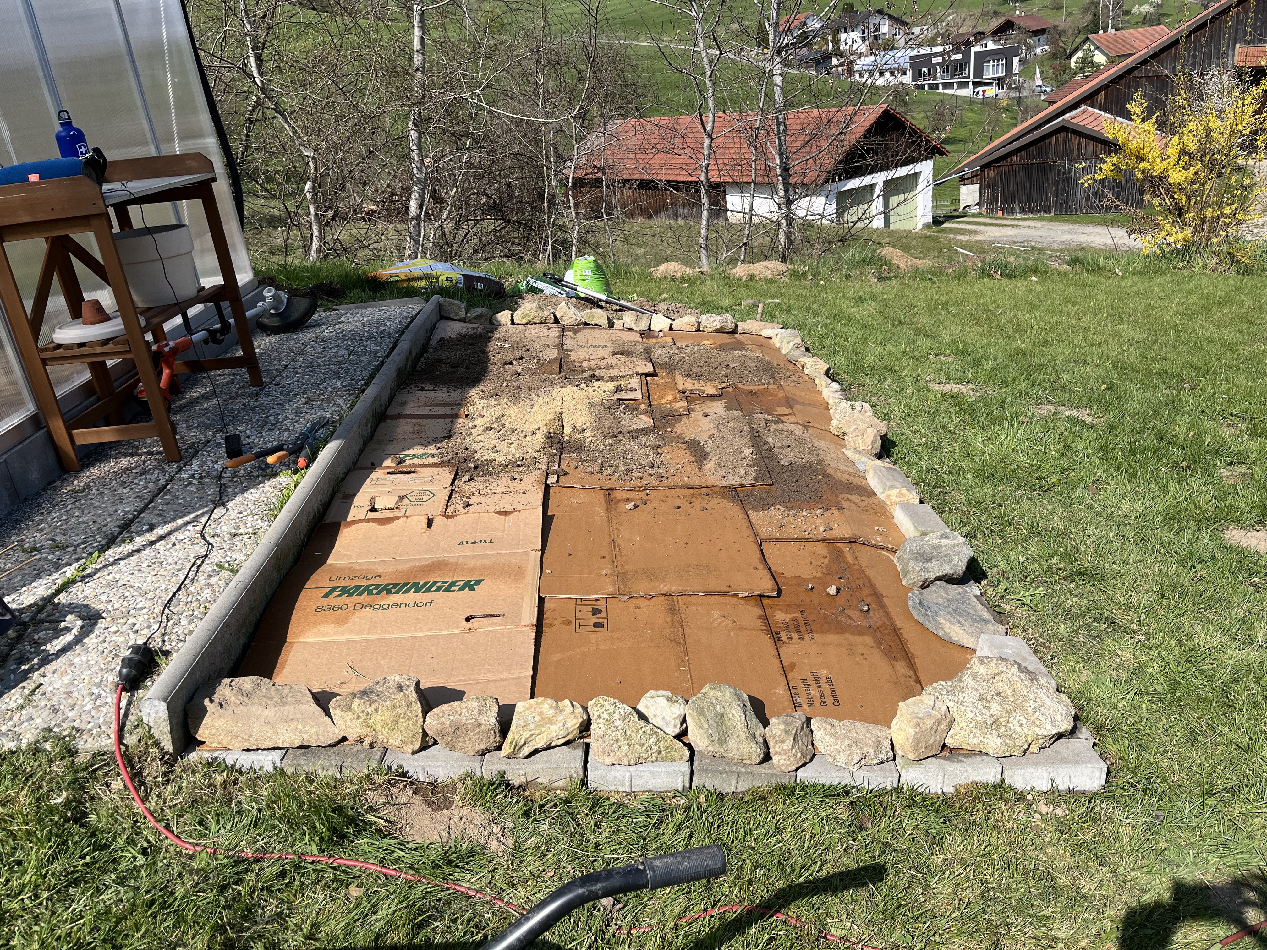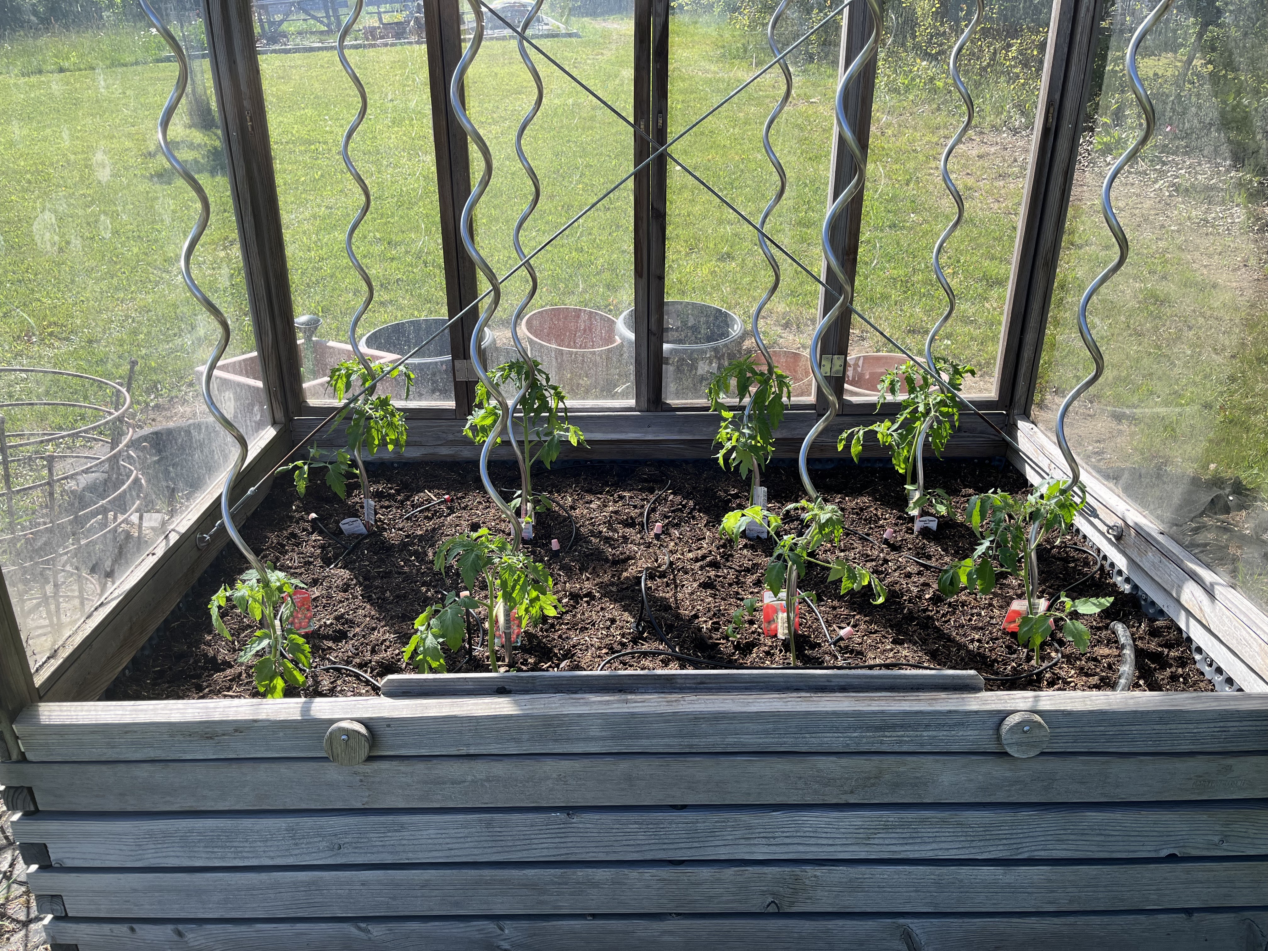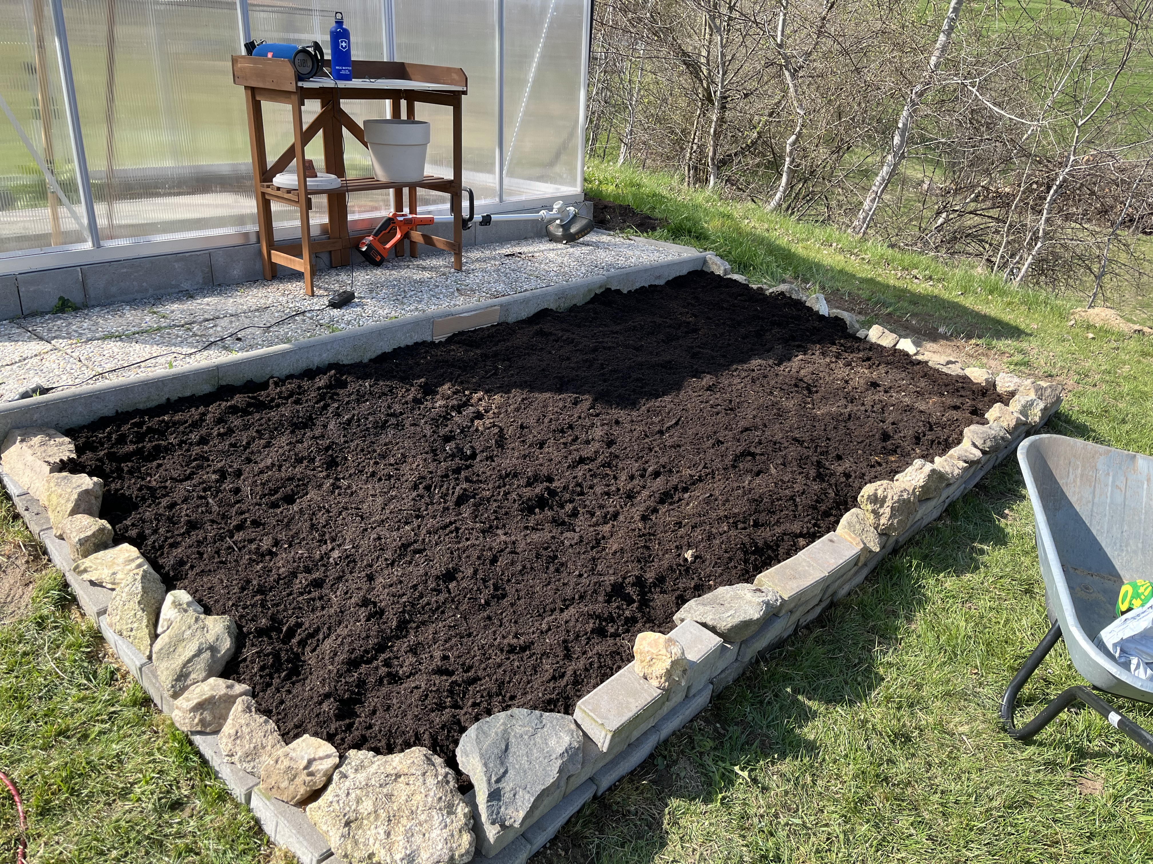 A good 12 of the sacks of soil were used up in the tomato greenhouse, which we brought with us from the old house. Because of the property’s steep slope, it was important to make sure the greenhouse was level. The meant, the greenhouse was flush with the ground in the back but stood a good 10-20 cm higher than the ground in front. And, that meant using more soil than in the past. I was kind of surprised how much more was needed to make up for the slope. I tried to fill the gap under the tomato greenhouse as much as possible with paving stones and various rocks I found on the property. It looks kind of funny but it worked. And, the tomato plants are in: 3 plants for “sauce”, 3 plants for salads, and 2 cherry tomatoes. We also installed the watering system and will be programming it shortly.