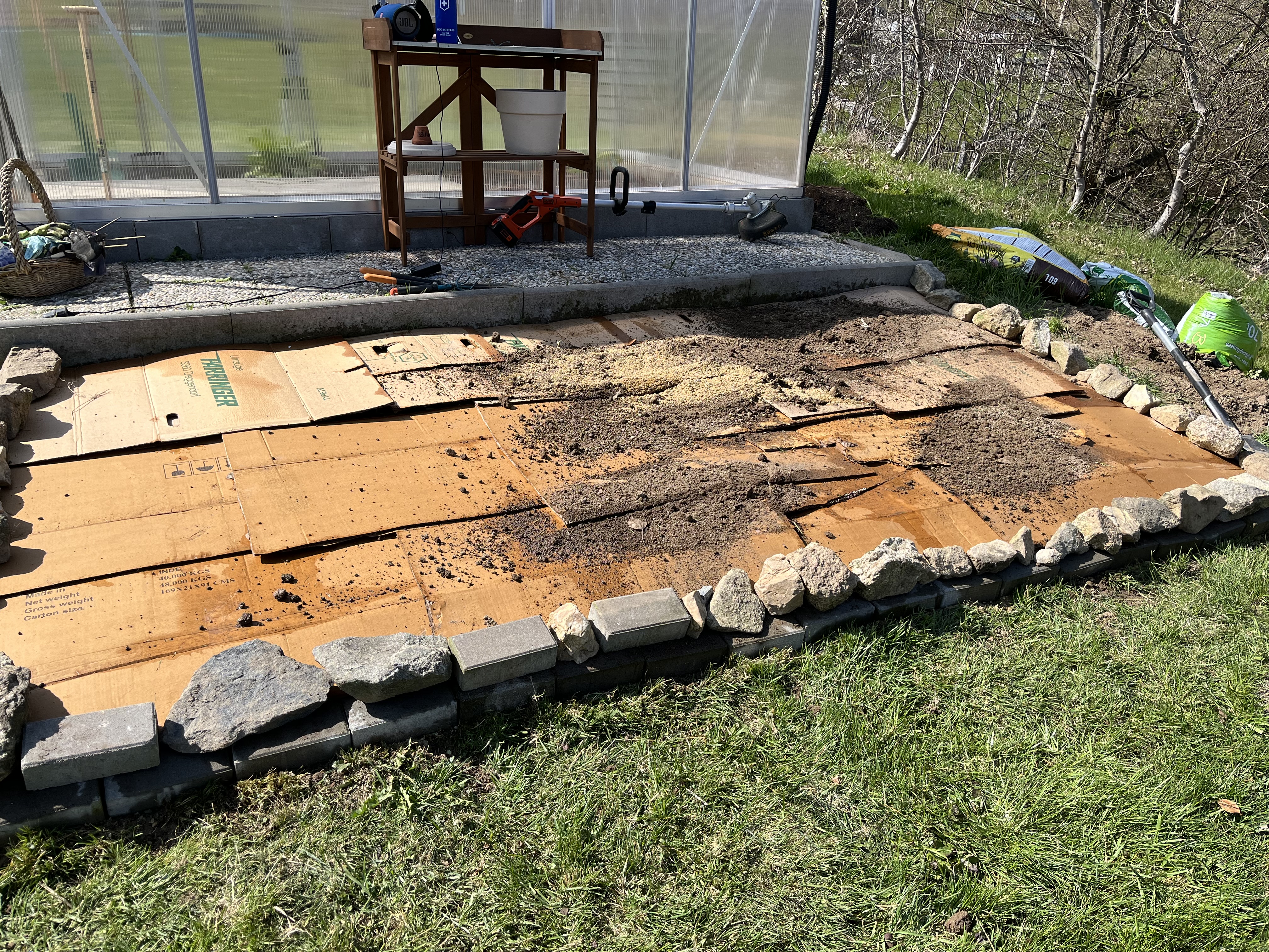 Thanks to my husband’s help (and muscles) we transported about 30 bags of soil. Twenty-two bags are already distributed and, once my back is better (heaving too many sacks of soil killed my back for a bit), I’ll distribute the remaining 8 bags. This will hopefully be enough to fully fill the flower bed in front of the greenhouse.