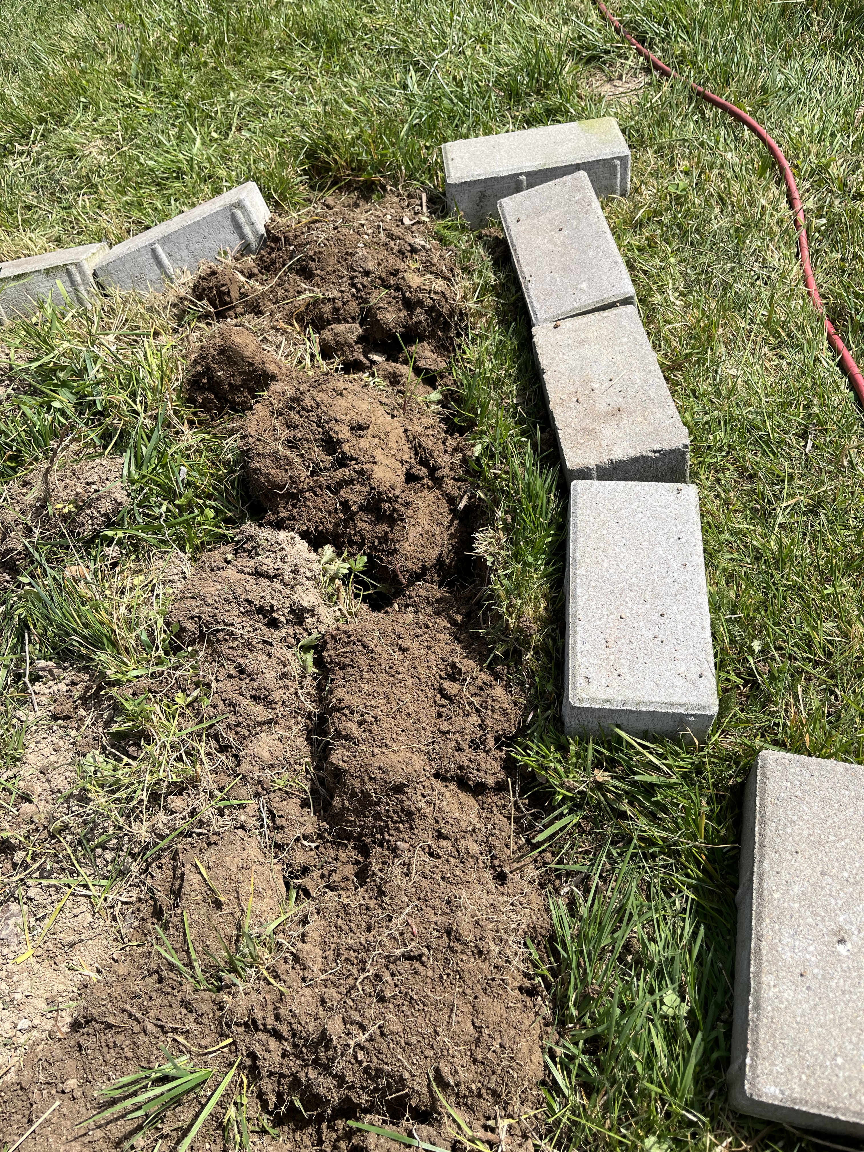 Using the outlines of the existing bed, I first dug a makeshift trench around it to make room for border stones, thinking this might make things easier vis a vis mowing the lawn. I had used this approach for a bed I created back in our old garden and it worked well there.