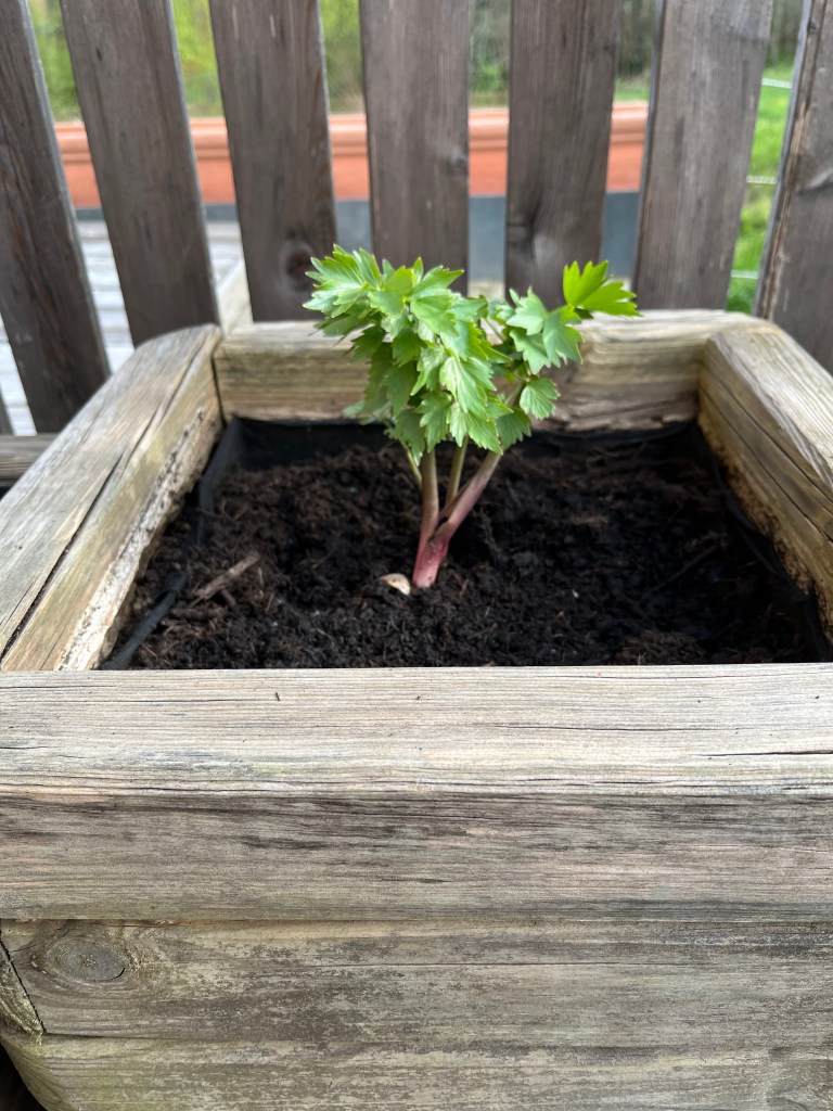 I’ve mentioned before that there is a gardening rule of thumb in Central Europe: don’t plant potted plants or frost-sensitive plants before mid May, before the “Eisheilige” (translation: Ice Saints) are over. From May 12 to May 15th, there is often a cold snap – including hardfrost – that catches up gardeners who have planted too early. In some years, no frost or cold snap comes; in some years, it is a bitter bitter lesson. You just never know but you know that there is a risk if you disregard the rule of thumb. I am checking the long-range weather forecasts to see if I can gleen a sense of how the weather will be before I start planting a lot of things on the terrace. I have some fleece I can cover plants with overnight but not enough to cover everything. So, I am only slowly starting the plant things in pots. My neighbor came by the other day with an herb plant I had never heard before – such a nice thing to gift me a plant from her garden! The plant is called Liebstöckel in German, or Lovage in English. My mother never had this in her garden and I had no experience with it. But, my neighbor says you can use it kind of like parsley and sprinkle it (mostly) over soups. The leaves taste savory, kind of like salty celery. In any case, it is the first herb to be planted so far!