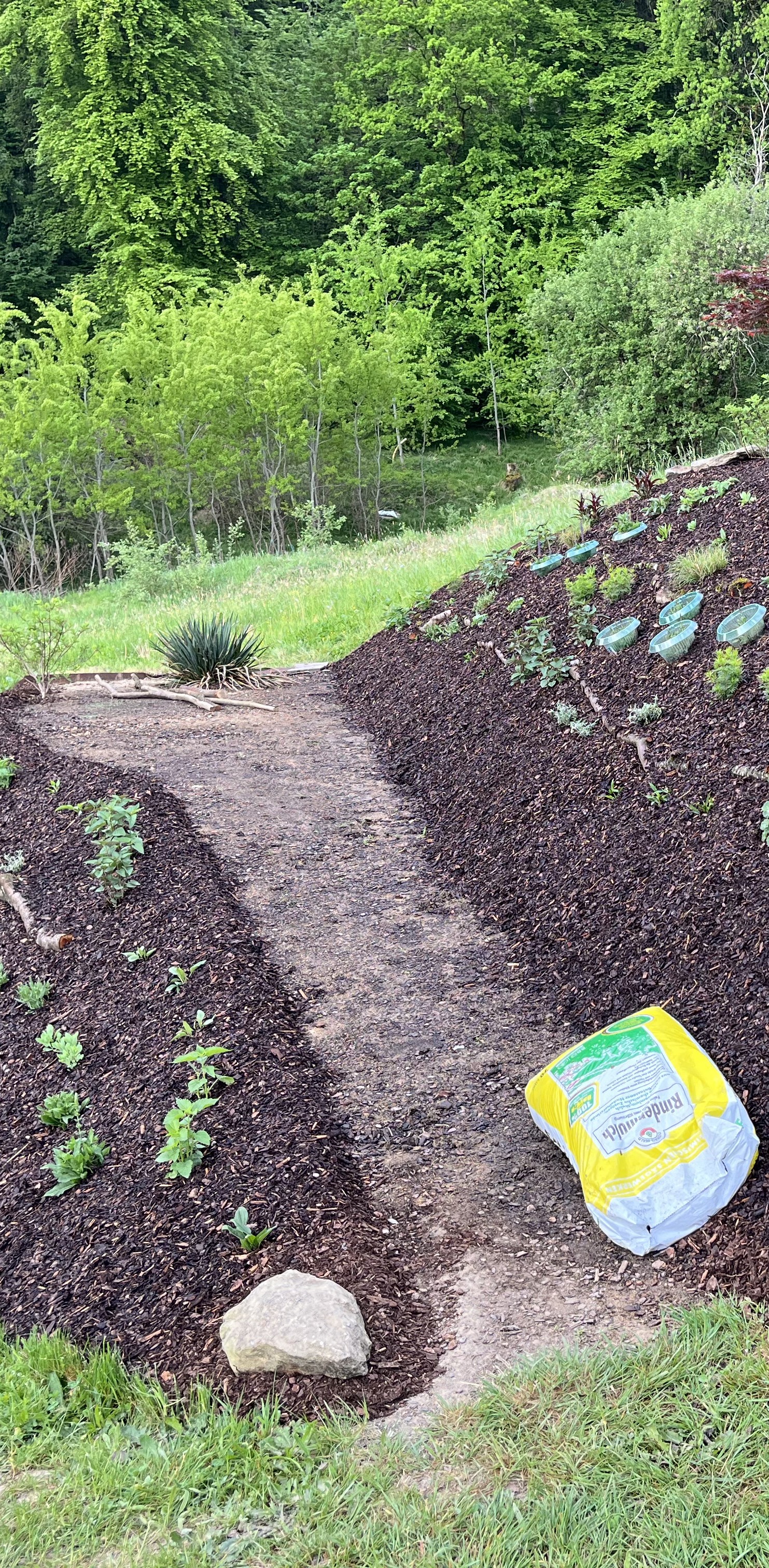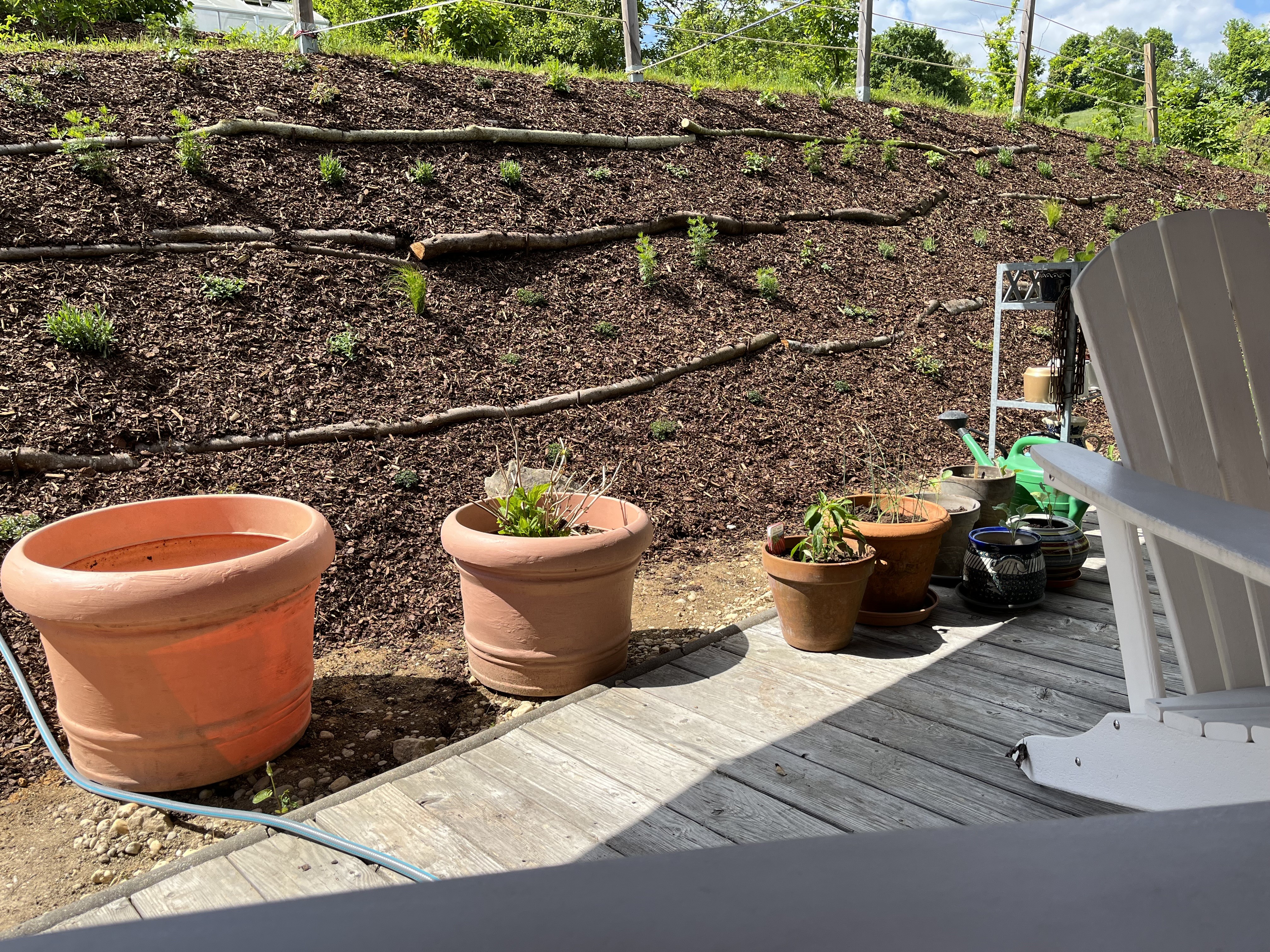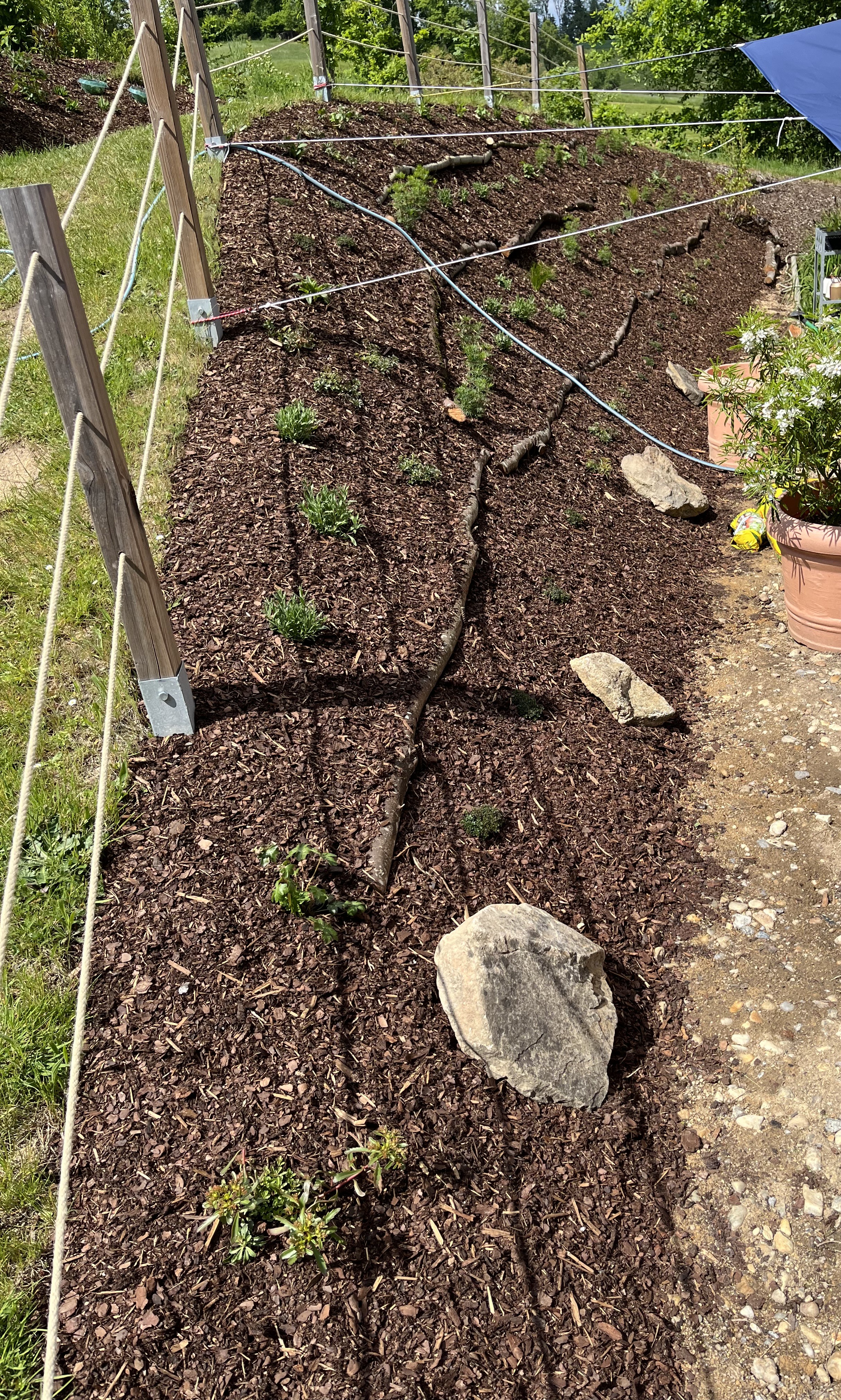 The plantings and mulch are held better in place with the help of branches cut from the trees felled a few weeks ago. When a strong rain comes, the hope is that the horizontally-placed branches will help to avoid serious mulch erosion. They will, of course, start to rot and degrade after a few years. By the time that happens, the plants will definitely have established themselves and grown into their allotted spots so that most (hopefully) of the mulch will be covered with green-ness. At this stage, it is a brown hill with spots of green and the goal is to have a hill covered with green leaves and colorful flowers with spots of mulch below. Gardening requires patience. In any case, we are really pleased with how it turned out.