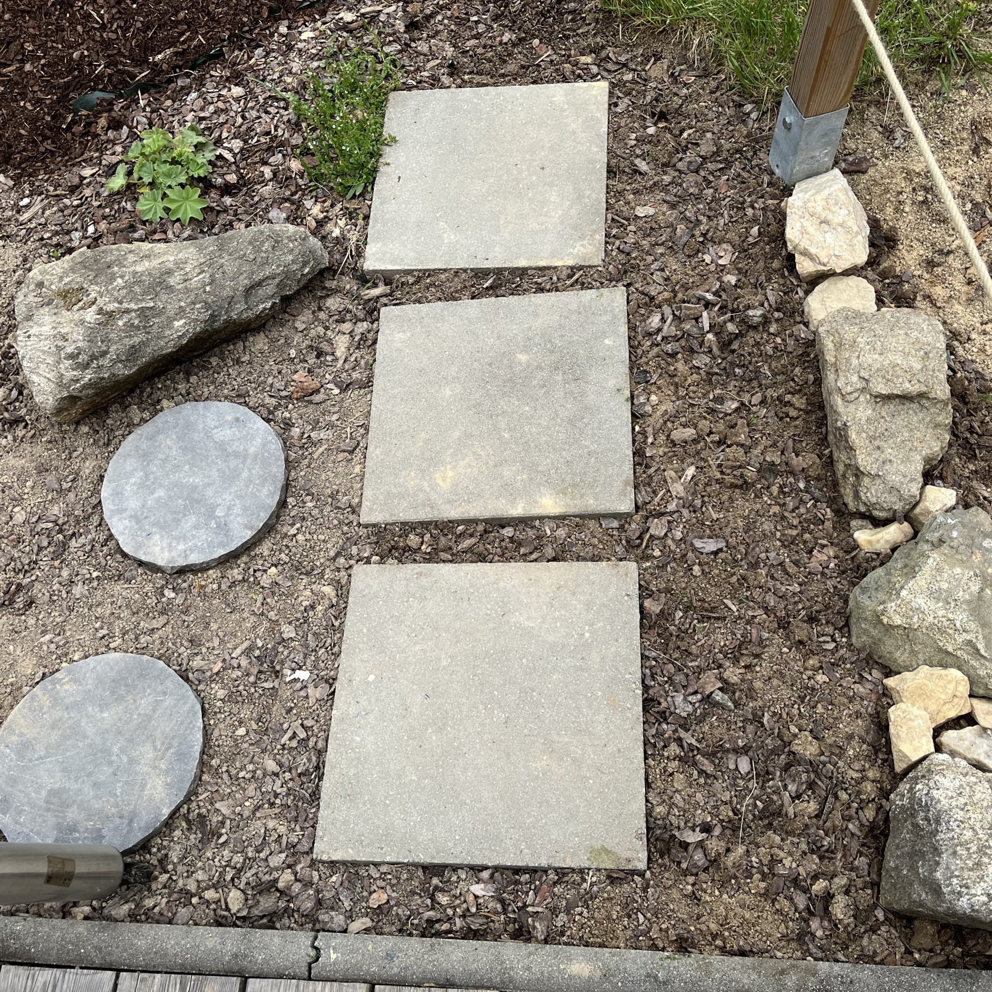 So, the idea is to use the natural paving stones, which we schlepped with us from the old house, to make a kind of patio at the end of the path. First though, I need to buy and plant a tree (a Cornus kousa variety is my current choice) at the end of the path, just to the right of the little Yucca plant you see in the photos. Once the tree is planted, I will lay the stones around it and along the pathway as far as I have stones.