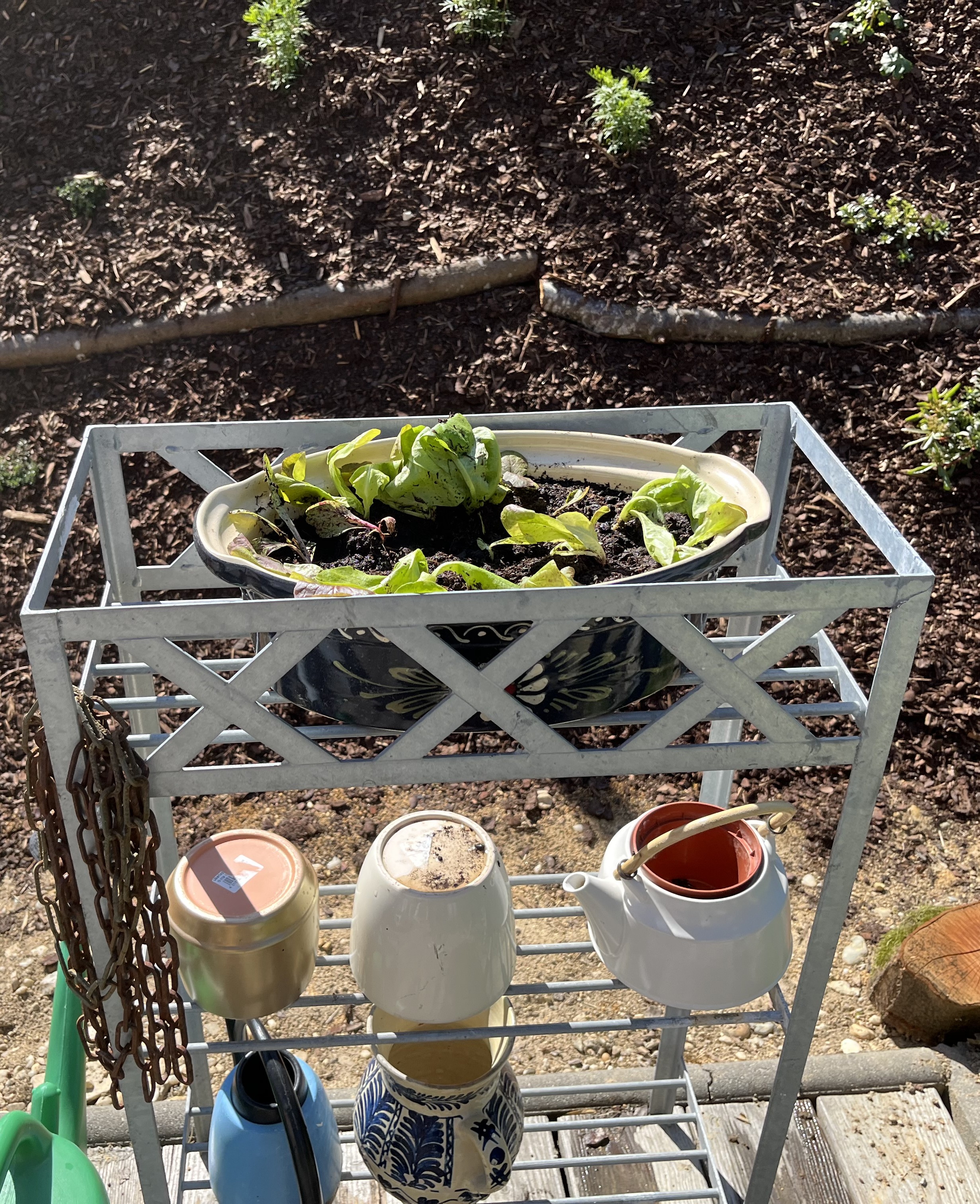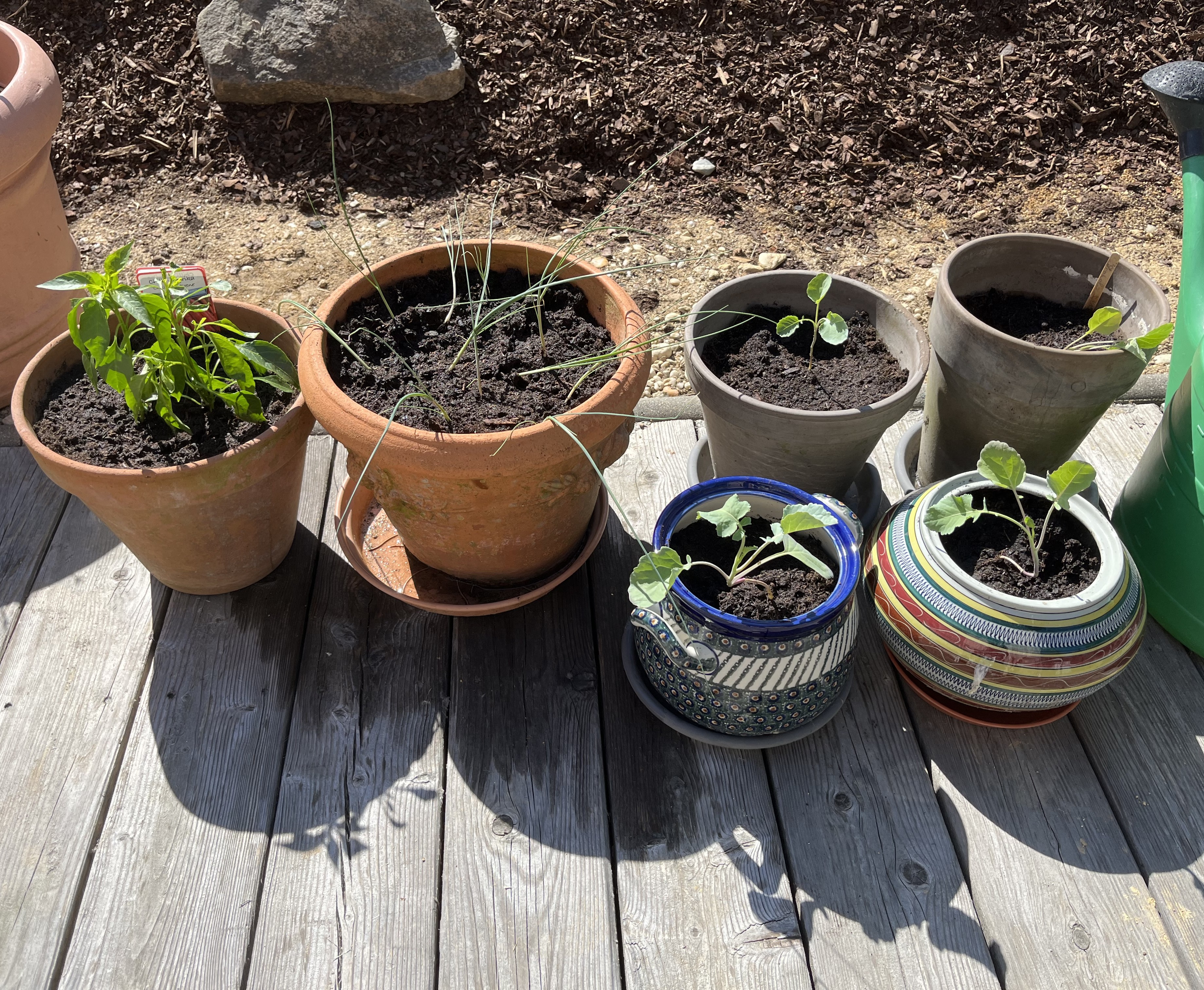 Motivated by that, I decided to use this first year without raised beds to experiment with growing veggies on the terrace. A neighbor of mine, who had more plants than she knew what to do with (she is also an inspiration, collecting her own seeds and growing from seed) and offered me some of her overflow. I used some of the more decorative planters I have and created a veggie “garden” on the terrace.