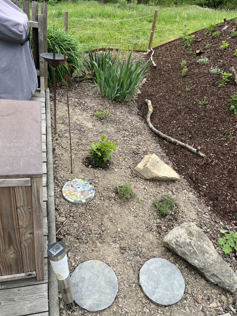 On the unplanted surface directly between the terrace and the slope, I’ll be planting dwarf lilacs. I was unfamiliar with this variety of lilacs and just kind of stumbled across it while doing an online search. Lilac is on my list of future plants for the upper part of the garden and while scrolling through one gardener website, I saw dwarf lilacs and thought “This will be perfect for next to the terrace!” Just imagine, you are sitting on the terrace enjoying the evening atmosphere and, as the cooler air comes down from the meadow, you catch whiffs of lilac … sounds wonderful, doesn’t it? I have already ordered the plants (14 of them!) and can’t wait to plant them. I’ll spread more mulch around them and then the area around and behind the terrace will be 90% finished.