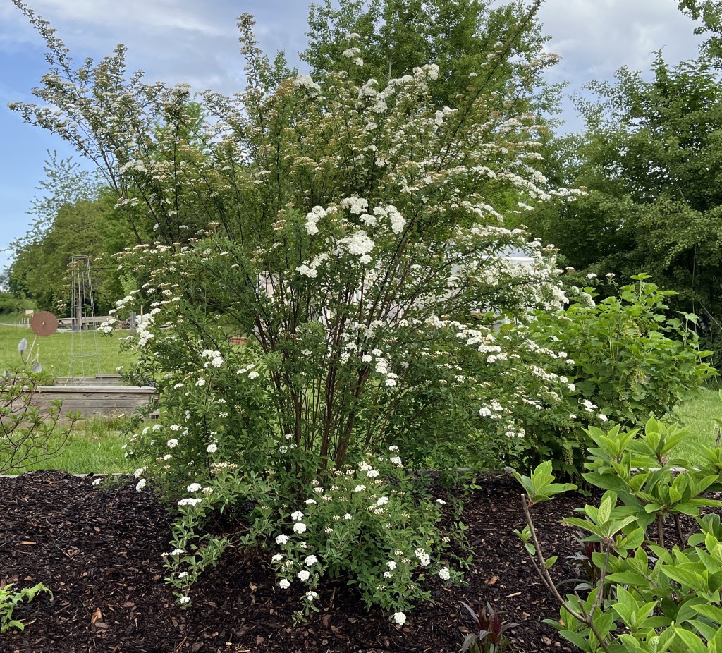 One of the plants we kept, was the Spiraea. It looked a little worse for wear after winter but has come back nicely. It’s falling cascade of white blossoms really stands out next to the brown mulch and the green meadow behind it.