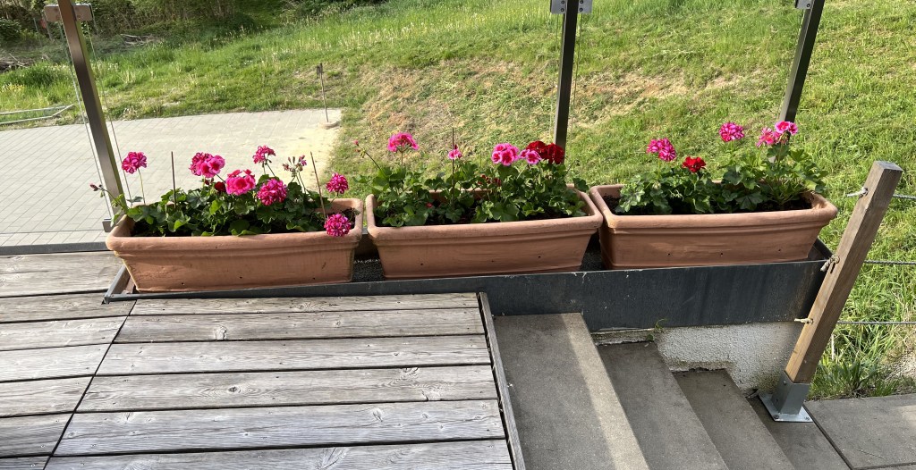 I went out and bought herbs and some geraniums for the terrace and planted them about 5 days ago. I was so pleased to find cilantro and lemon grass in the garden center! I planted them along with the other usual suspects. The basil is planted separately since it is such a thirsty herb. In the trough next to it, I planted parsley and scallions. In the square pot next to that is the Lovage plant my neighbor gave me. And, in the trough next to that I planted cilantro, thai basil, and lemon grass. The lemon grass is an experiment. I saw a youtube video years ago about how you can grow your own lemon grass and we’ll see how it goes this year. And, no house in Bavaria is complete without Geraniums! Thankfully, the three flower boxes we brought with us fit perfectly in the metal box next to the steps. A nice splash of color as you look up at the house and the hill behind it.
